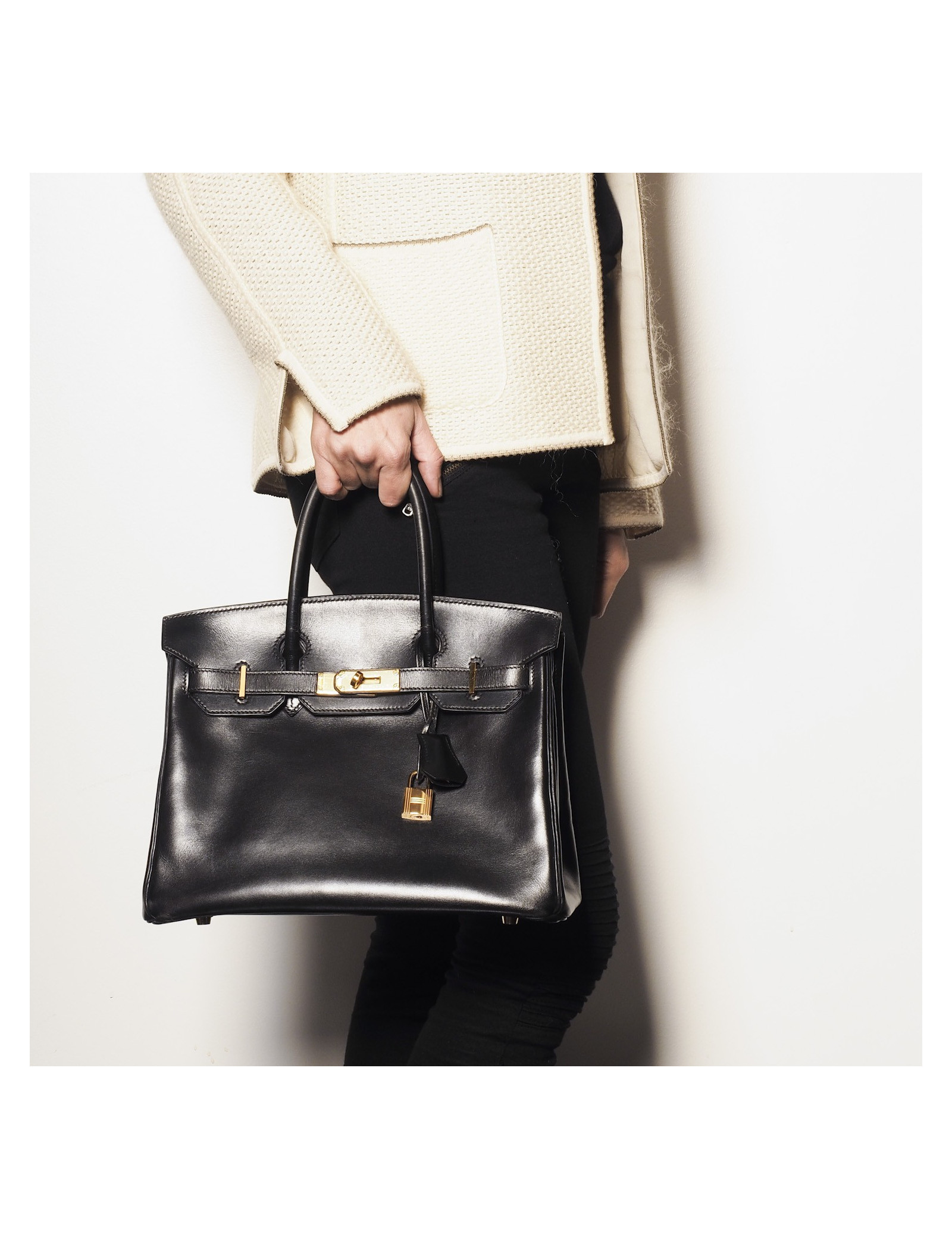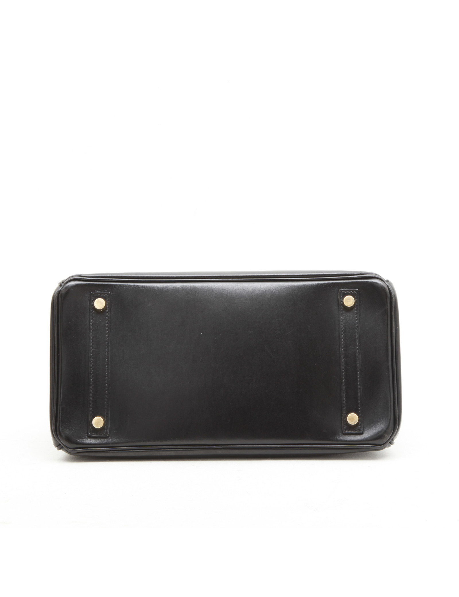 Sac Birkin 30 Hermès en cuir box noir. Bijouterie dorée (Les plastiques sont présents). Clochette, tirette, clefs et cadenas. Lettre E dans un carré Année 2001. Made in France. En très bon état, malgré légère usure des coins sous le sac, et petites marques sur l'ensemble du sac et sur les poignets.