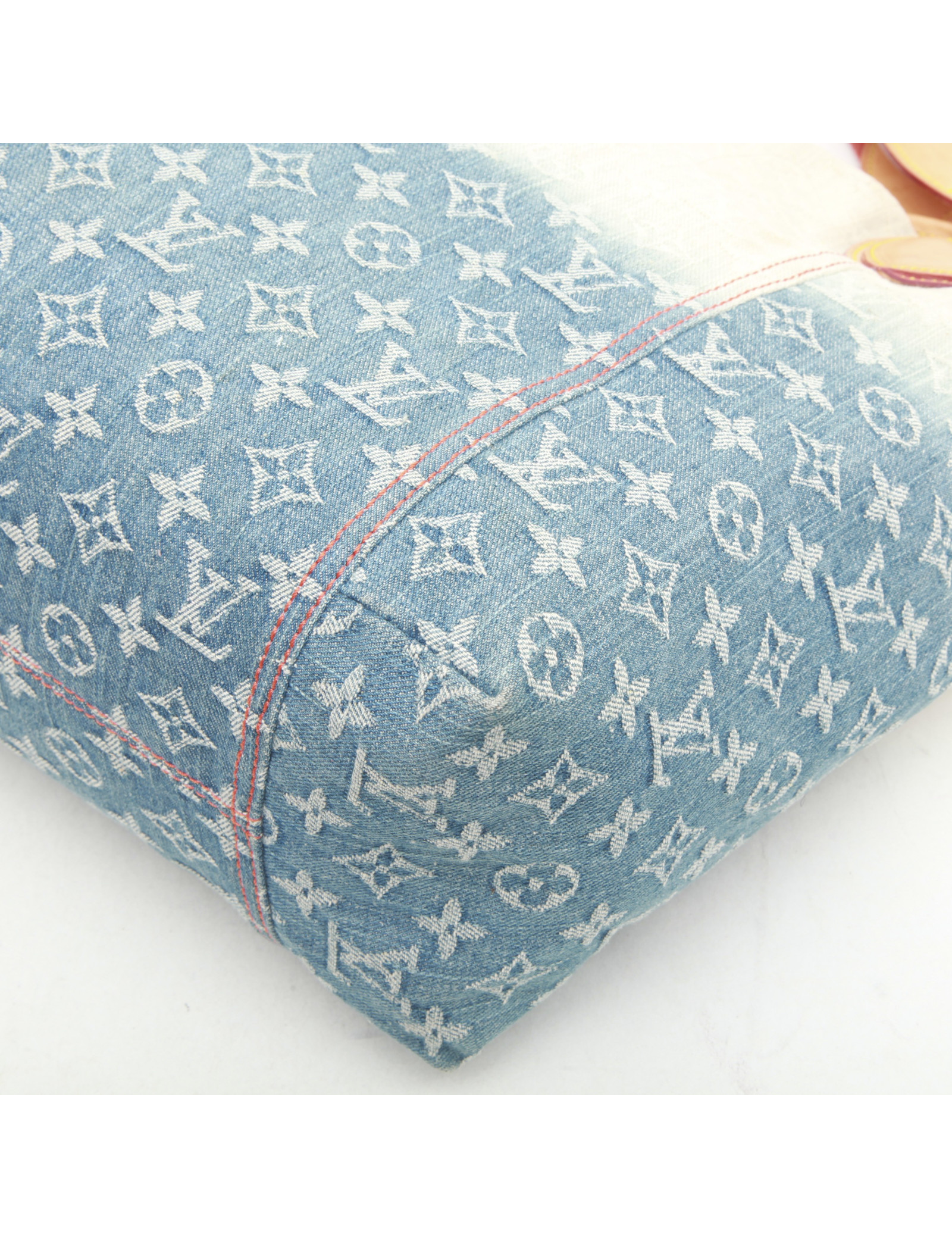 Collector. Sac cabas Louis Vuitton en tissu monogram bicolore dégradé de bleu à beige. Bijouterie dorée. Porté épaule à l'aide de 2 anses en cuir de vachette naturel et tissu rouge orangé siglé L V. L'intérieur est en toile plastifiée bleu ciel.