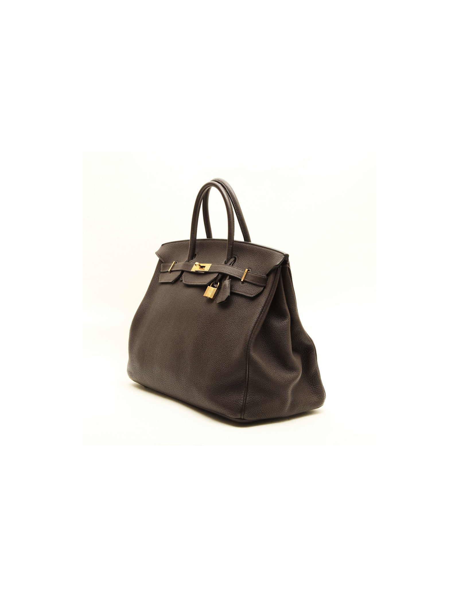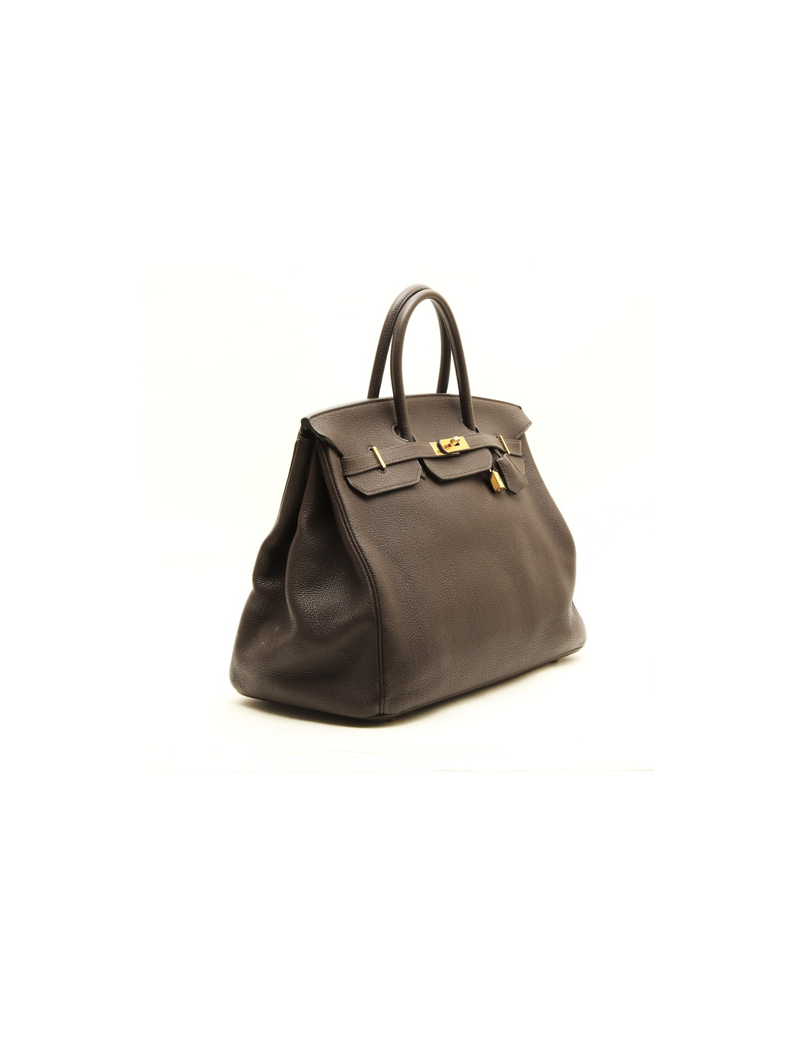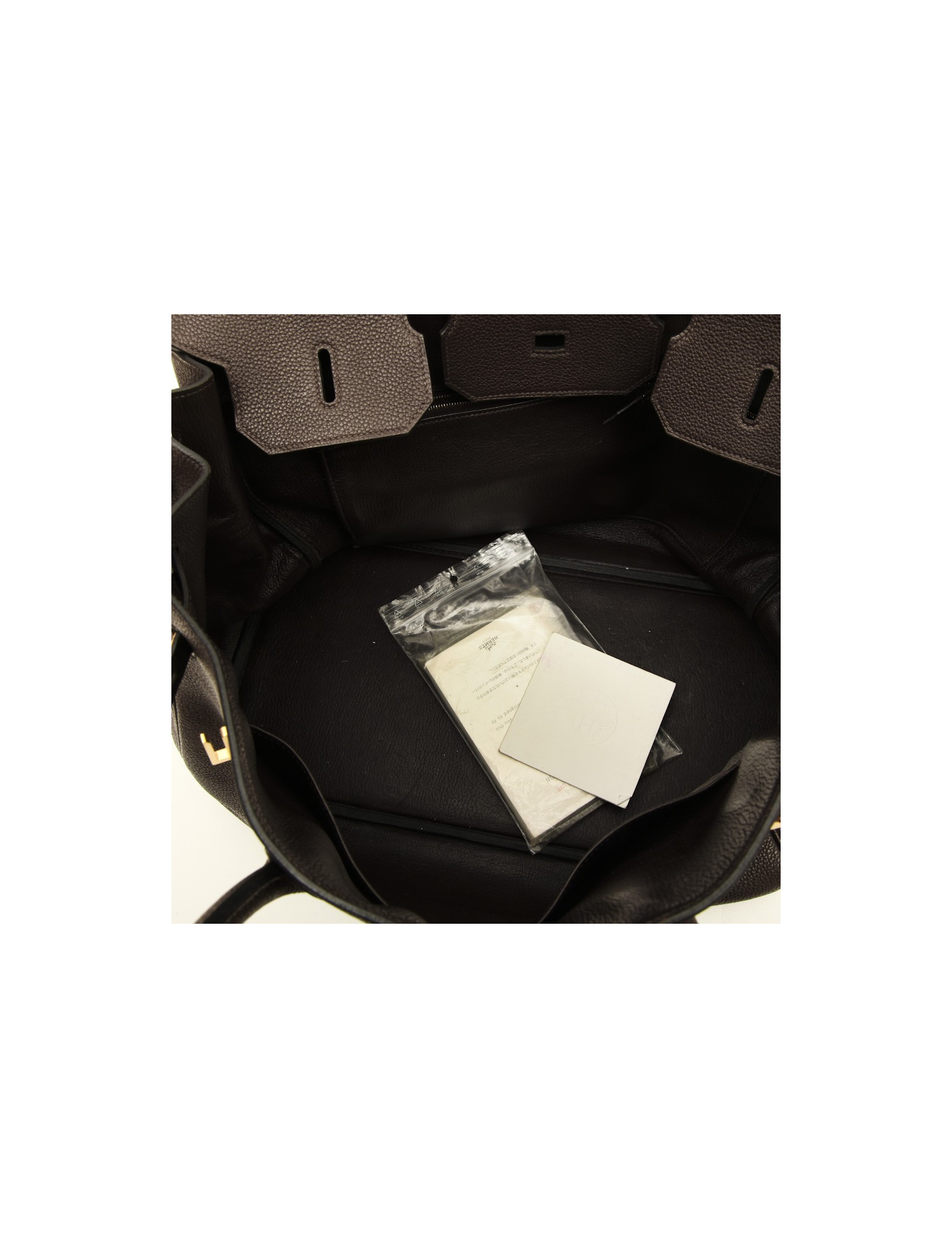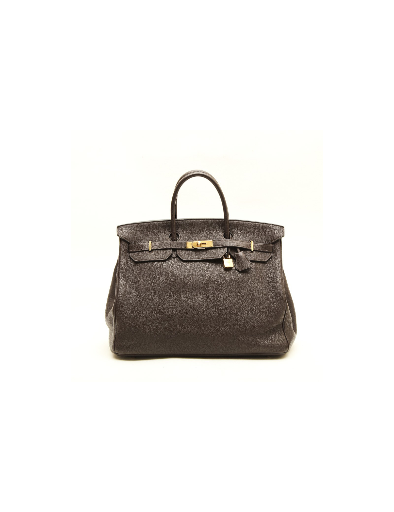 Birkin 40 Hermès en taurillon clémence marron. Bijouterie dorée. Made in France. Tirette, clochette, clefs et cadenas.
