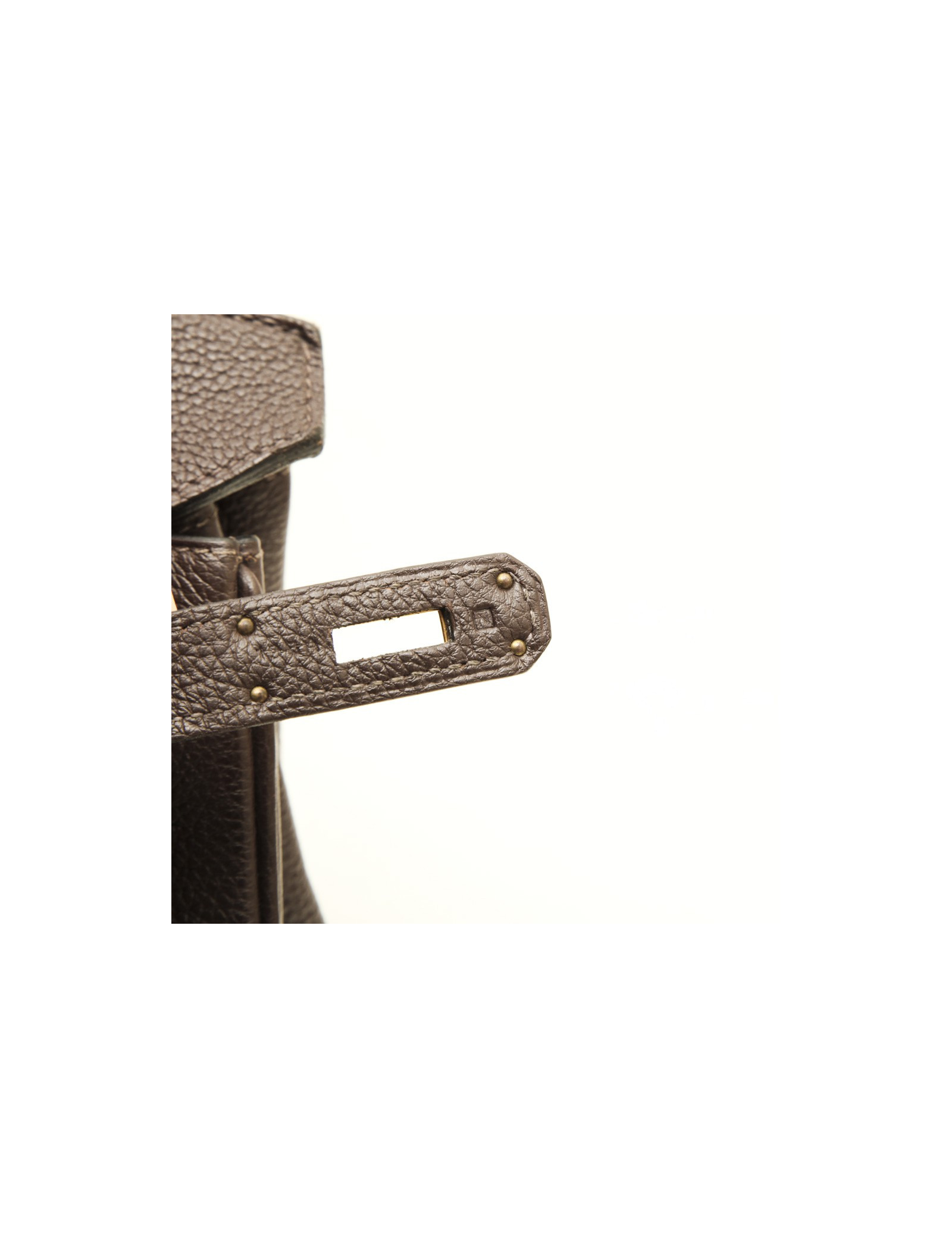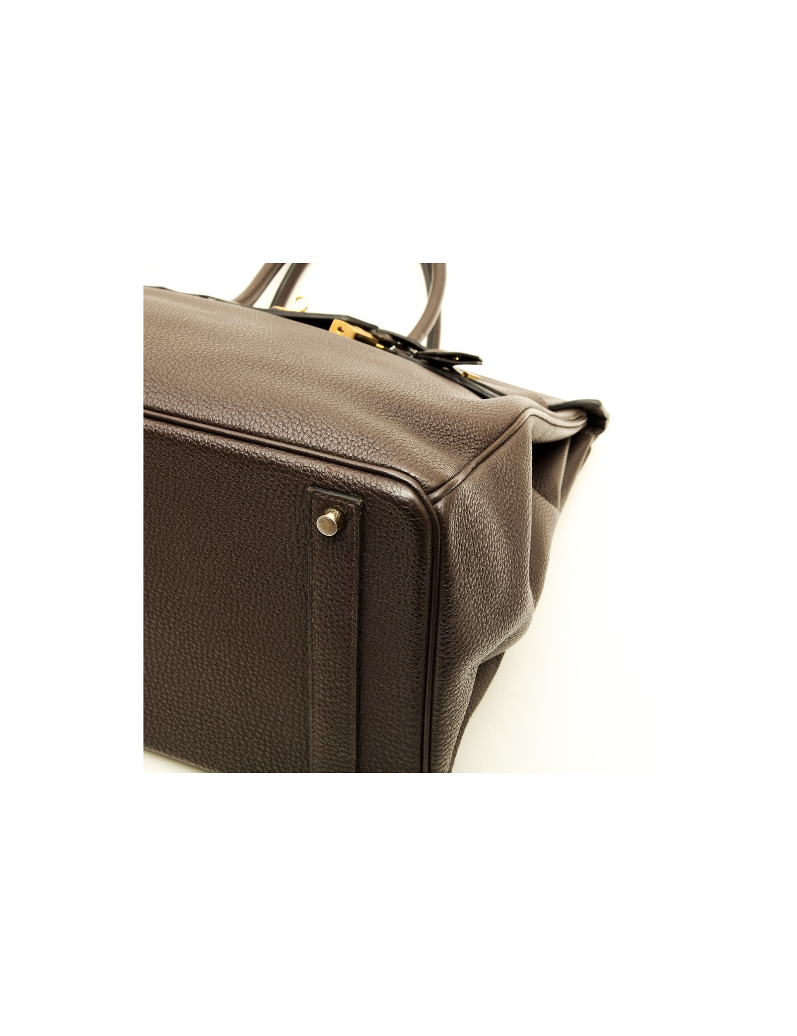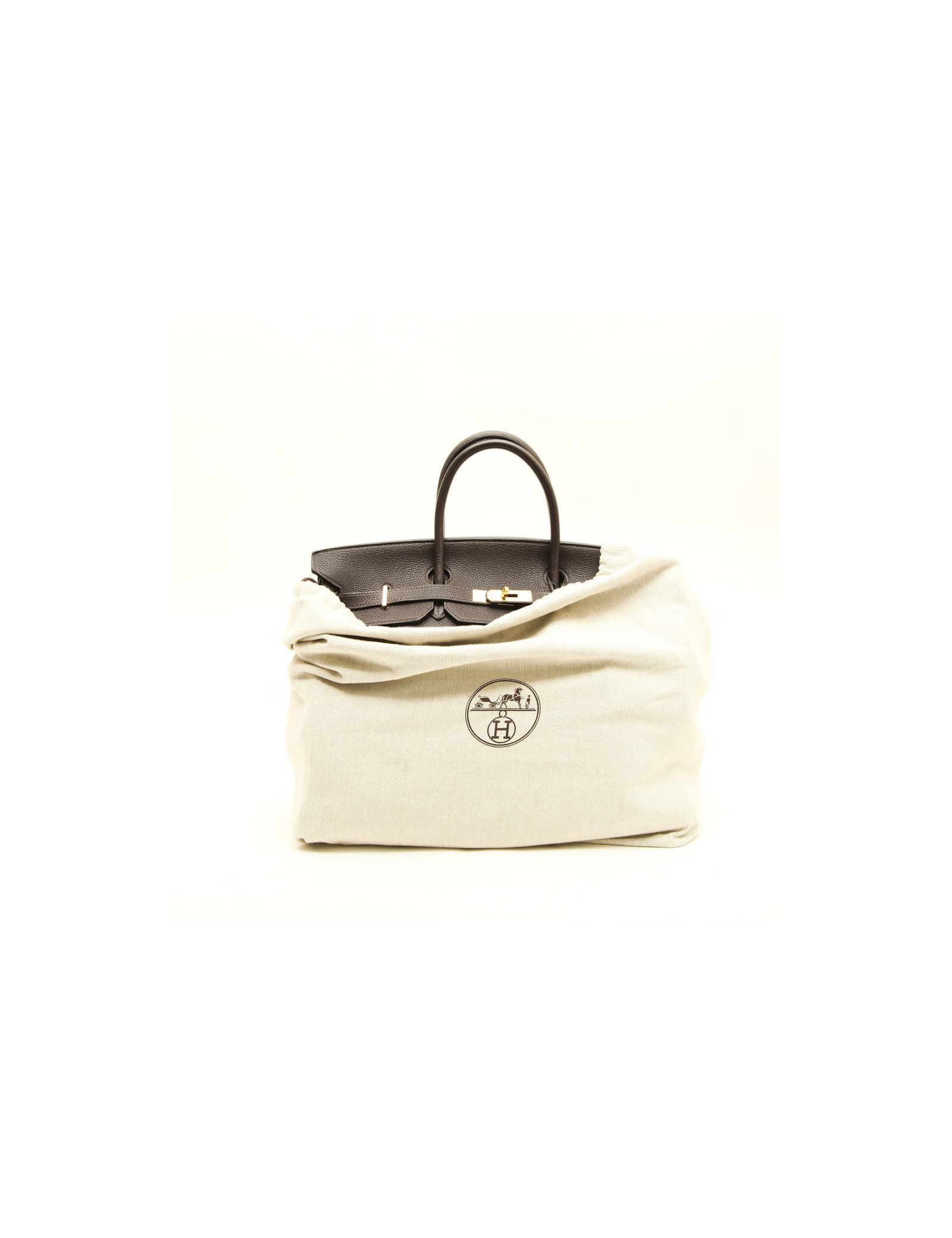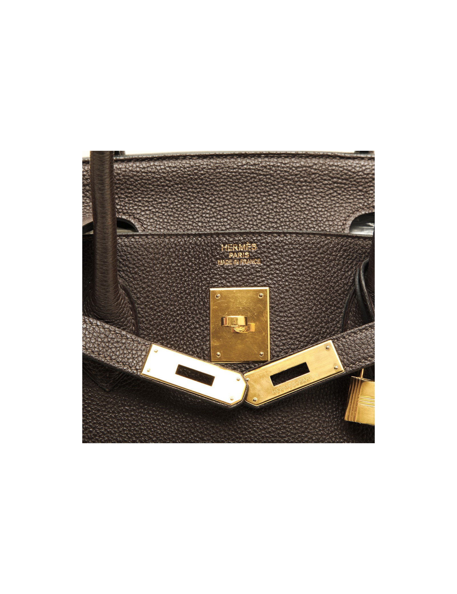 Birkin 40 Hermès en taurillon clémence marron. Bijouterie dorée. Made in France. Tirette, clochette, clefs et cadenas.