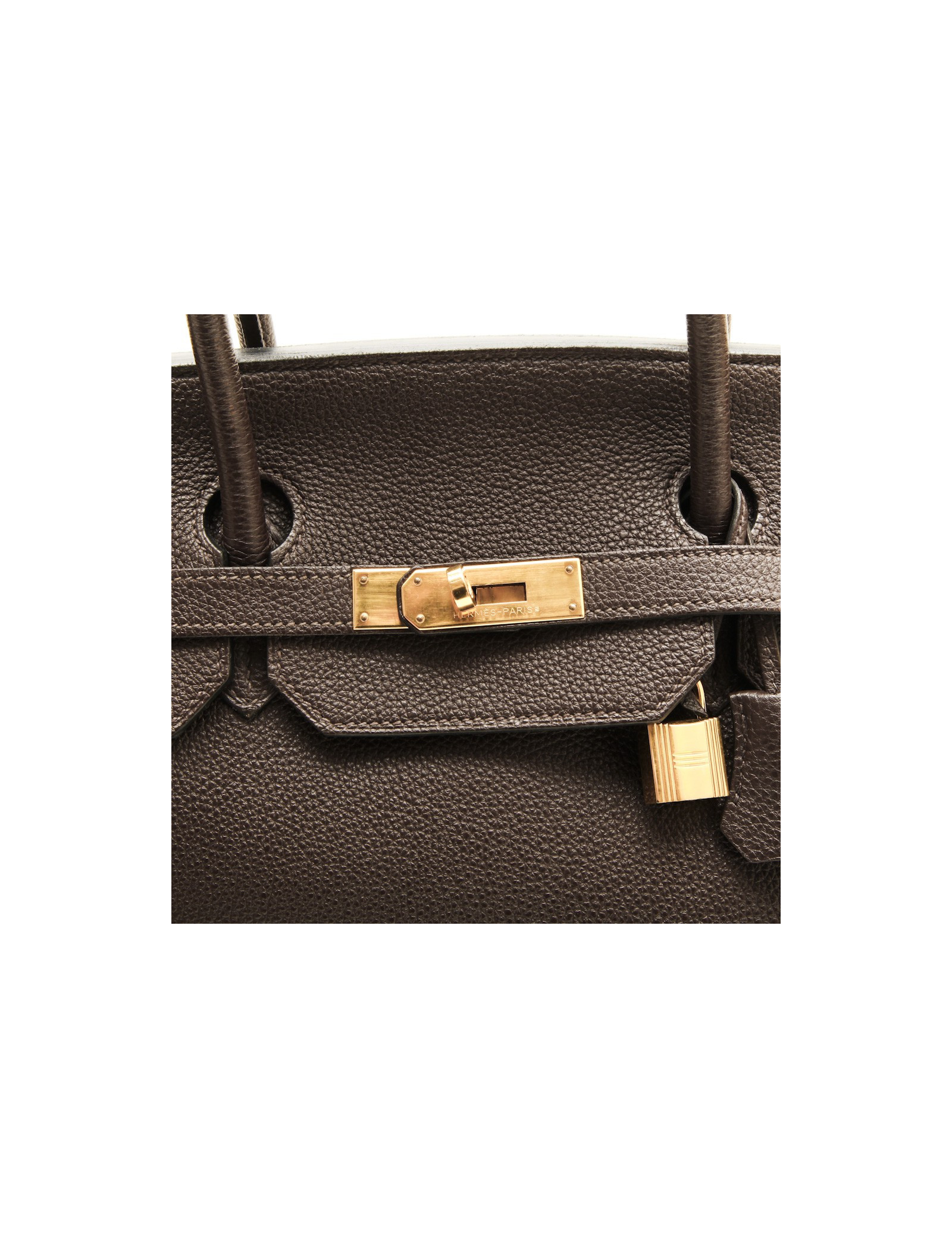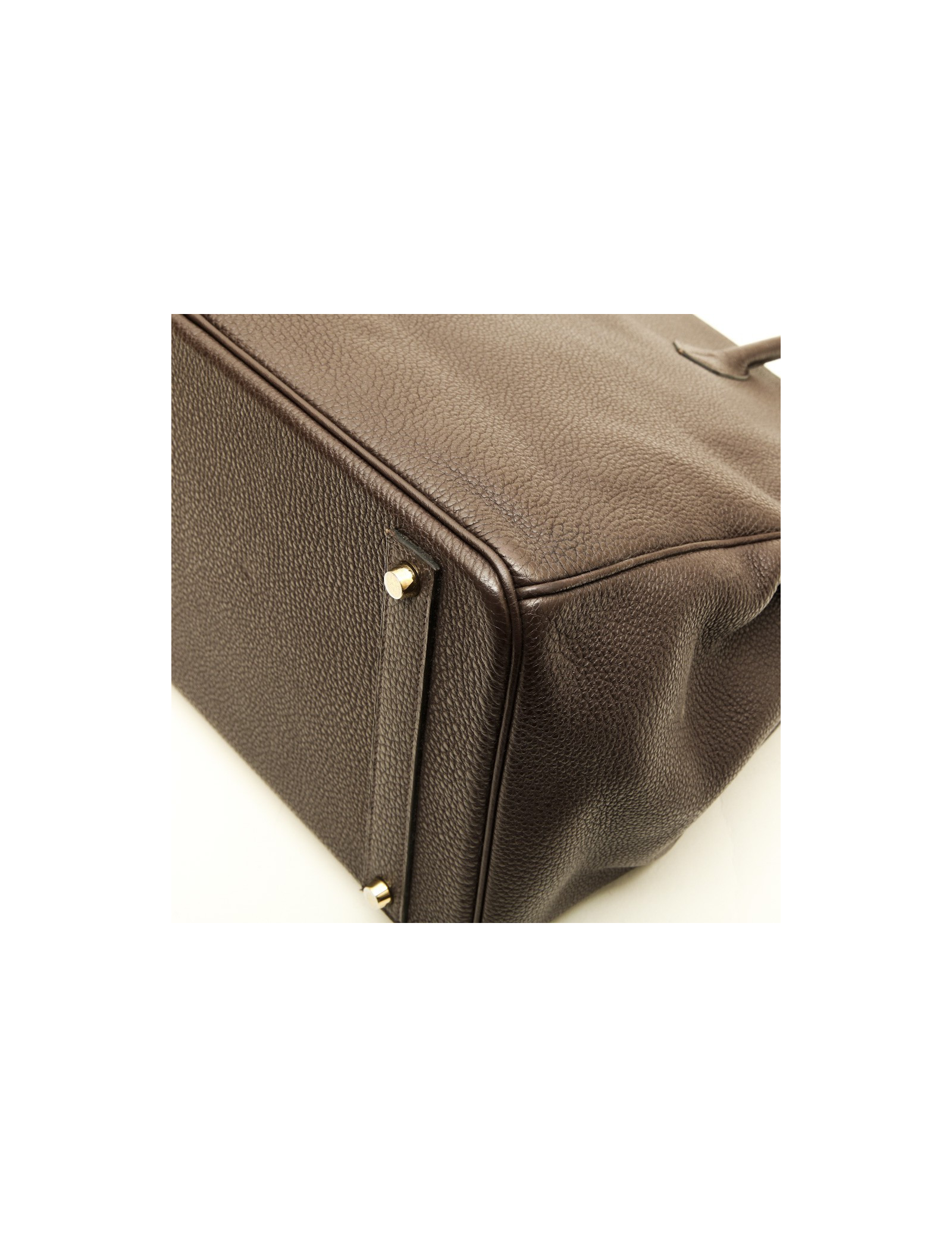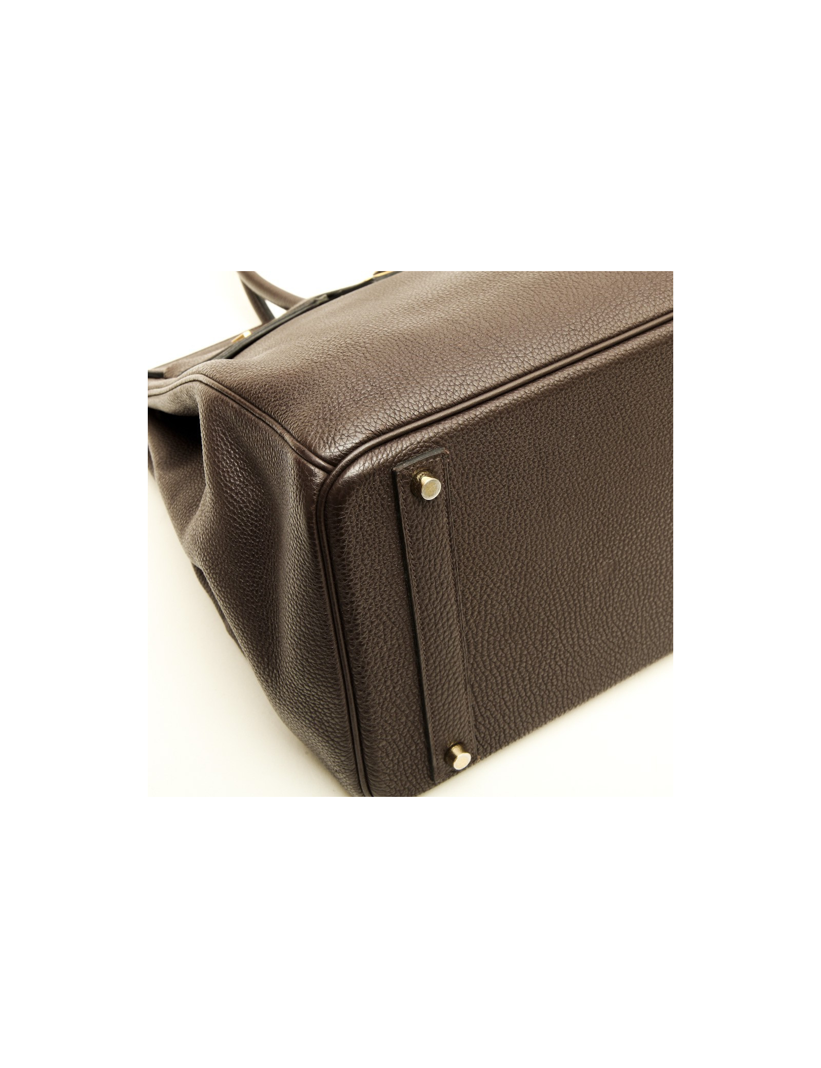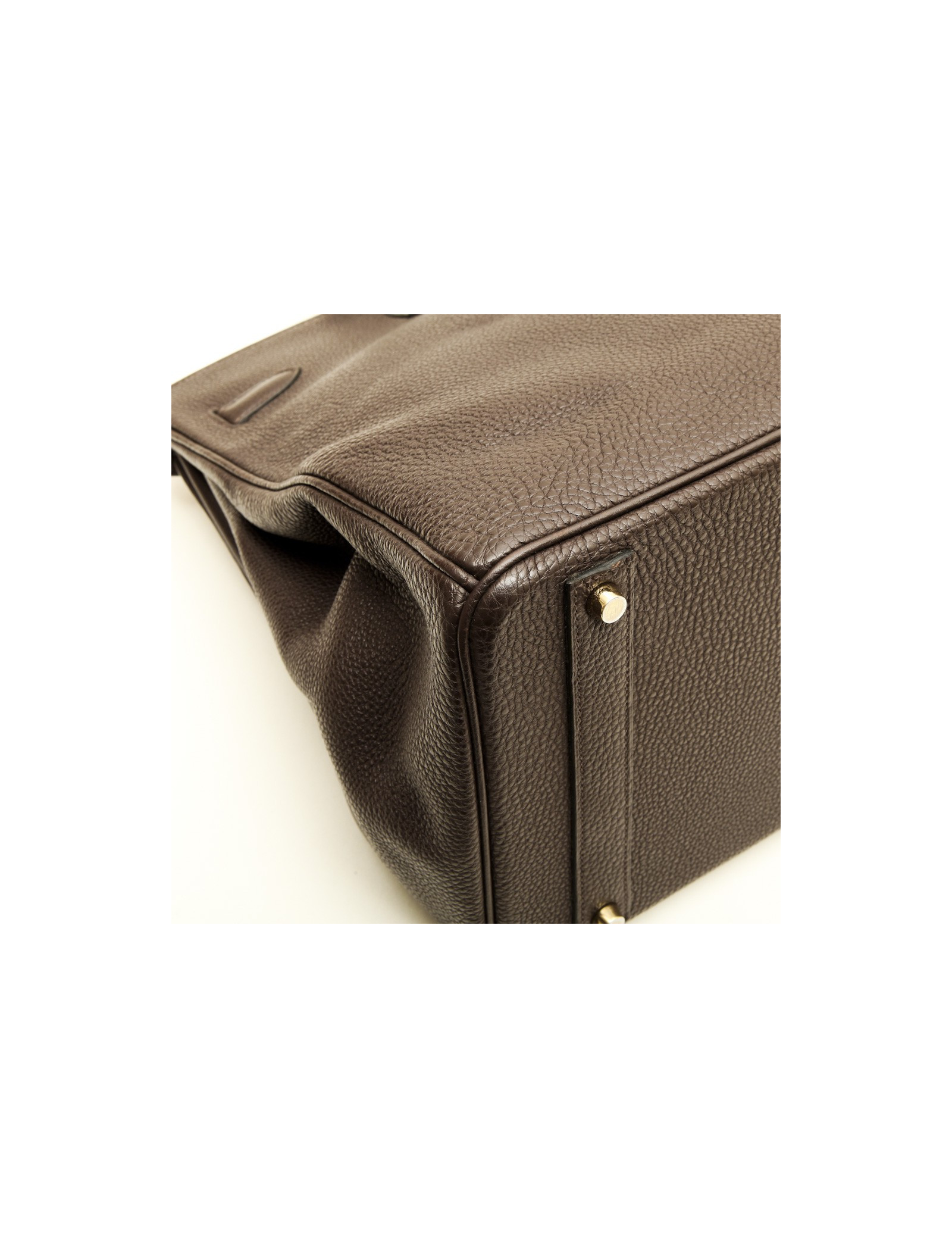 Birkin 40 Hermès en taurillon clémence marron. Bijouterie dorée. Made in France. Tirette, clochette, clefs et cadenas.