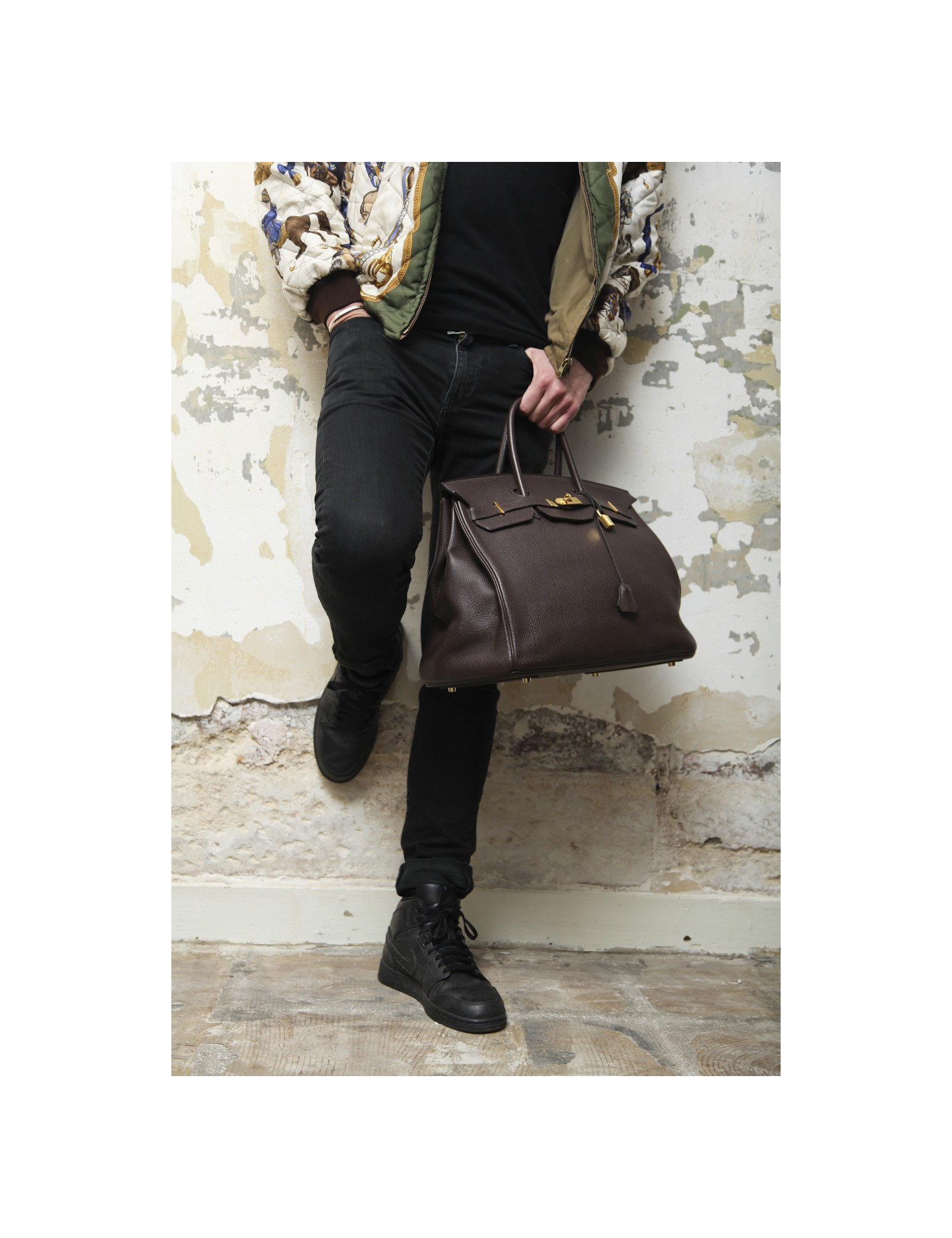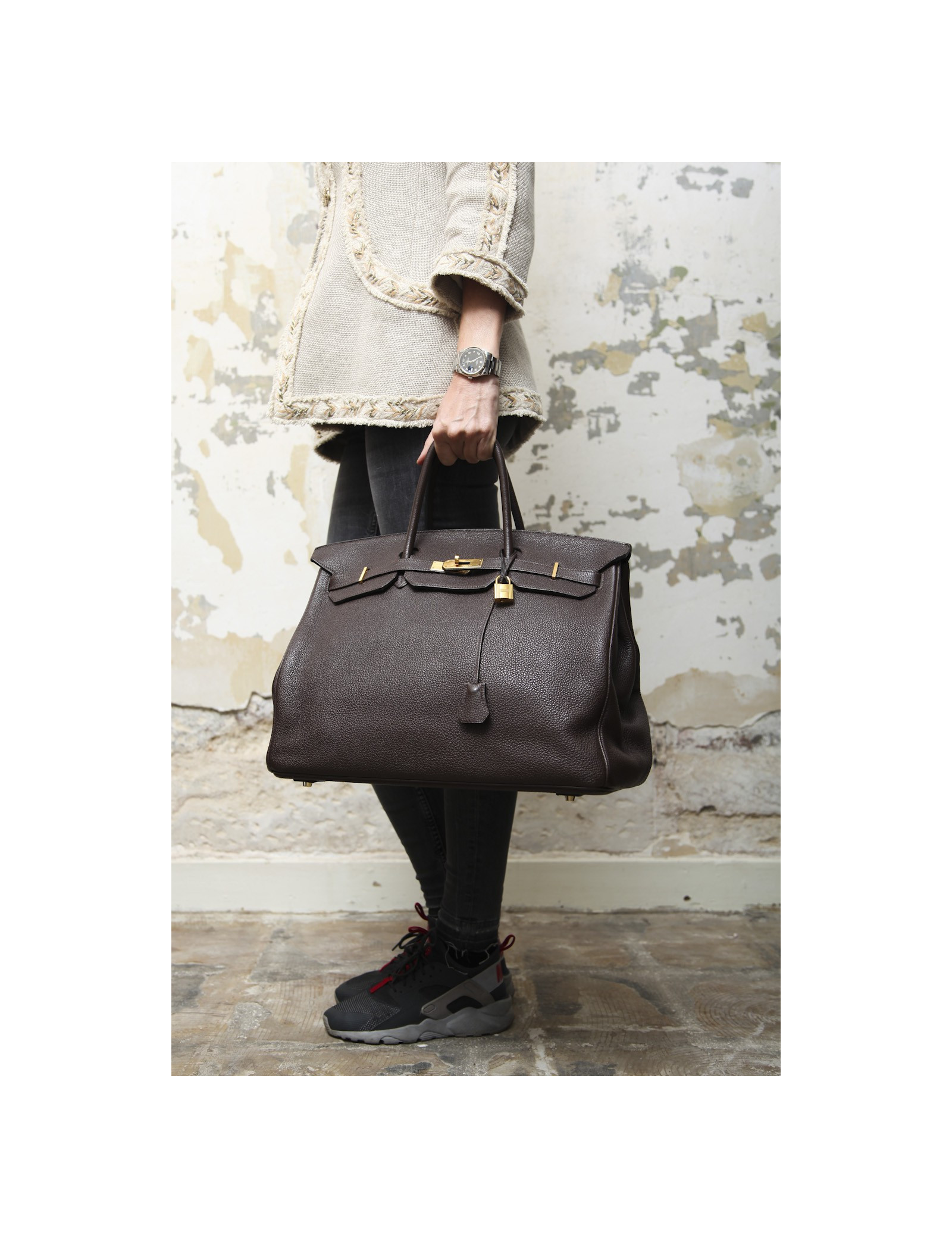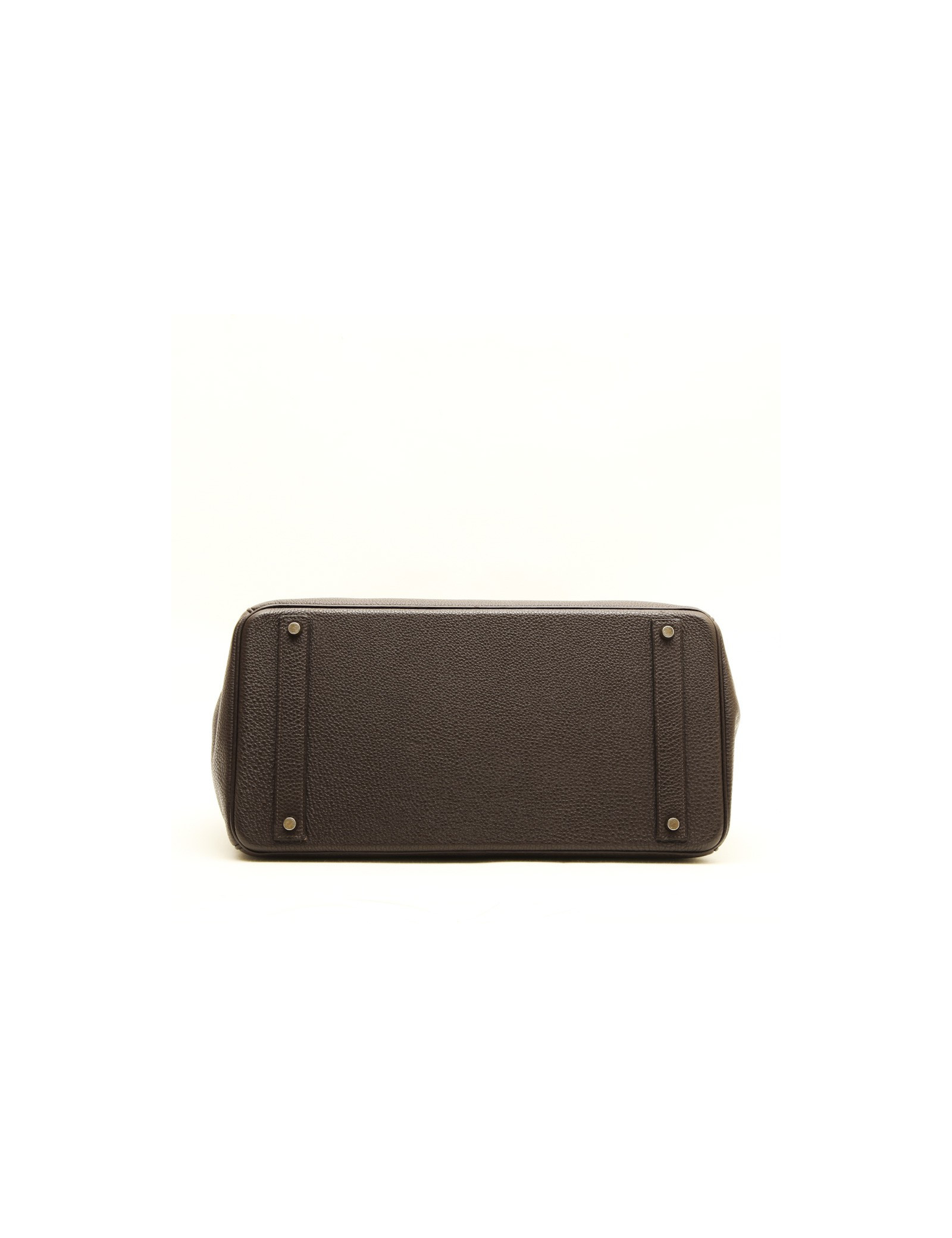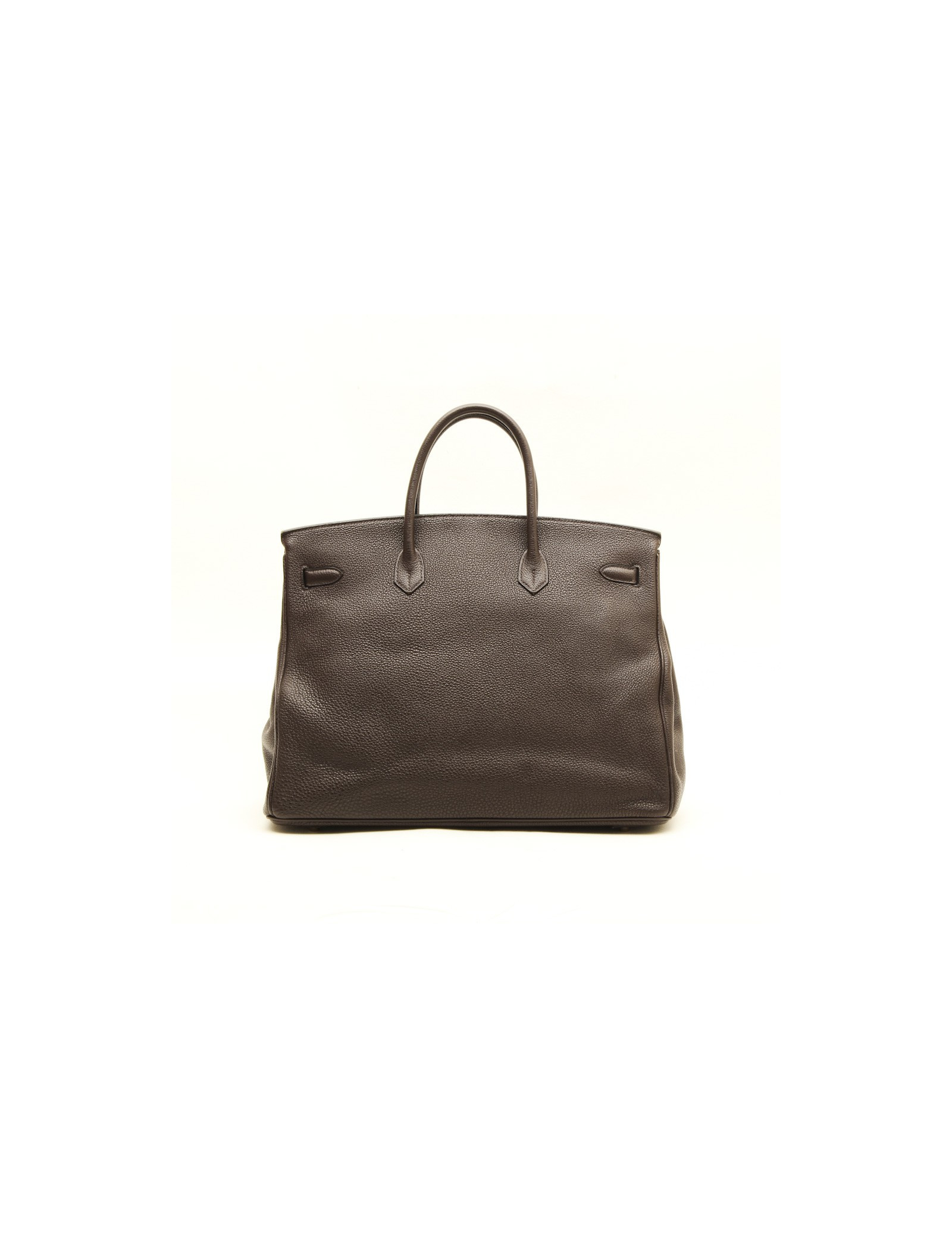 Birkin 40 Hermès en taurillon clémence marron. Bijouterie dorée. Made in France. Tirette, clochette, clefs et cadenas.