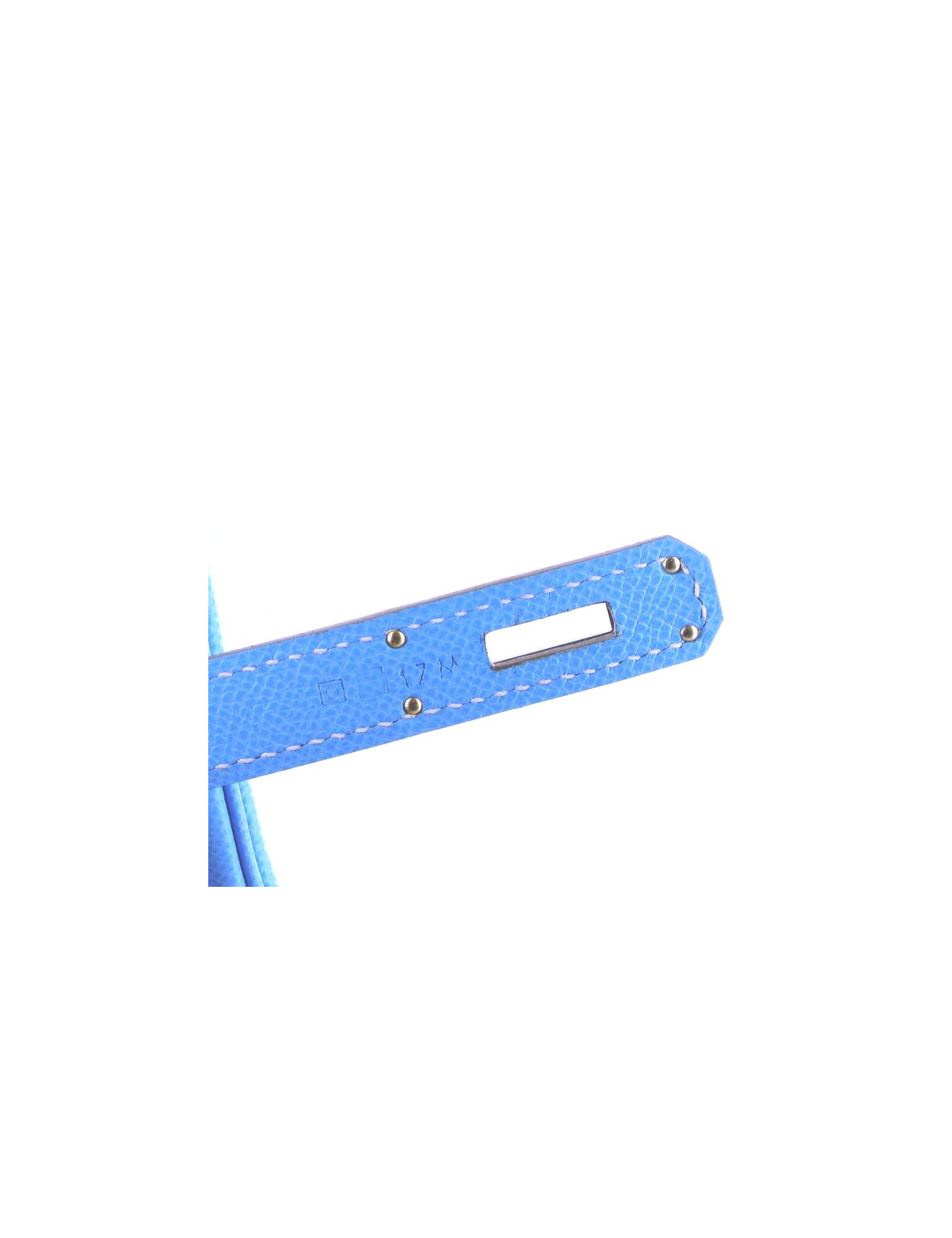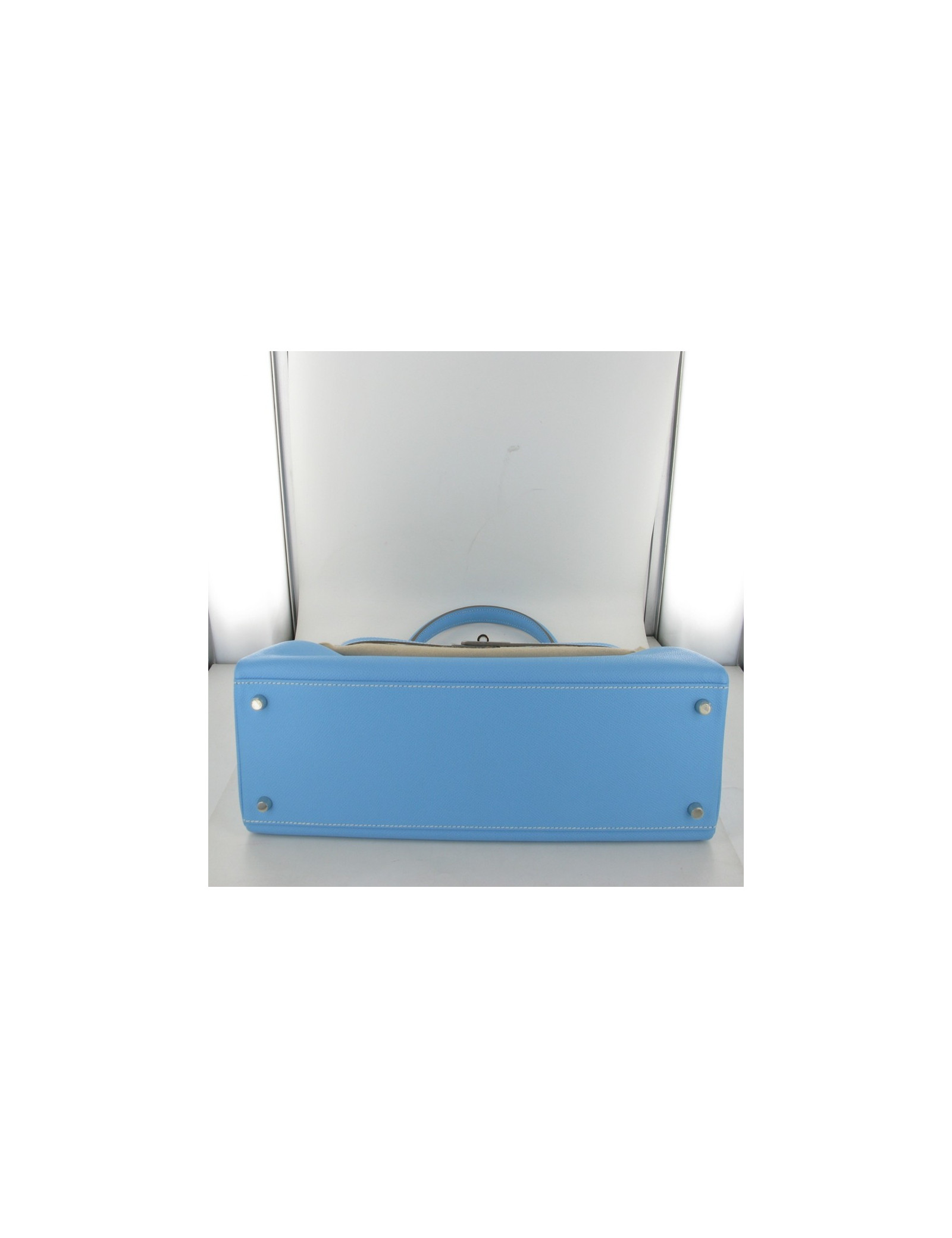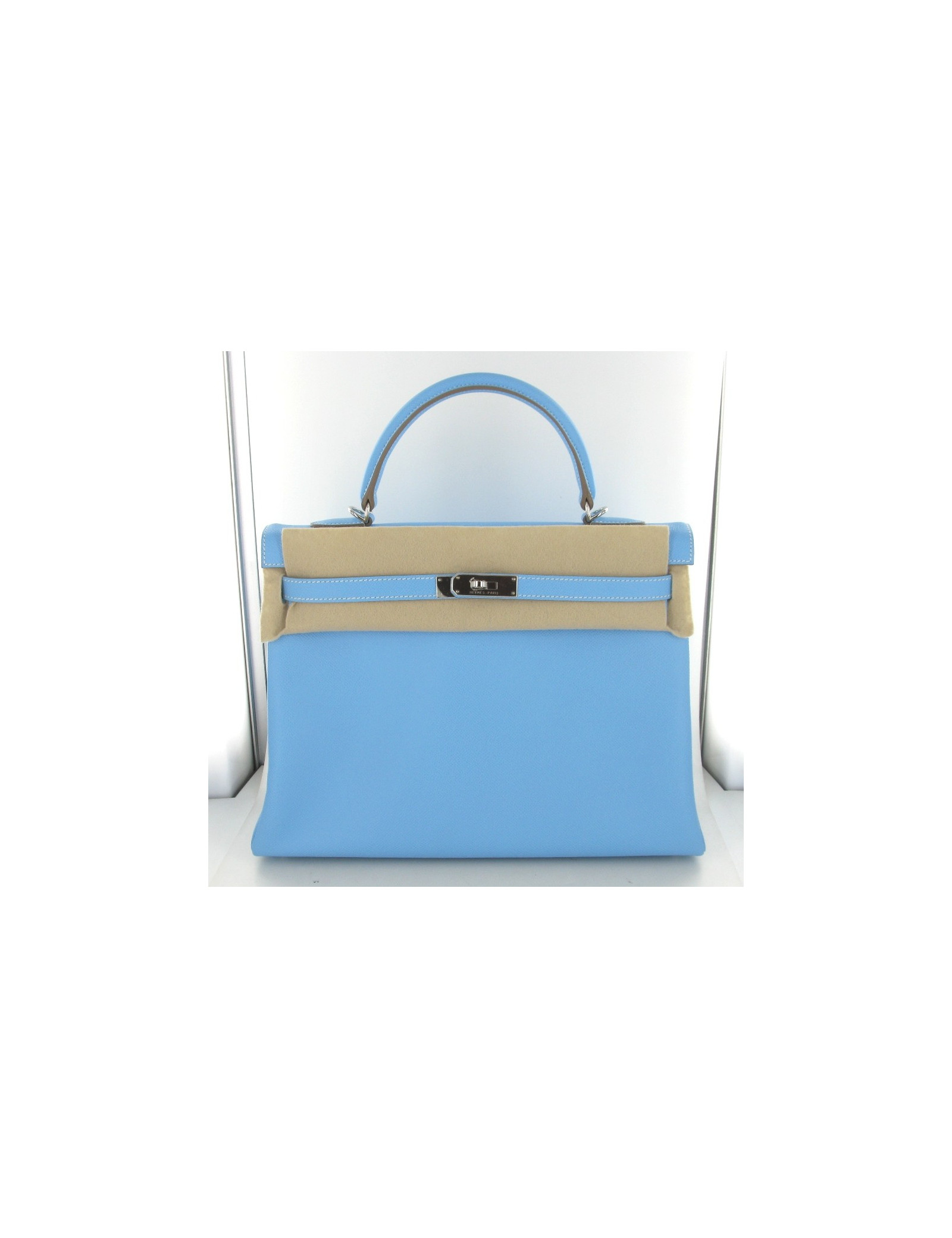 Incontournable Kelly 35 HERMES en cuir epsom bleu ciel. La bijouterie est argent palladié. Il est livré avec sa bandoulière amovible, ses clés et son cadenas ainsi que son dustbag. Lettre O