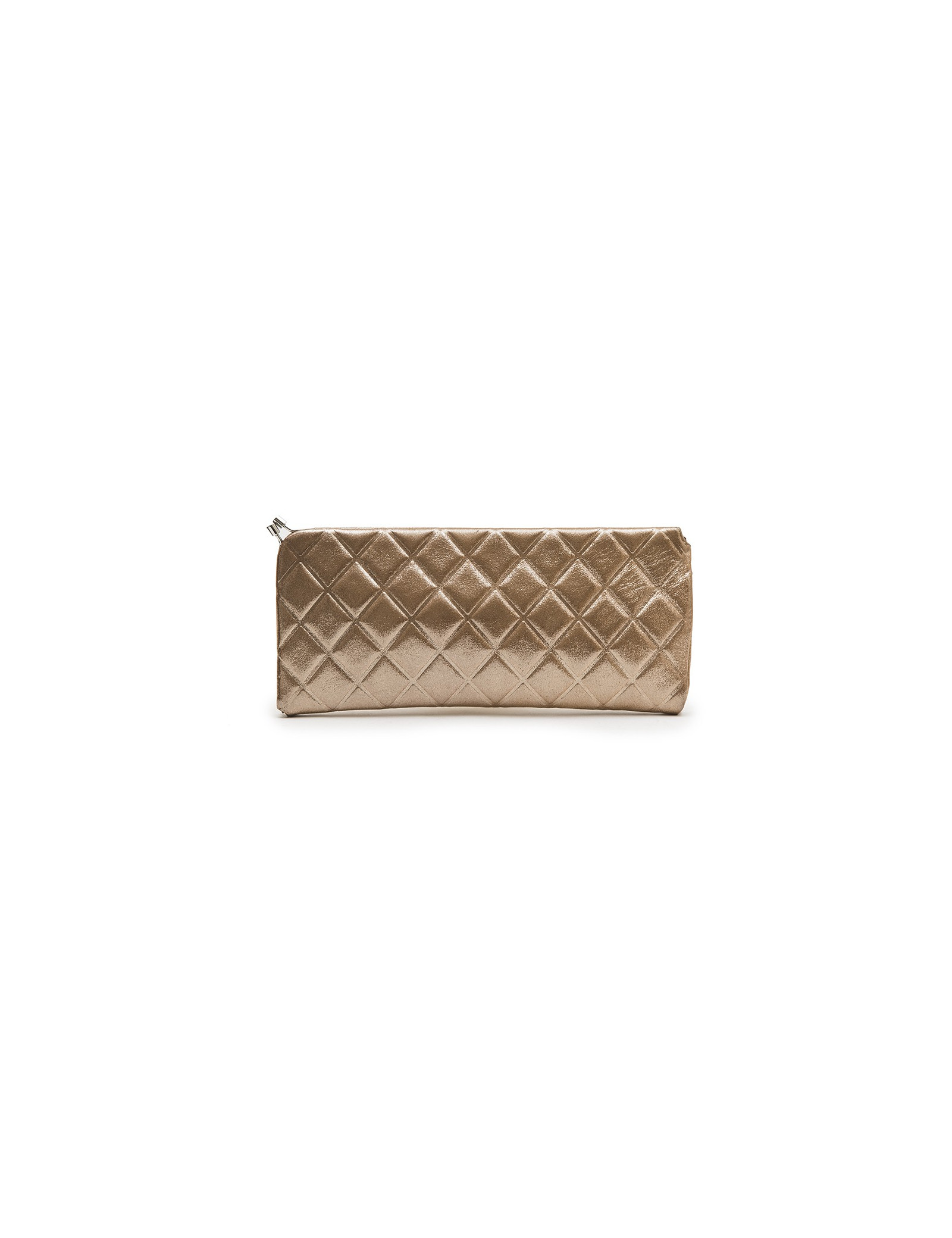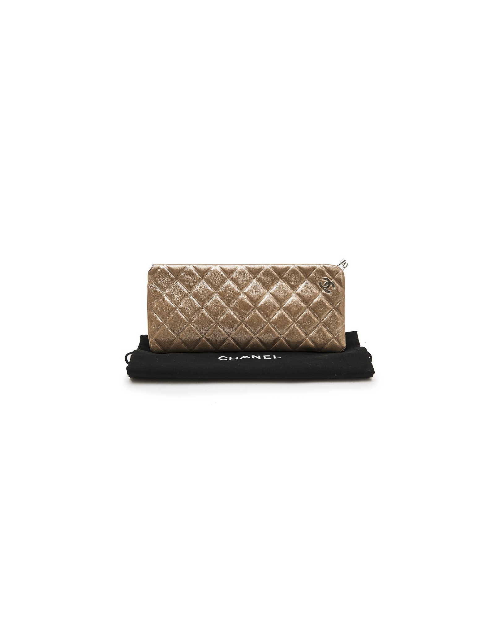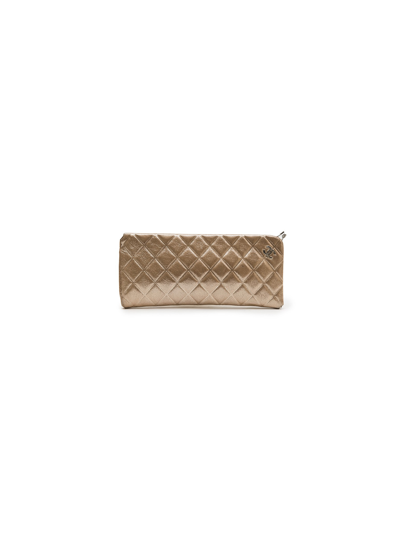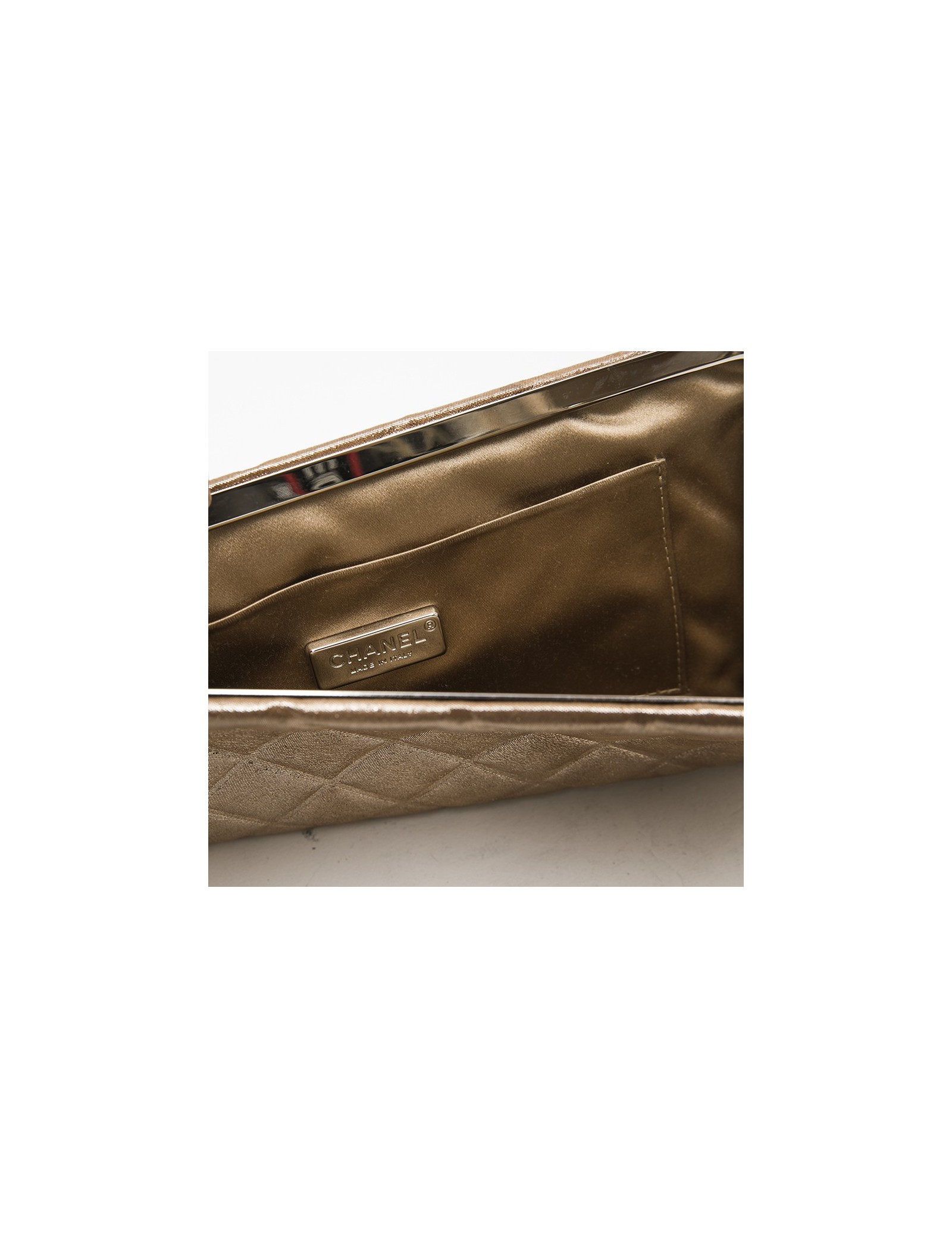 Pochette Chanel du soir en cuir lamé or irisé. Bijouterie argentée. L'intérieur est en satin avec poche. Pochette de défilé sans hologramme ni carte.