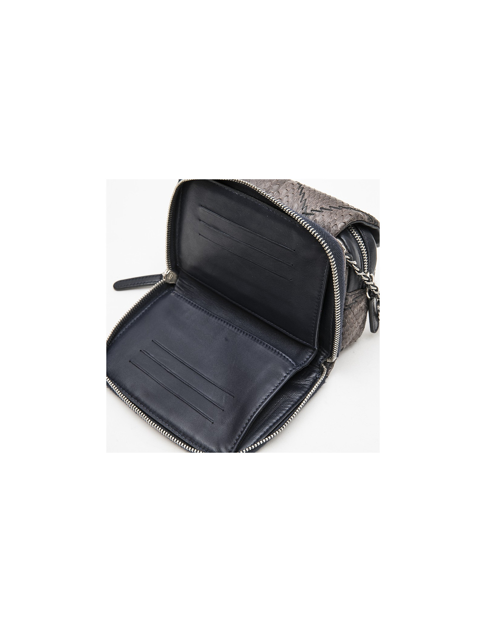 Mini sac Chanel, en serpent d'eau douce gris. En très bon état. Il est matelassé. Accastillage métal argent palladié. A l'avant un rabat doublé en cuir et intérieur en satin se refermant par un zip. A l'arrière un portefeuille zippé avec 6 fentes pour cartes diverses et une fente pour billets.