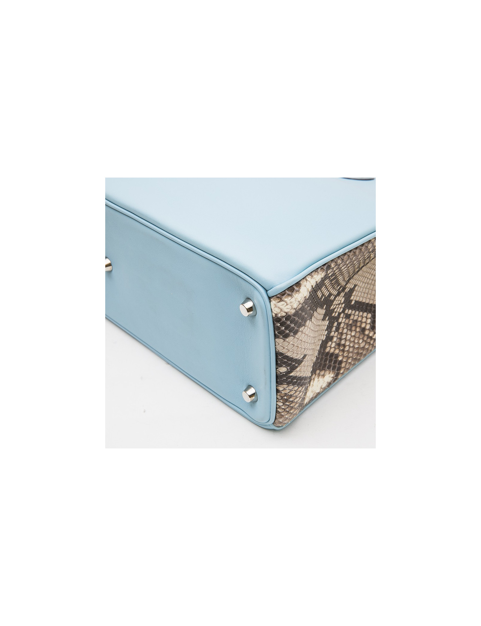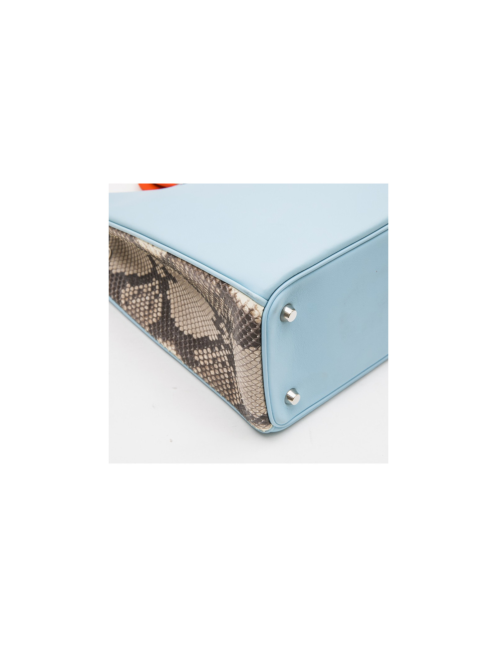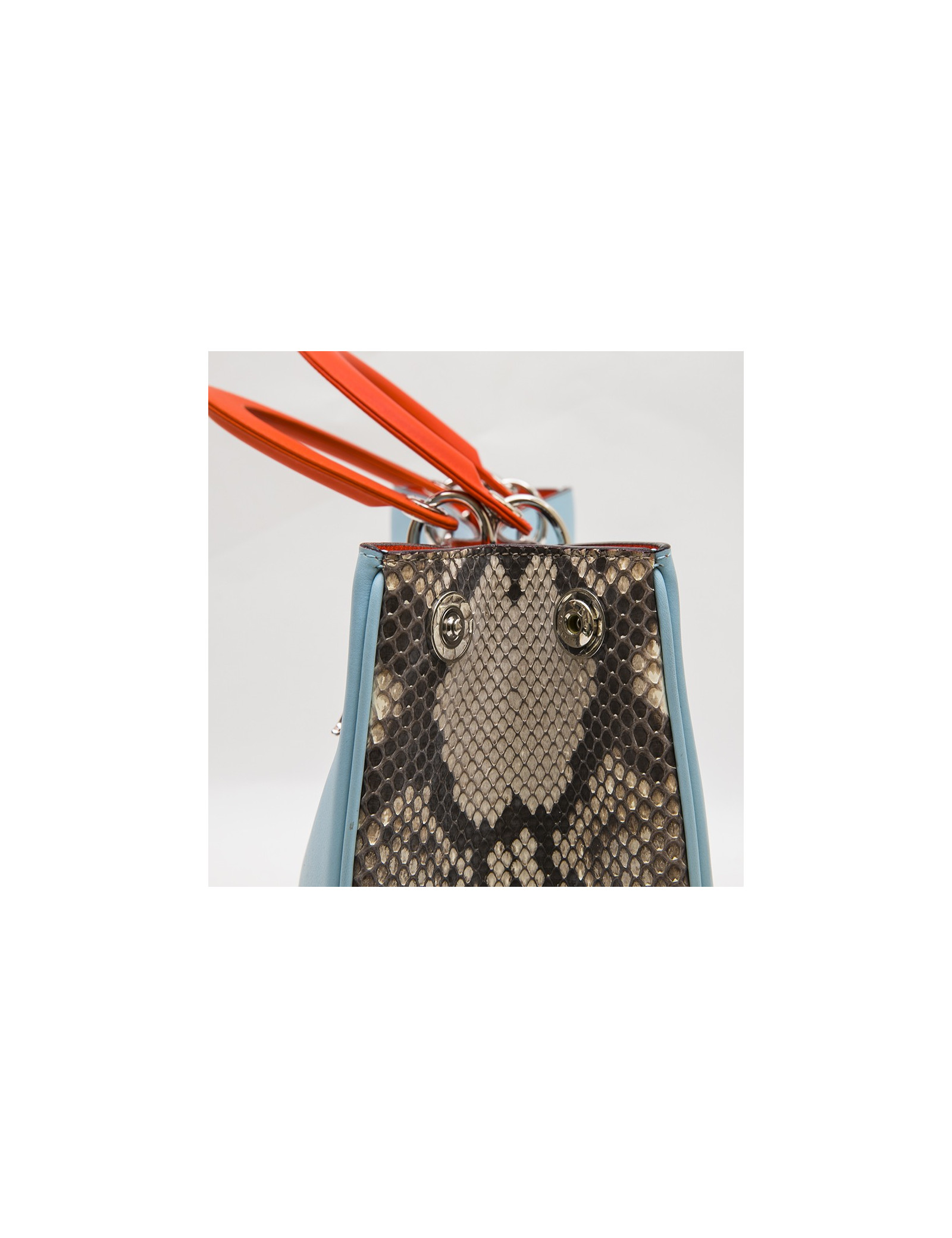 Sac 'Lady Dior' Christian Dior en cuir bleu ciel et python gris. Bijouterie argent palladié. Fermeture par bouton pression. Il y a une pochette en cuir orange dans le sac. L'intérieur et les poignées sont en cuir orange. Numéro de série : MO901... et sa carte d'authenticité. Porté à la main ou à l'épaule à l'aide d'une bandoulière amovible. Etat neuf.