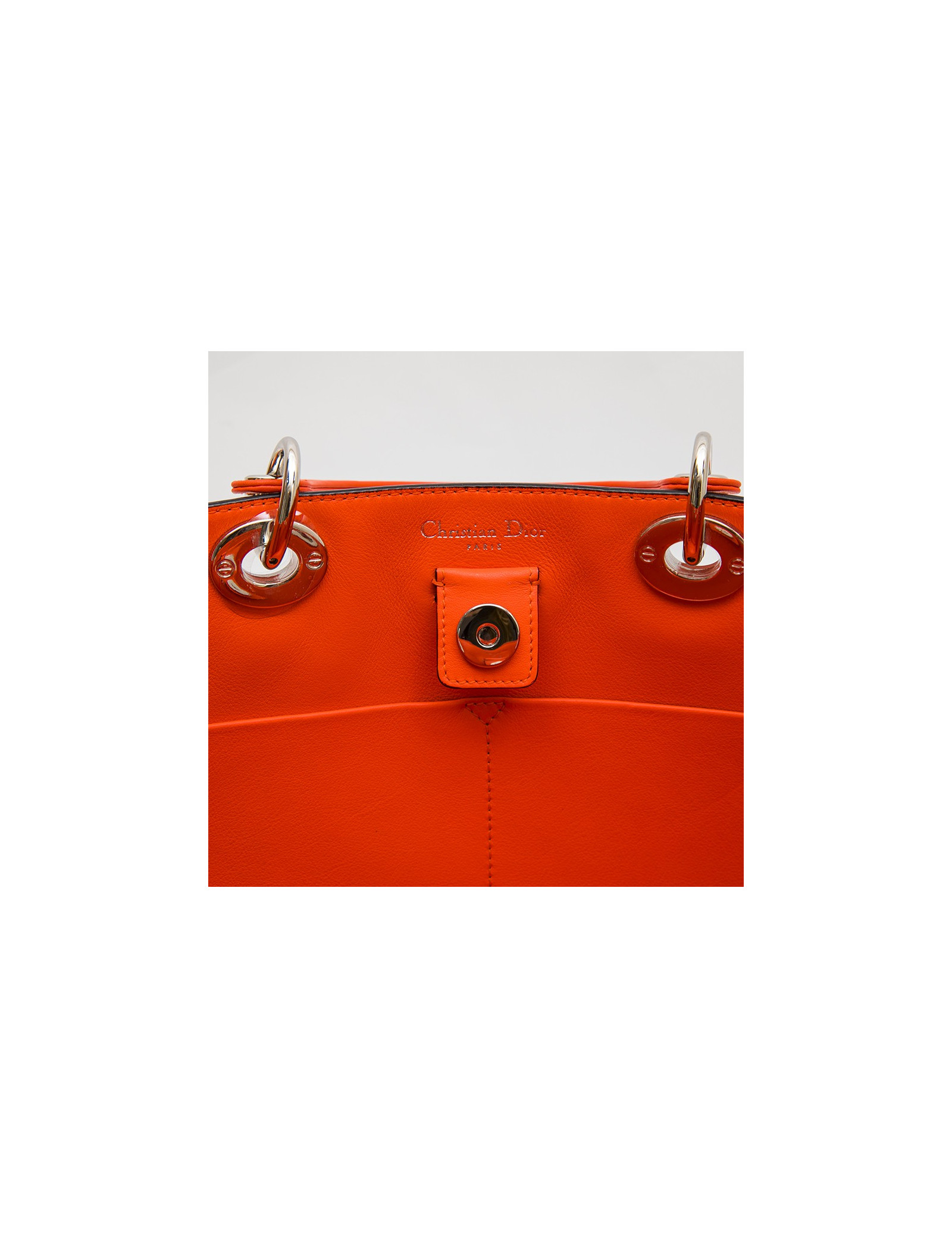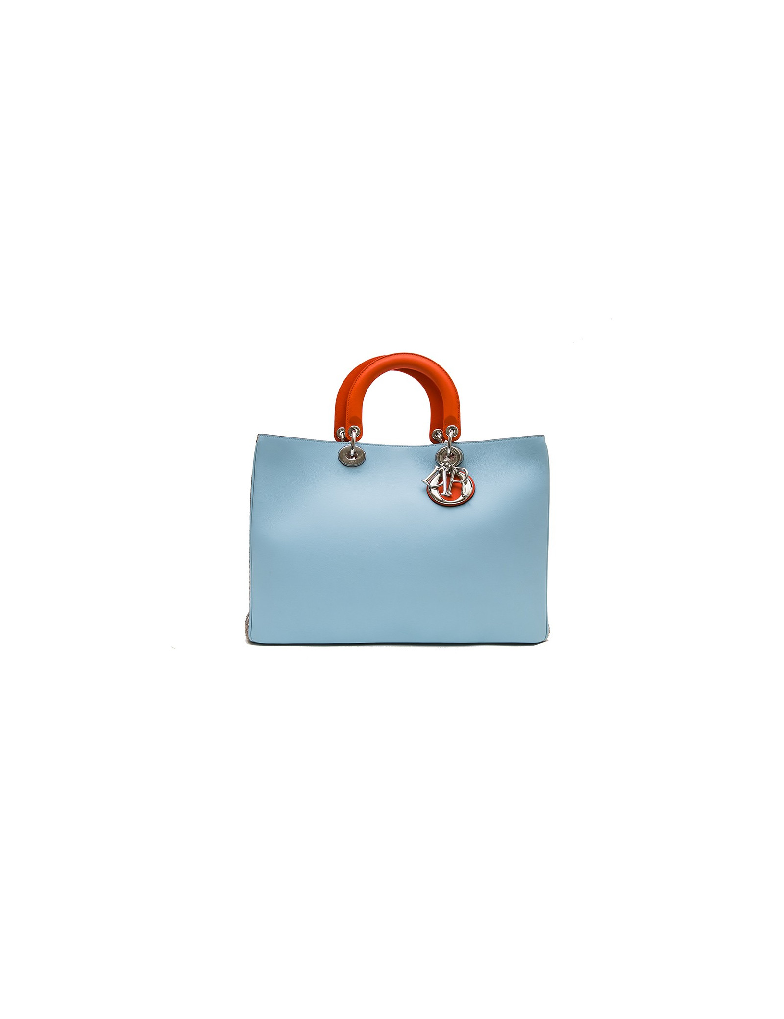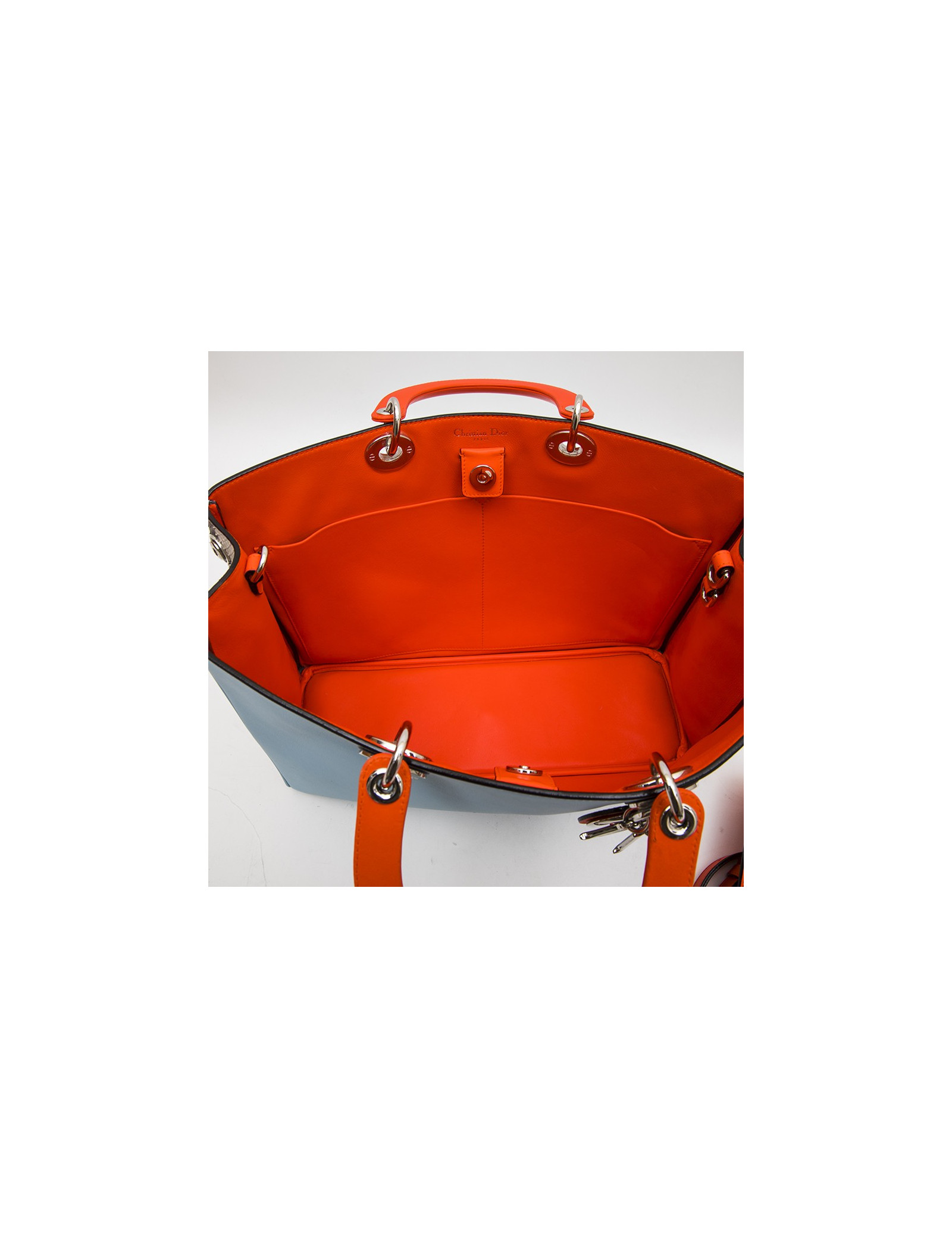 Sac 'Lady Dior' Christian Dior en cuir bleu ciel et python gris. Bijouterie argent palladié. Fermeture par bouton pression. Il y a une pochette en cuir orange dans le sac. L'intérieur et les poignées sont en cuir orange. Numéro de série : MO901... et sa carte d'authenticité. Porté à la main ou à l'épaule à l'aide d'une bandoulière amovible. Etat neuf.
