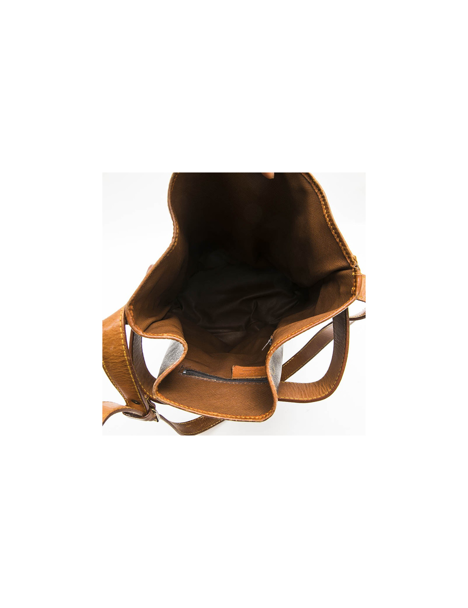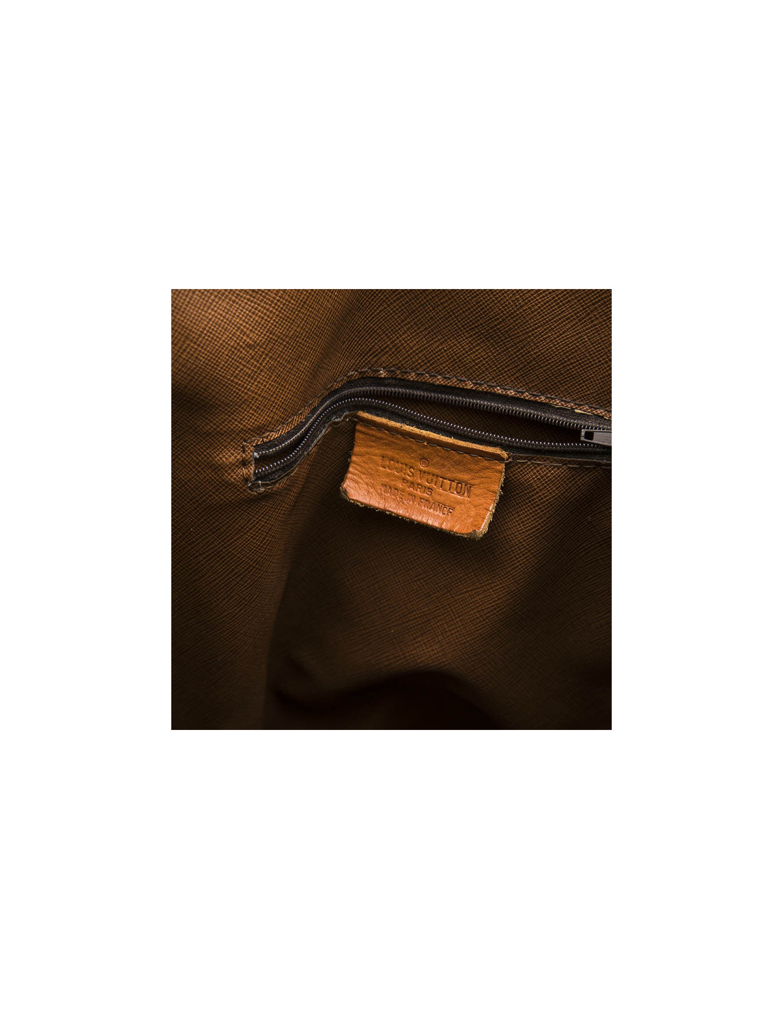 Fermeture par bouton pression. Made in France. Etat vintage. Le cuir est patiné. Petite déchirure à un endroit sur le bord du sac.