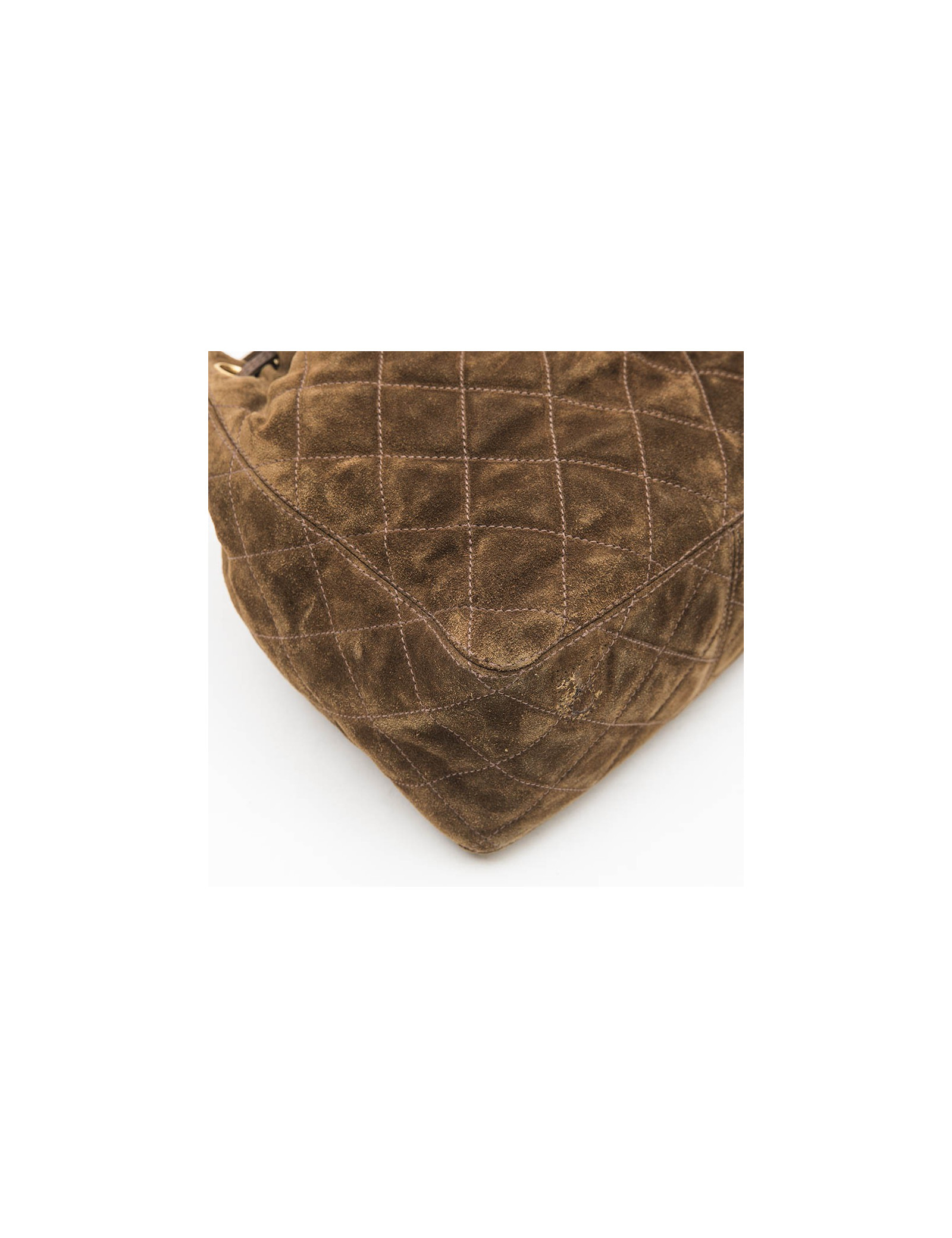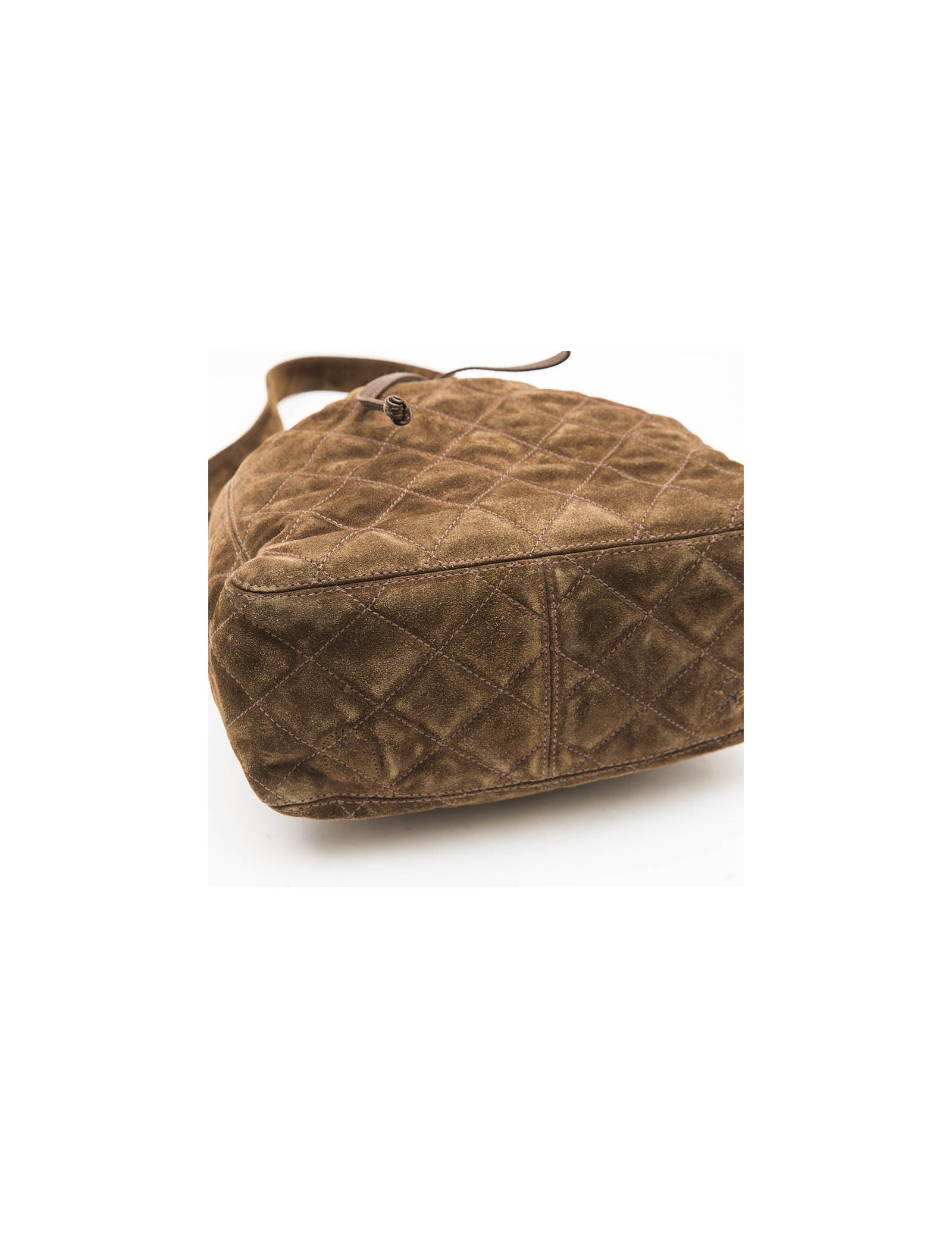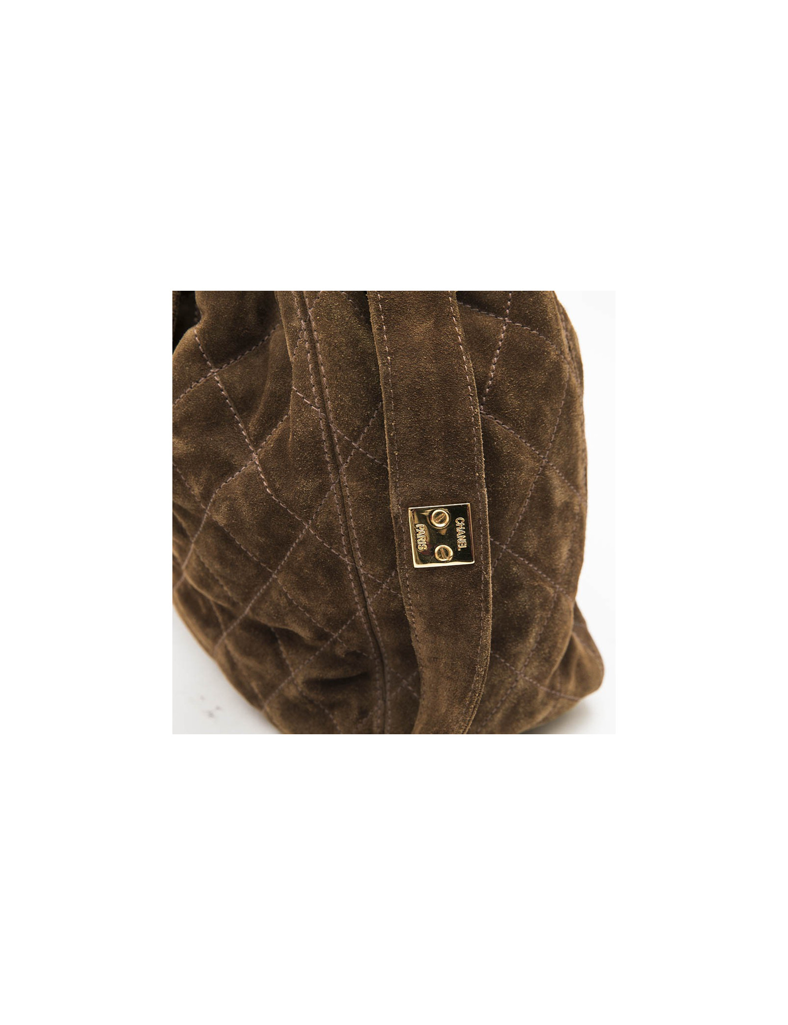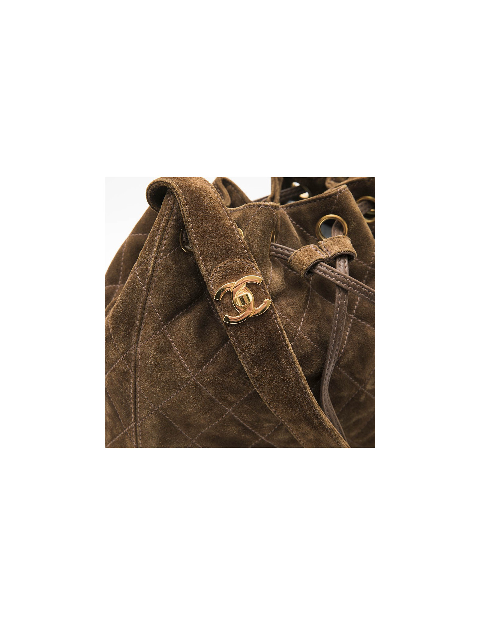 Vintage. Sac seau Chanel en daim marron. Bijouterie Dorée. Logo Chanel sur la bandoulière.