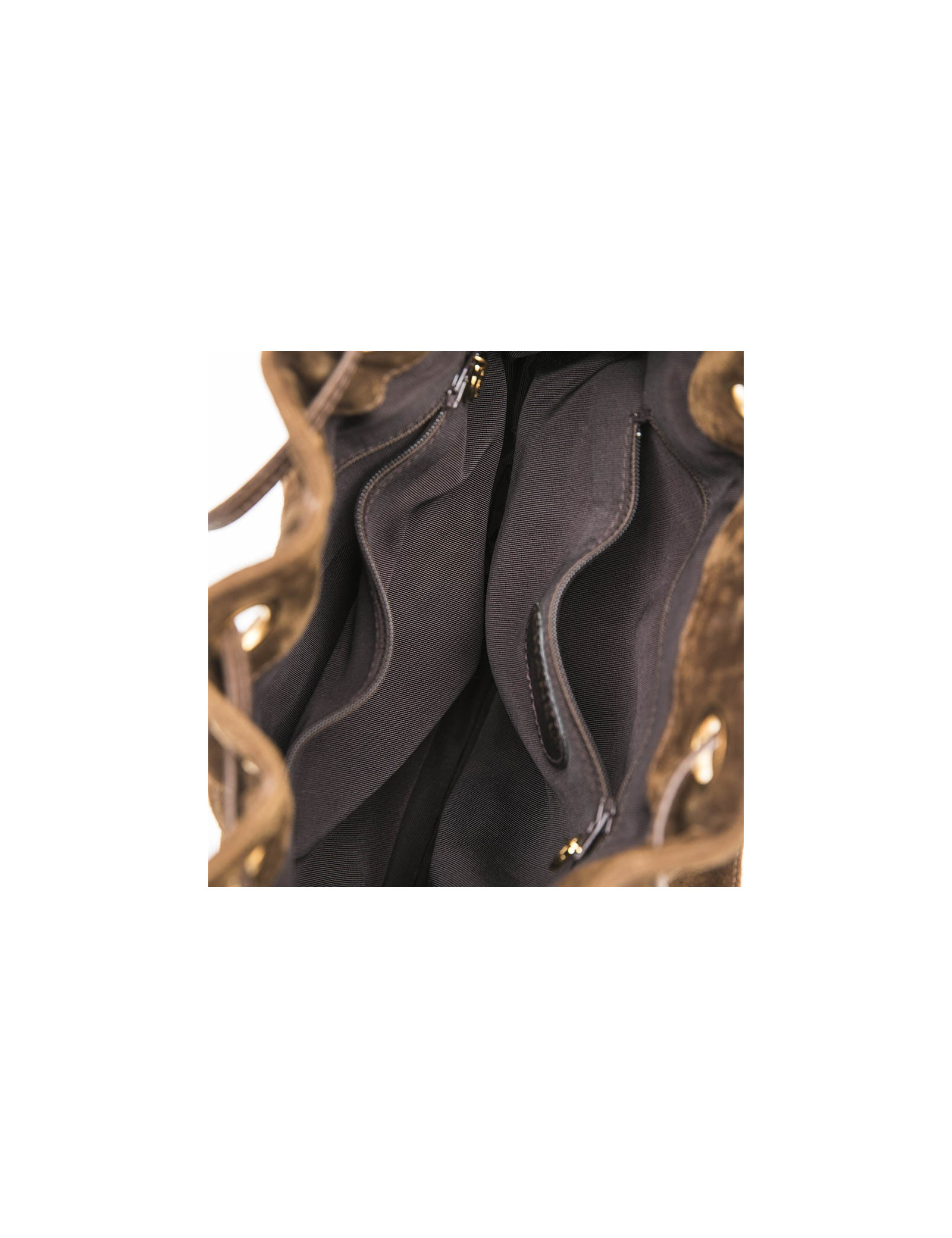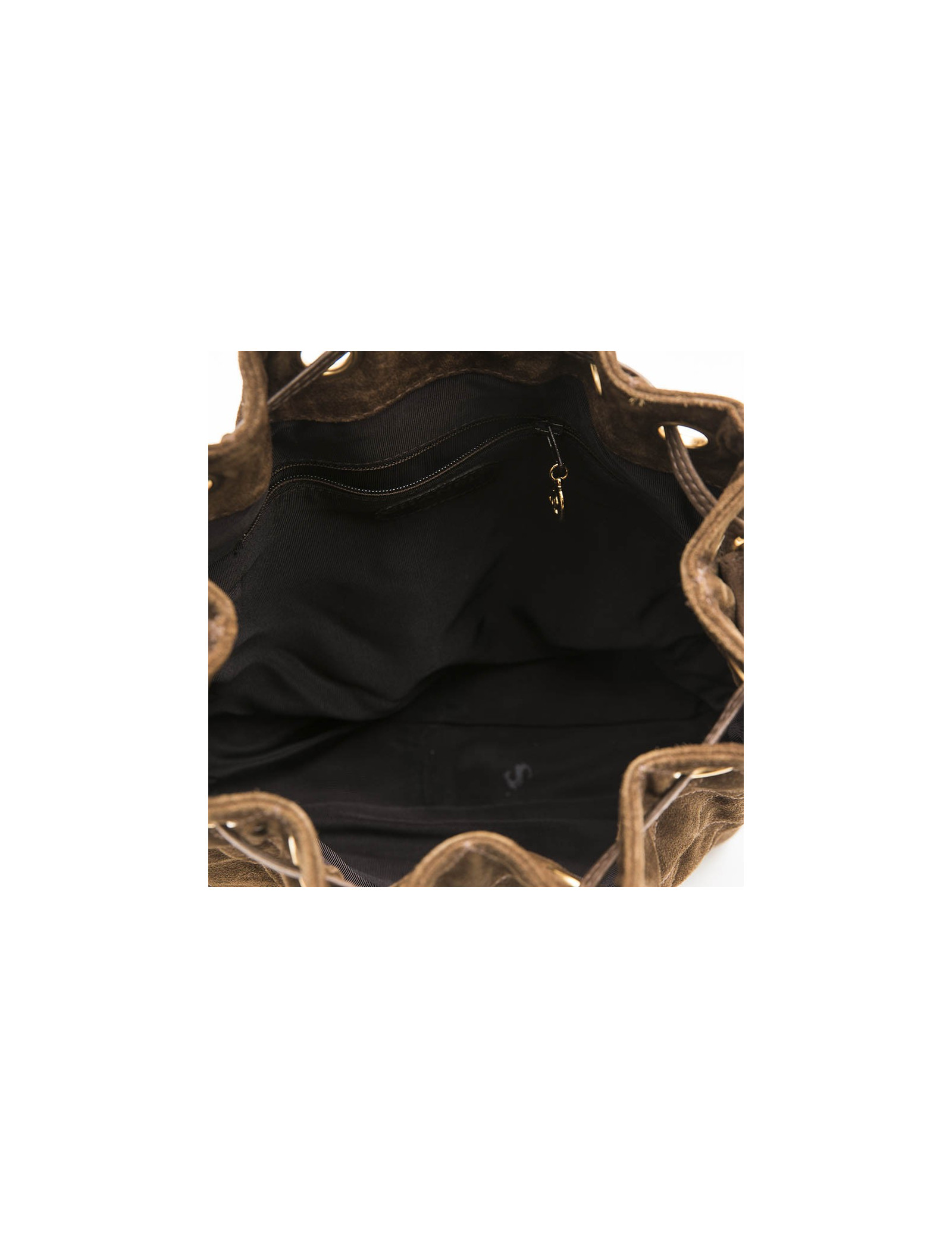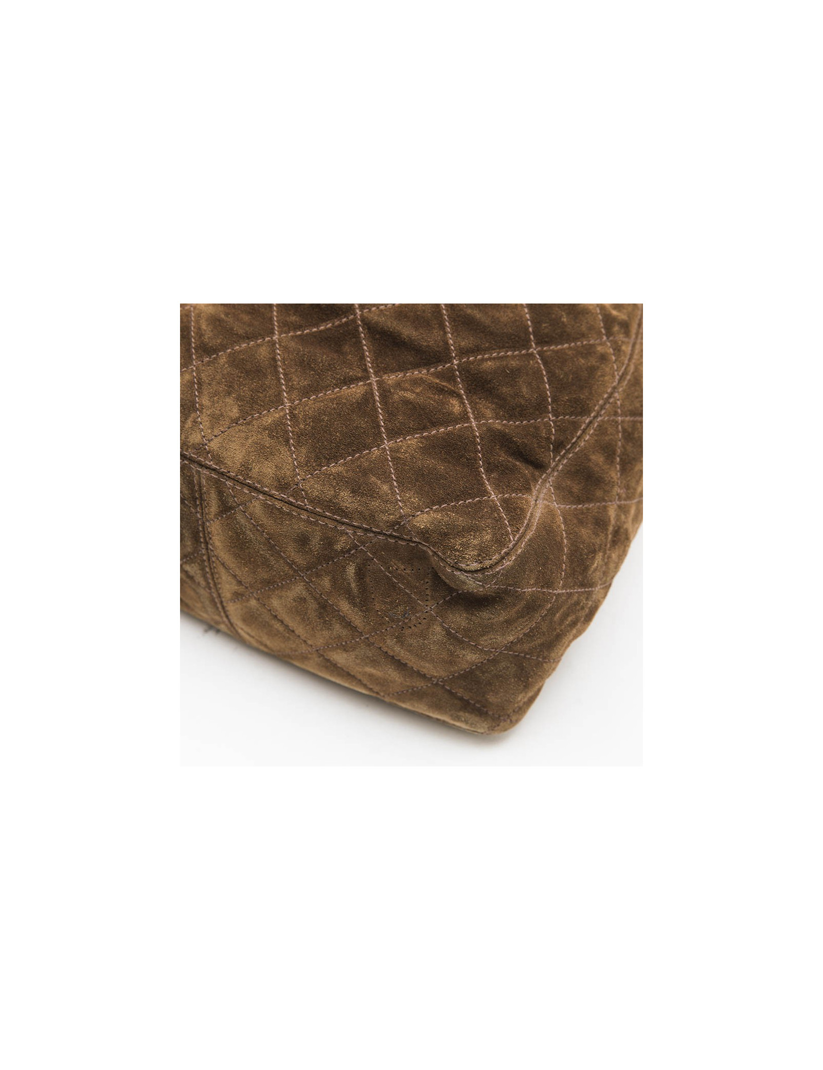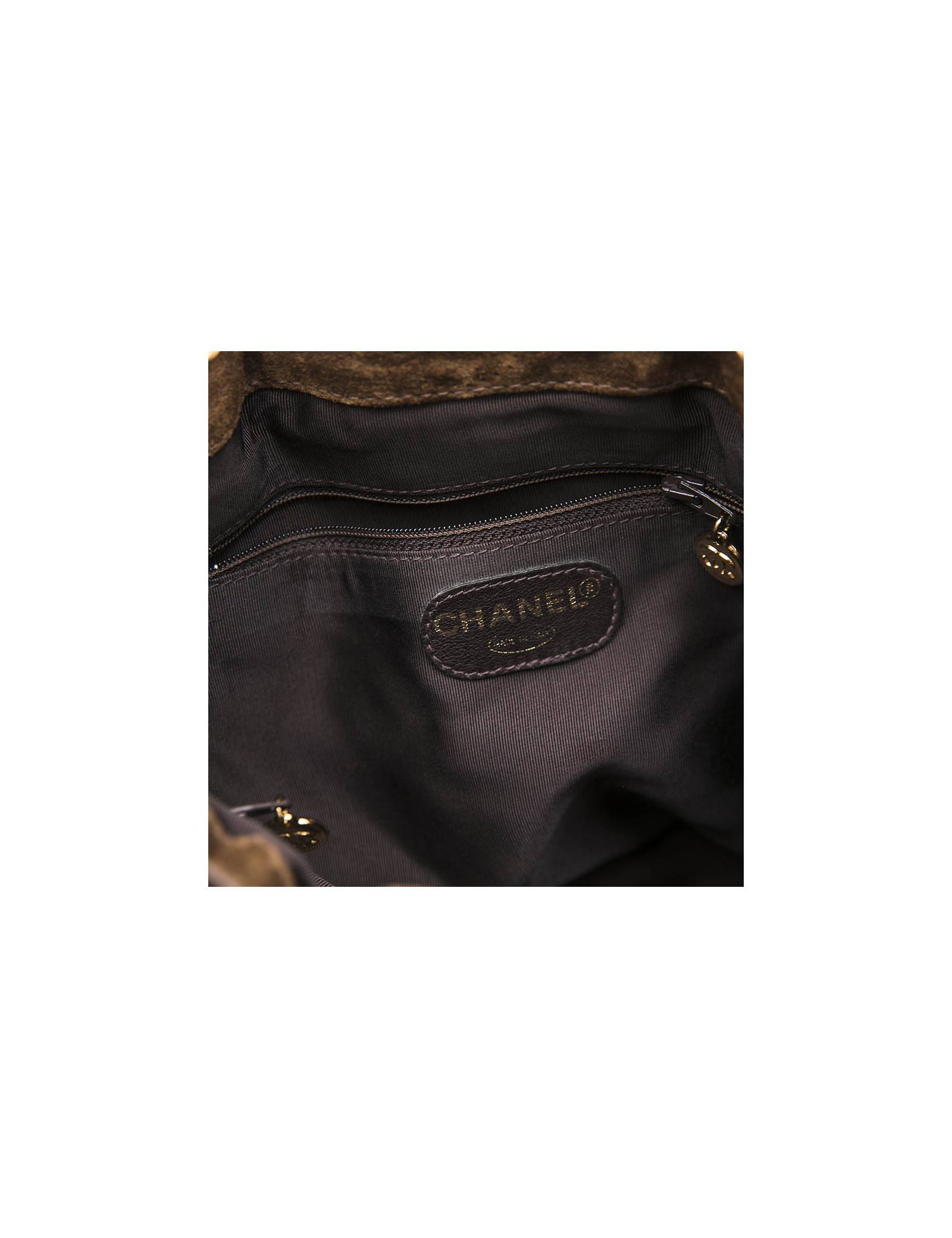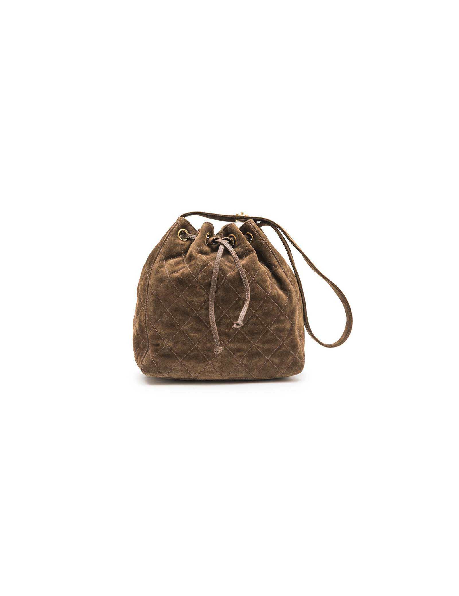 Vintage. Sac seau Chanel en daim marron. Bijouterie Dorée. Logo Chanel sur la bandoulière.