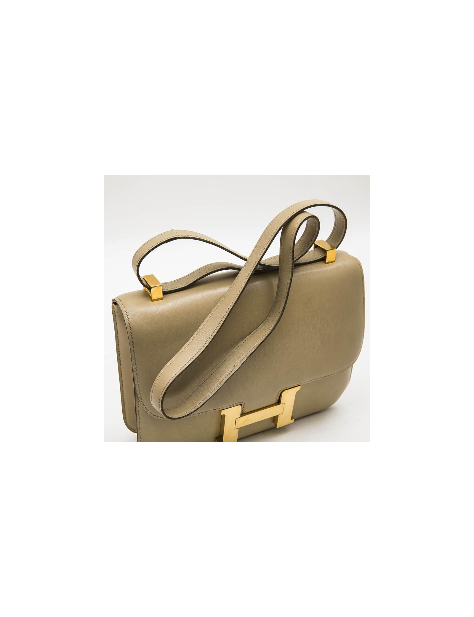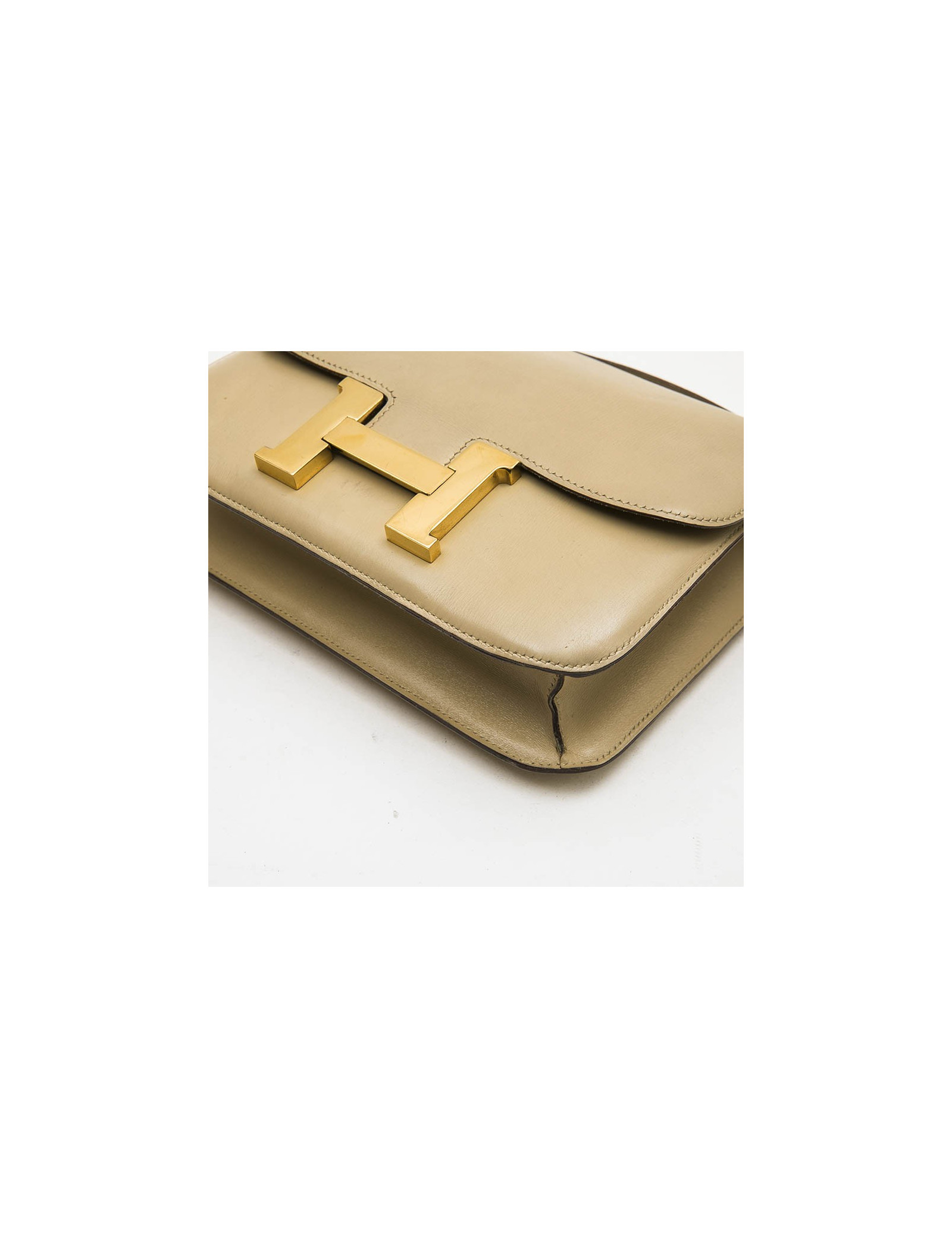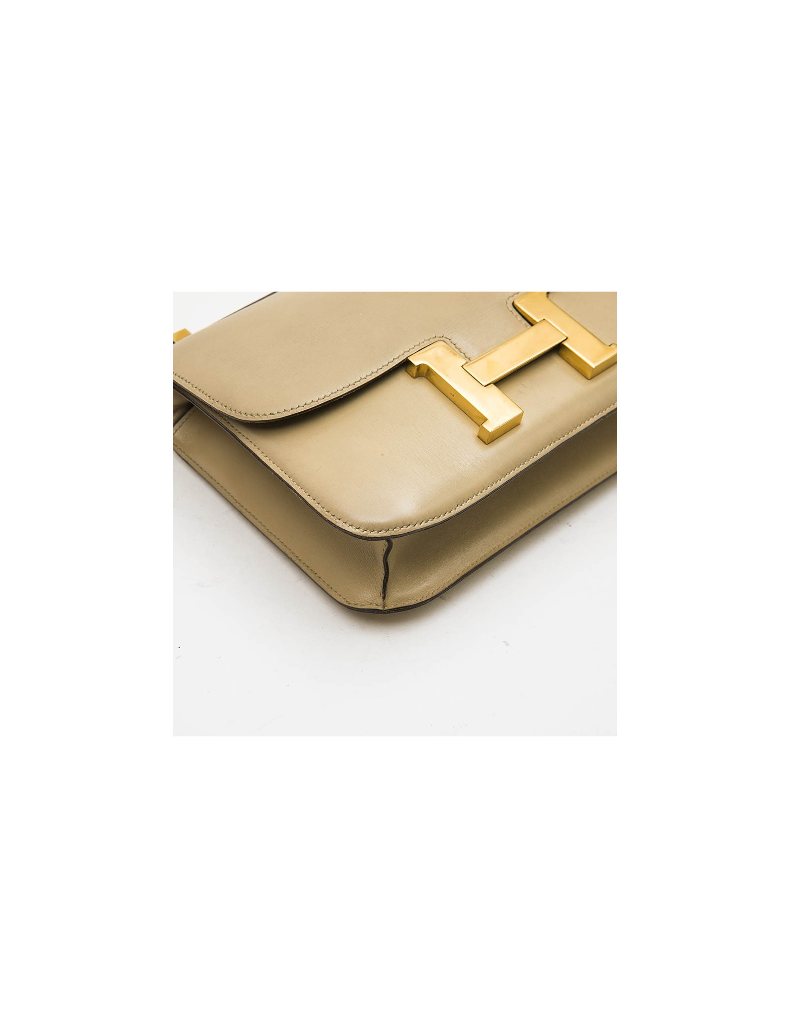 Sac Constance Hermès vintage en cuir box couleur sable. Bijouterie métal plaqué or avec micro rayures.