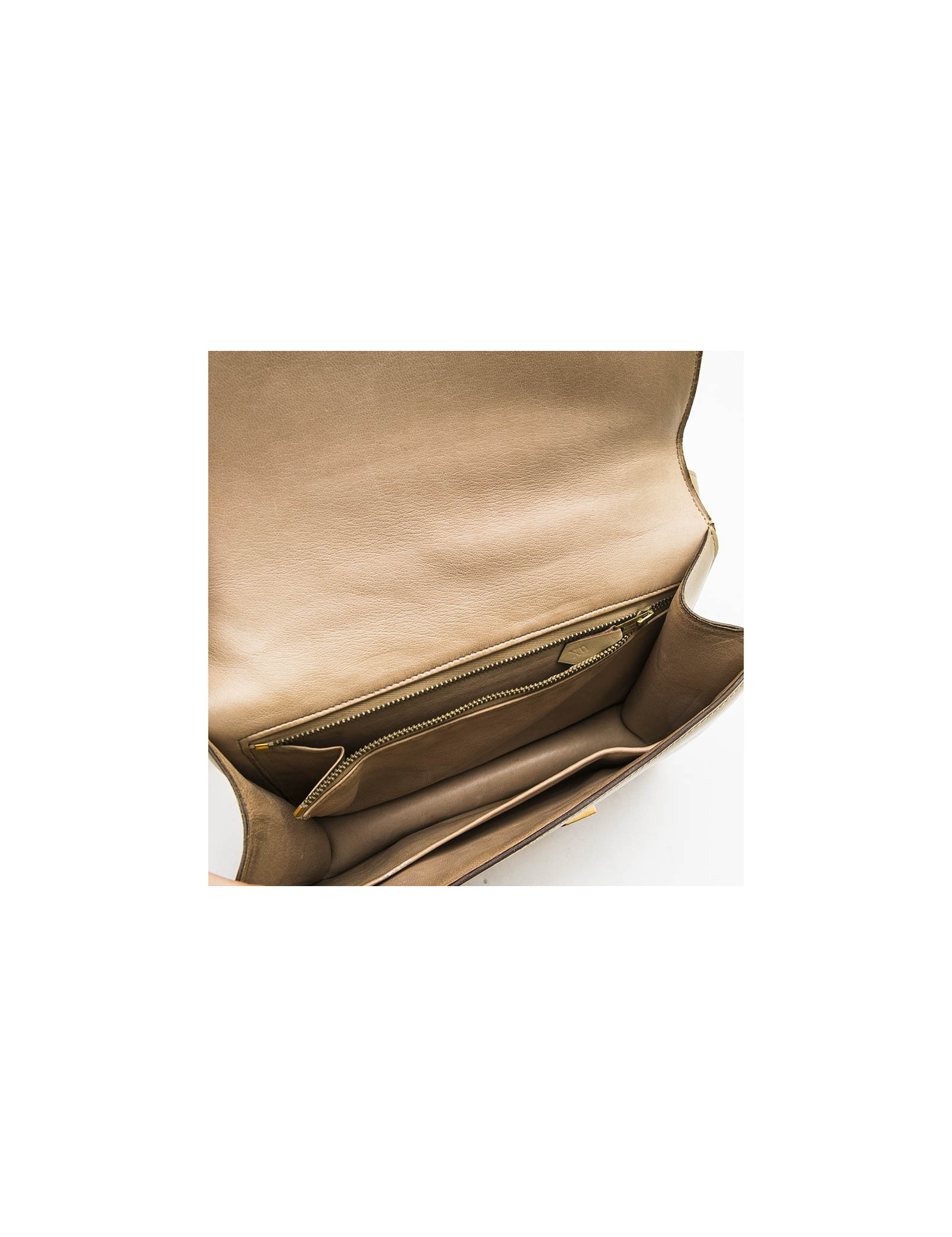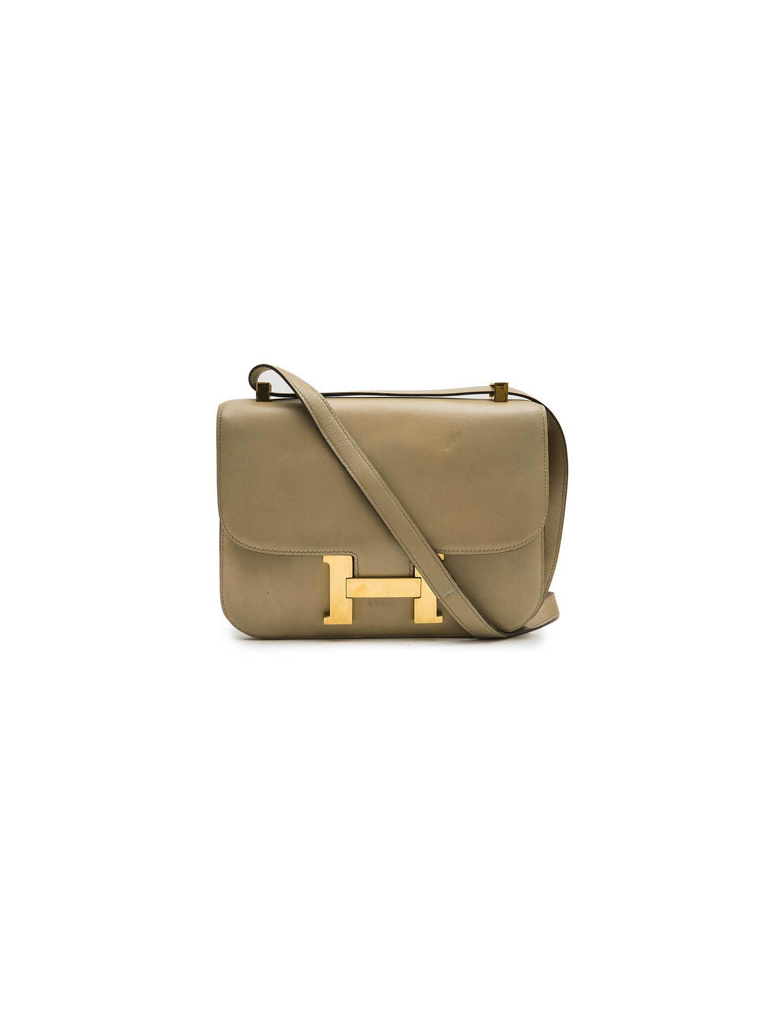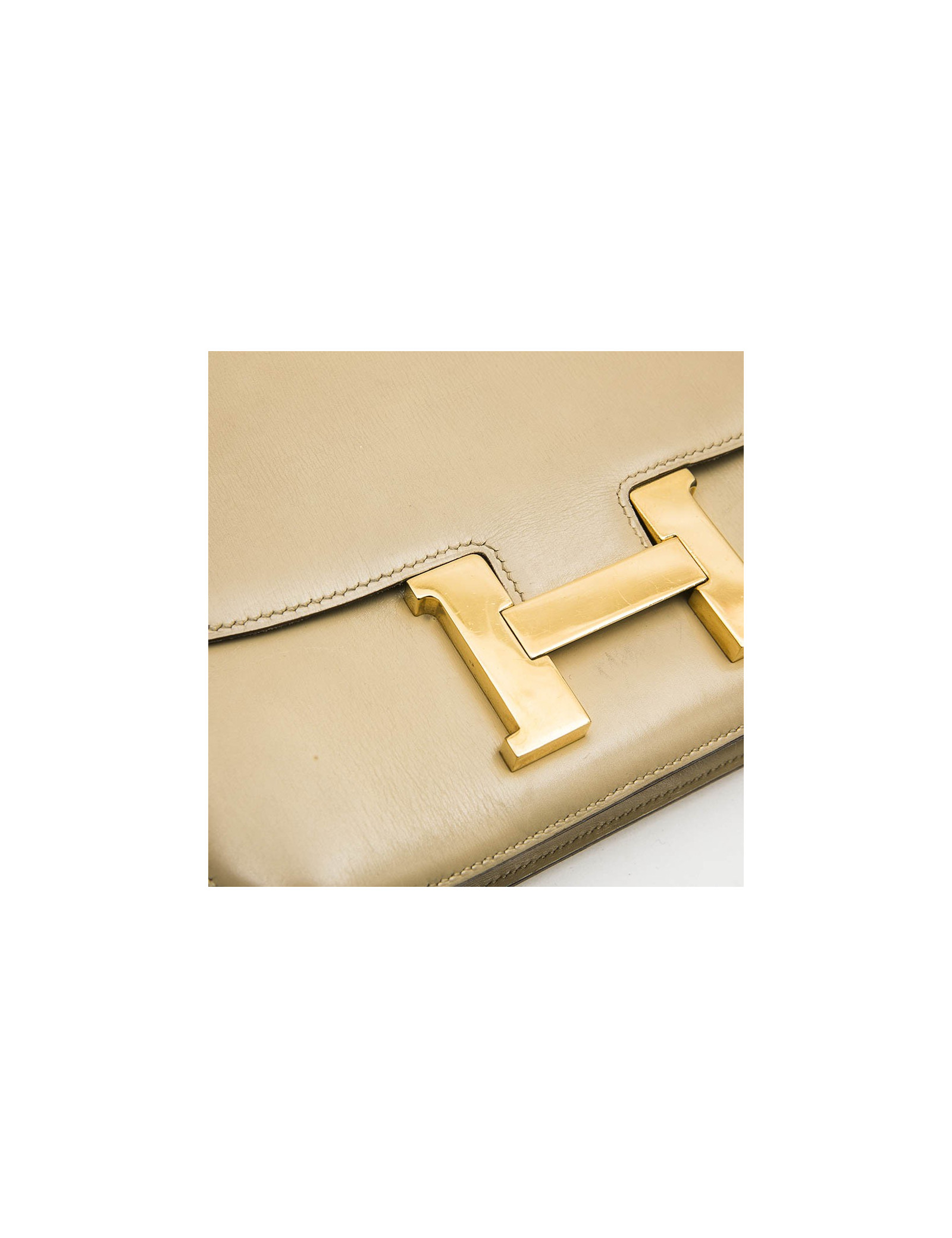 Sac Constance Hermès vintage en cuir box couleur sable. Bijouterie métal plaqué or avec micro rayures.