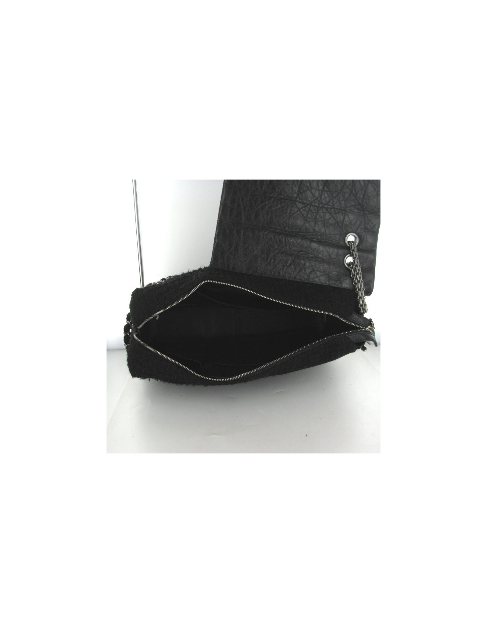 Les anses sont en tweed noir et argent noir (ruthénium).Il se compose d'une poche avant, d'une à arrière et de trois à l'intérieur dont une zippée. Intérieur en cuir noir.