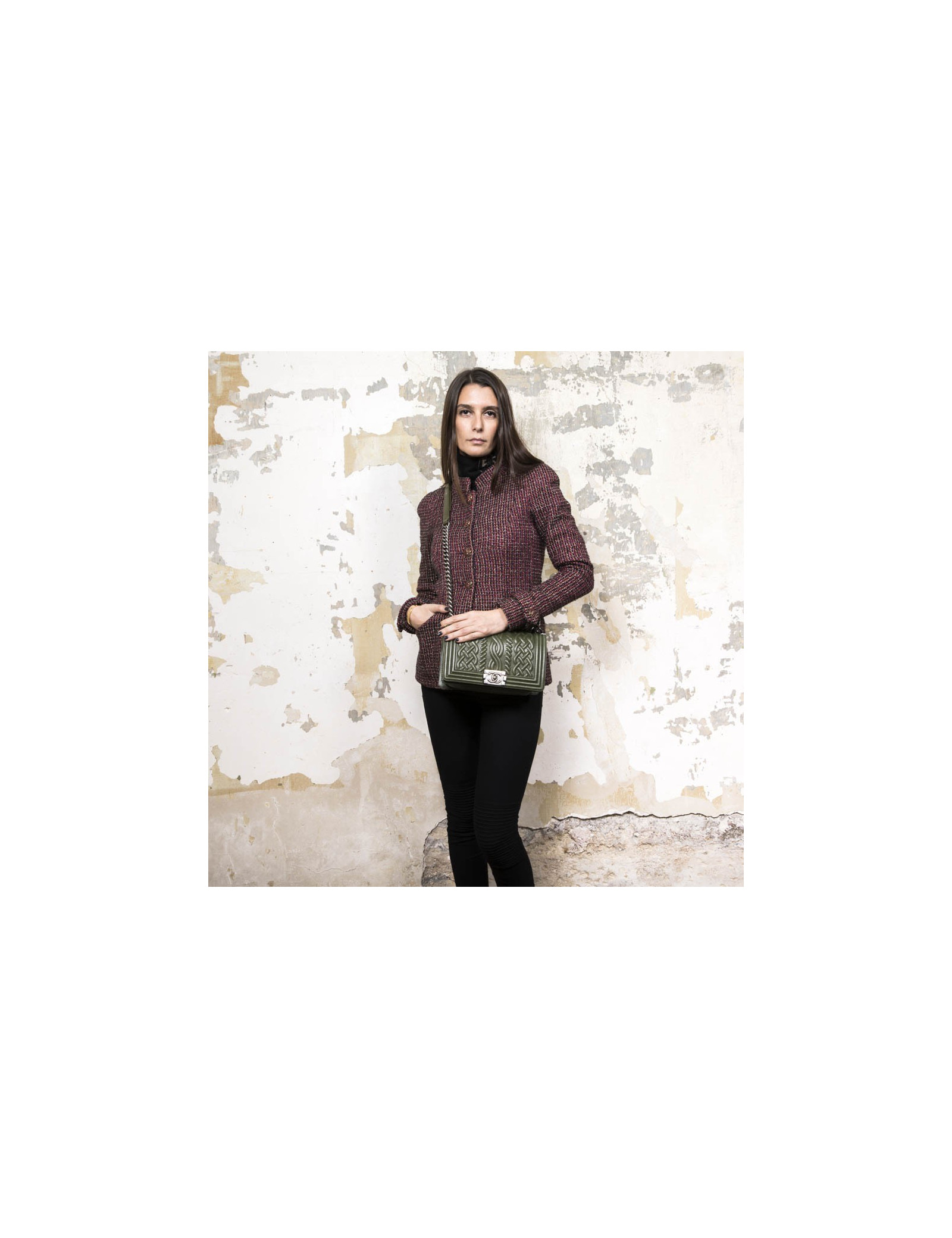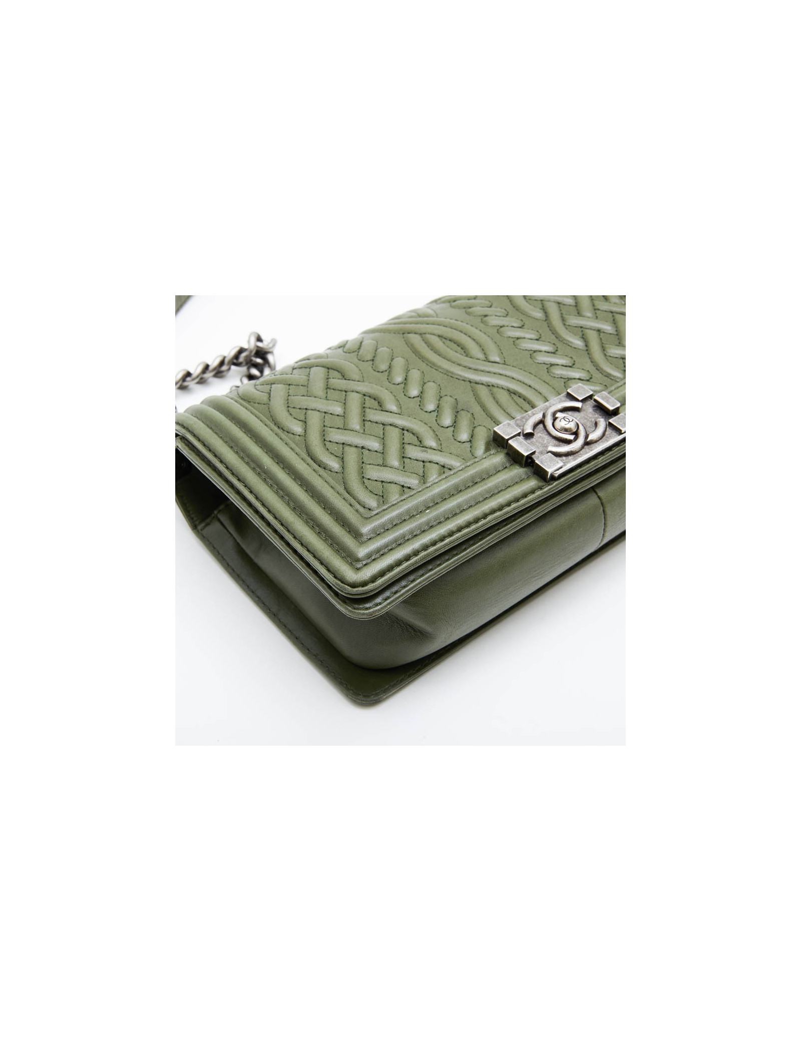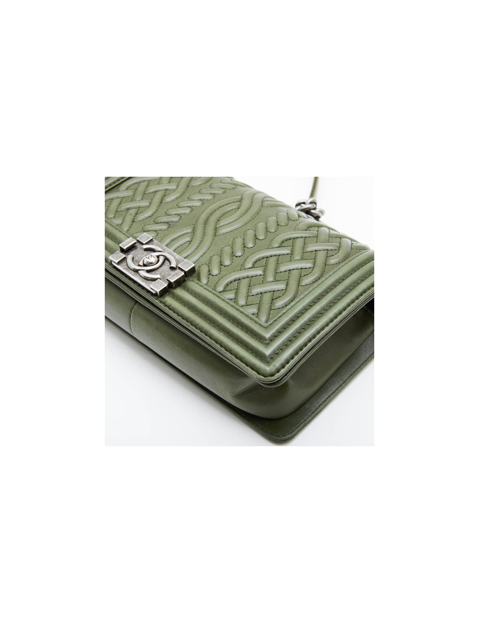 L'avant du boy Chanel est en cuir embossé avec des motifs tressés surpiqués kaki. C’est un sac issu d’une série limitée. Sa bijouterie est de couleur métal argent vieilli. L'intérieur du sac est en toile vert avec une poche fente. Il se porte épaule ou crossover.