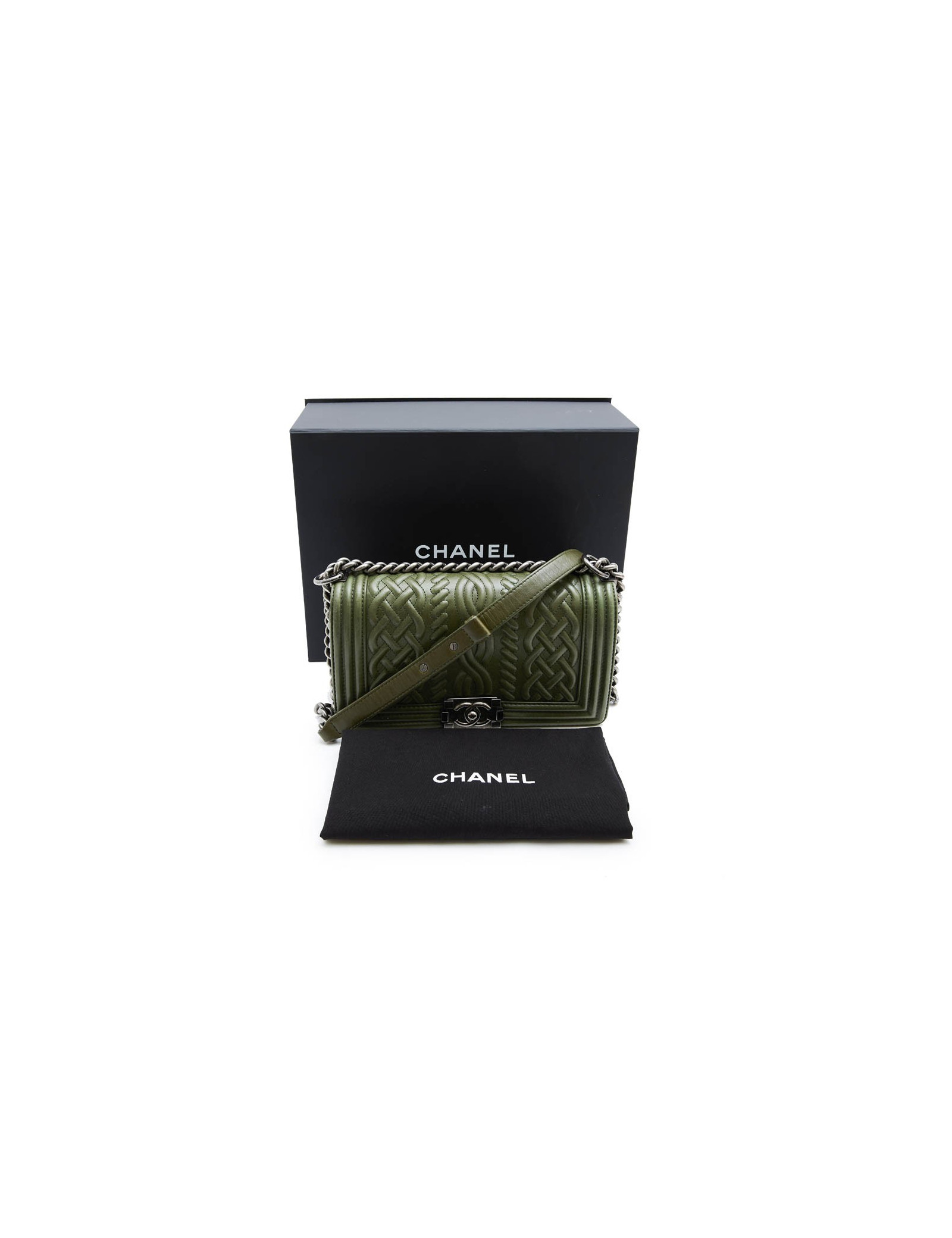 Ce ravissant boy Chanel kaki sera livré dans son dustbag et sa boite Chanel.