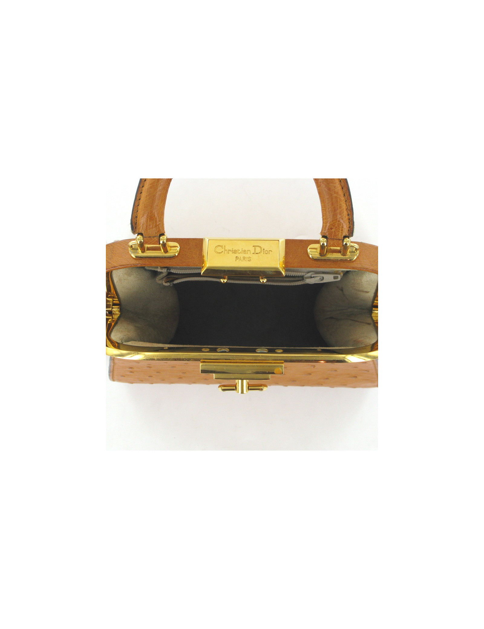 Rare sac CHRISTIAN DIOR en cuir d'autruche couleur camel. Il se porte main et se compose d'un intérieur en daim gris et d'une petite poche zippée.