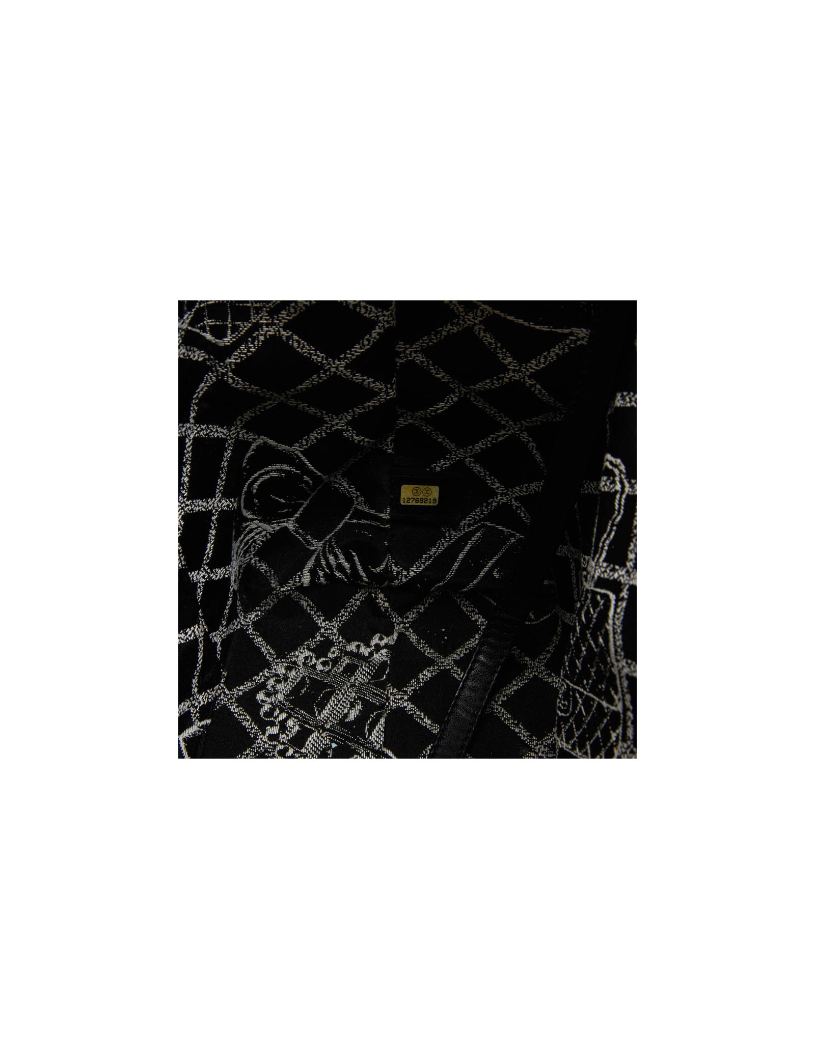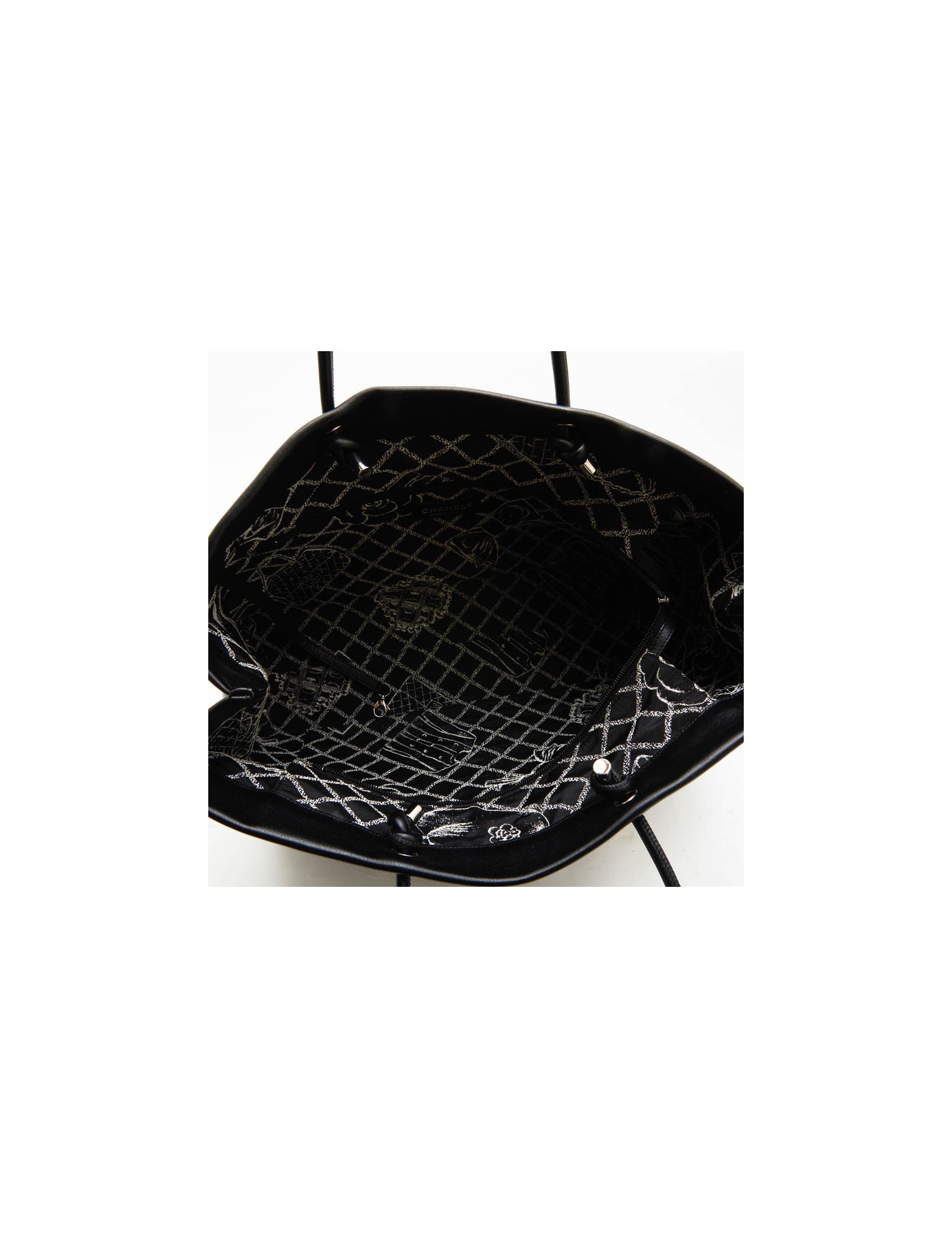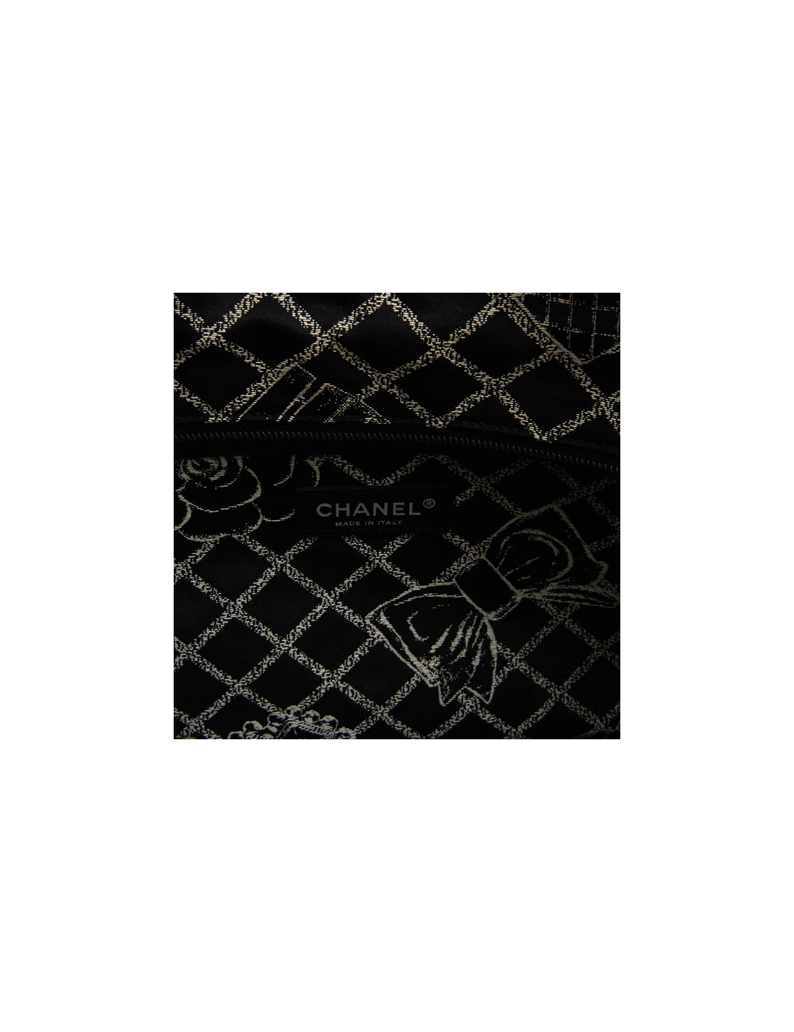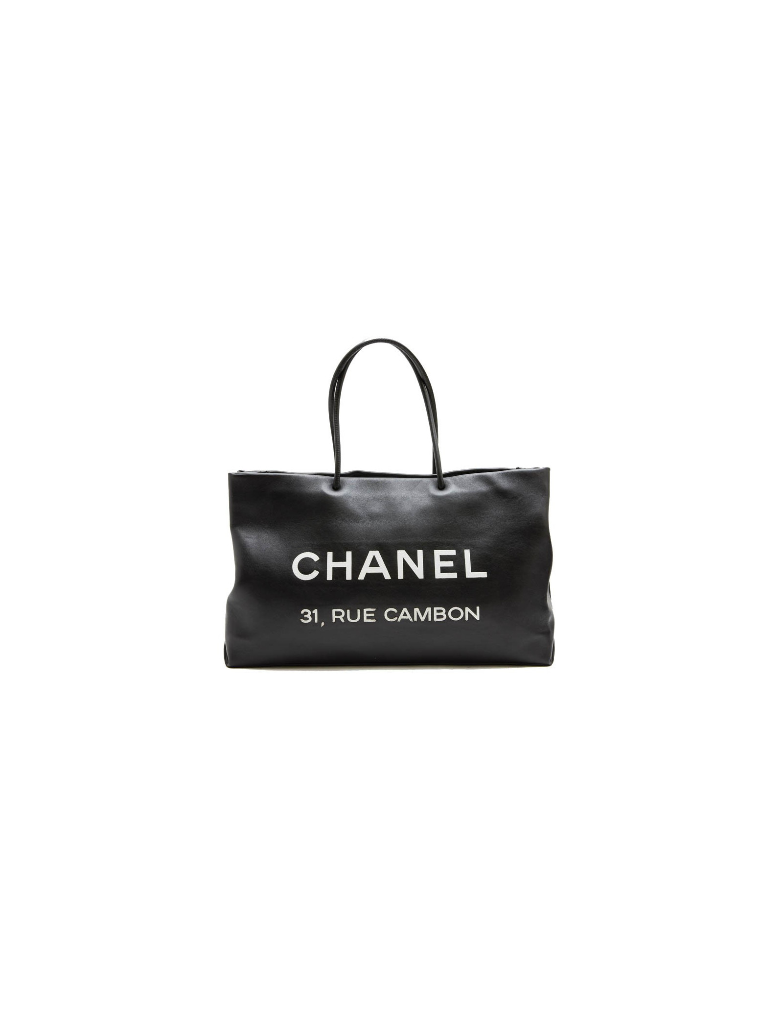 Collector. Grand shopping Chanel en cuir lisse noir. "CHANEL 31 RUE CAMBON", lettres cousues à l'avant du sac Doublure tissu imprimé noir et blanc avec une poche zippée et deux poches plaquées. Il se ferme par une fermeture à glissière. Porté main et épaule. Made in Italy.