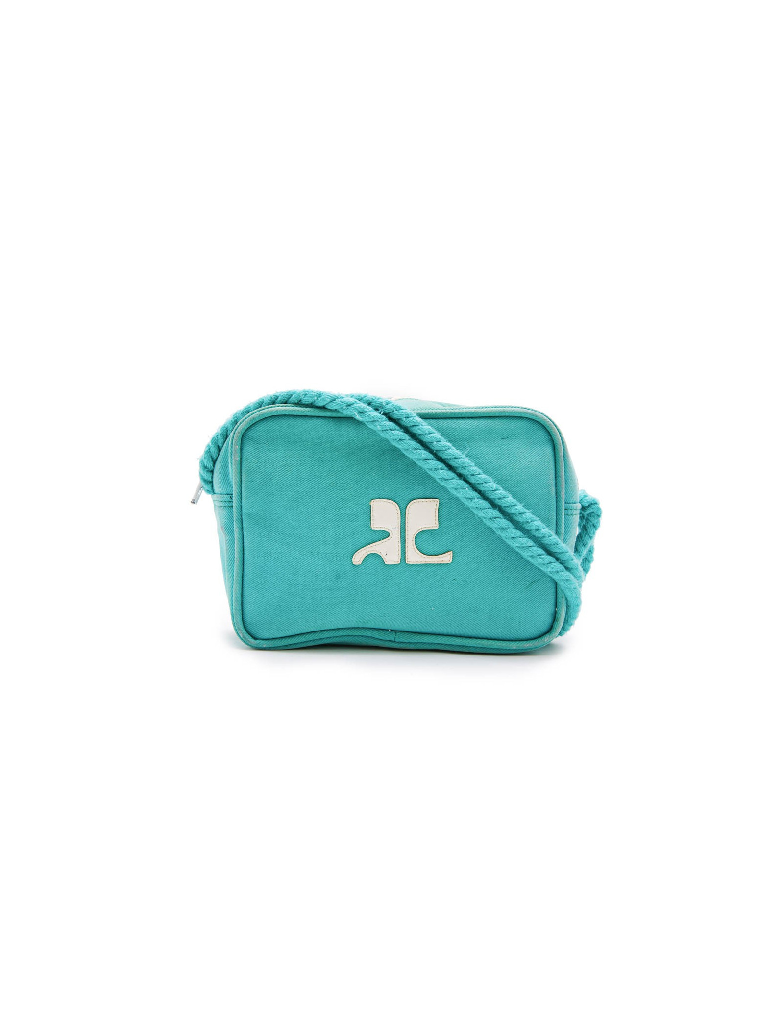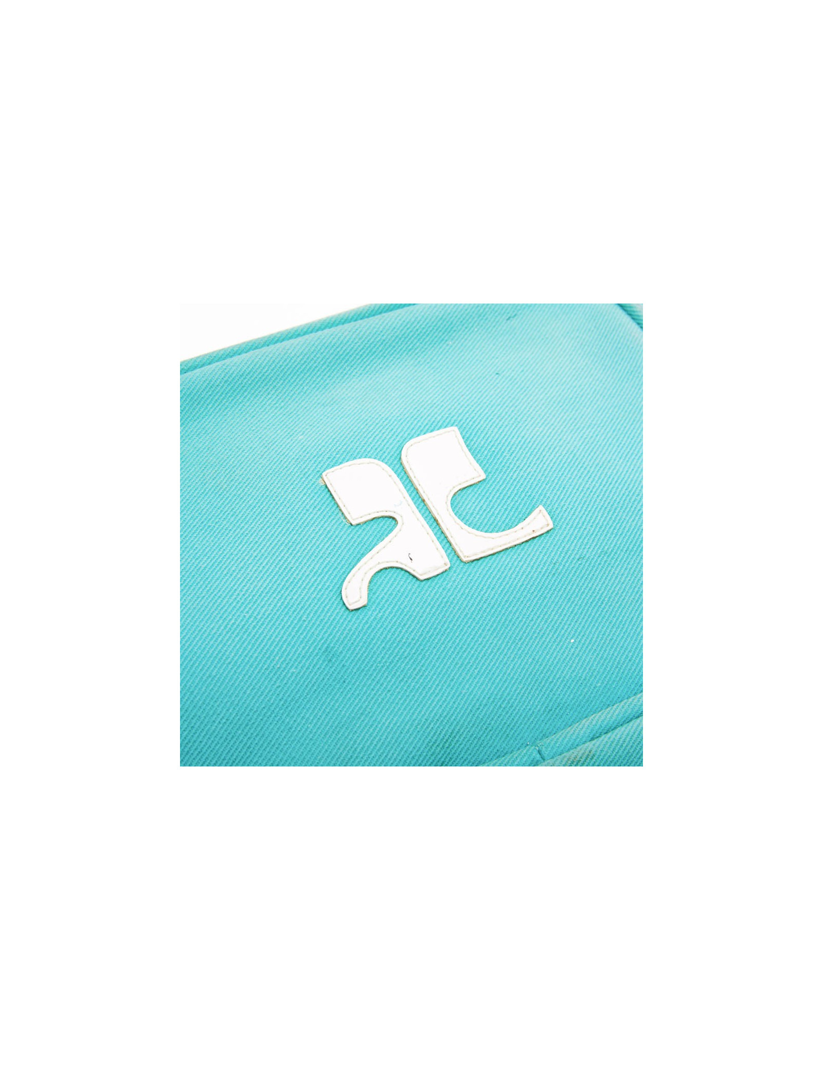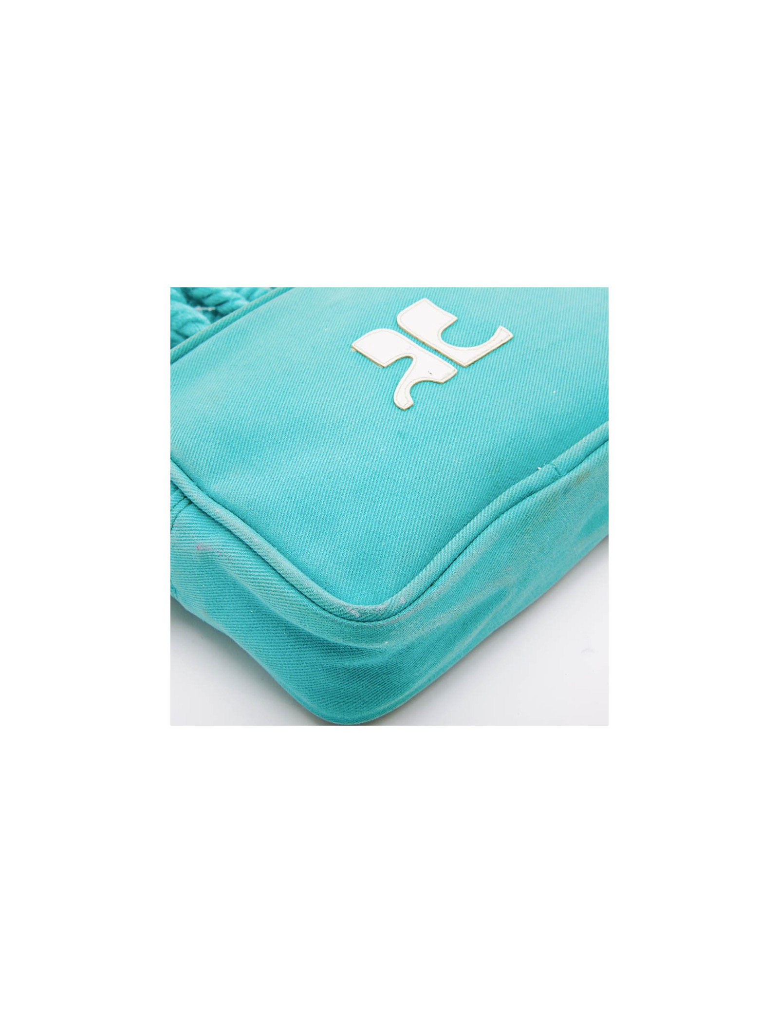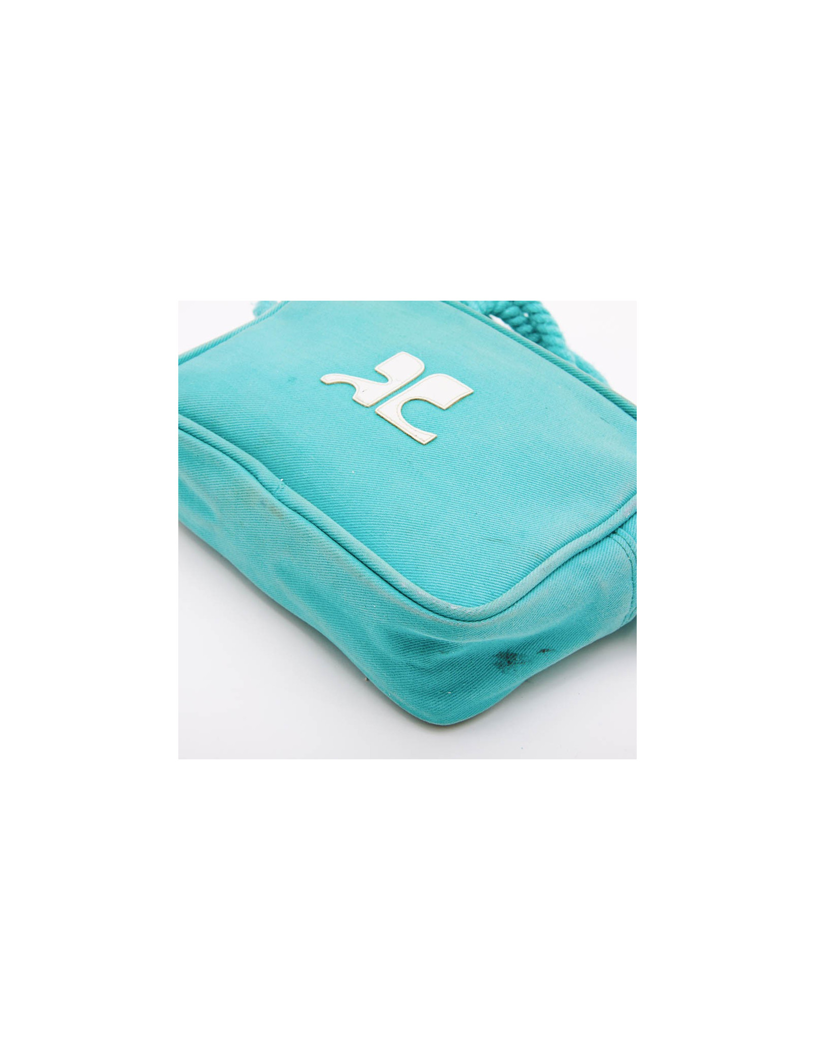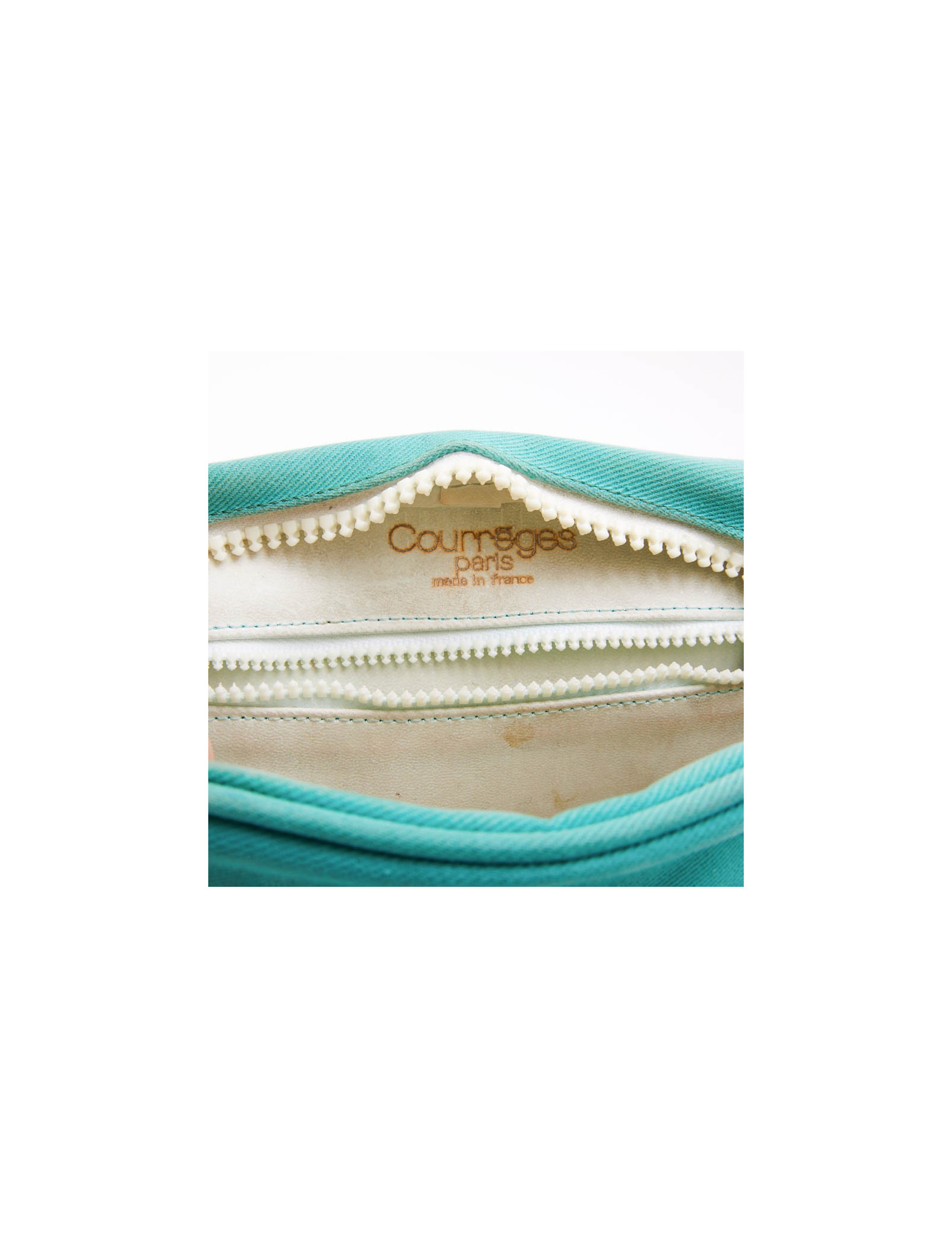 Sac Courrèges vintage en toile turquoise. Porté épaule ou crossover.