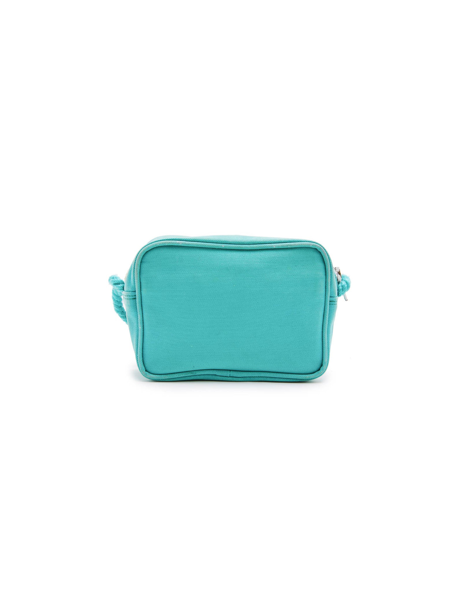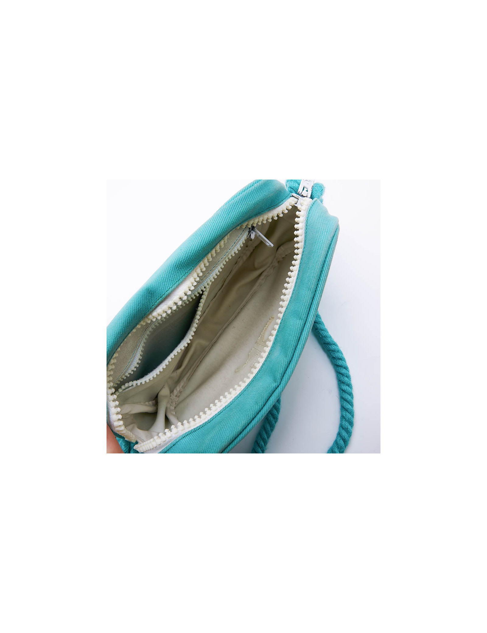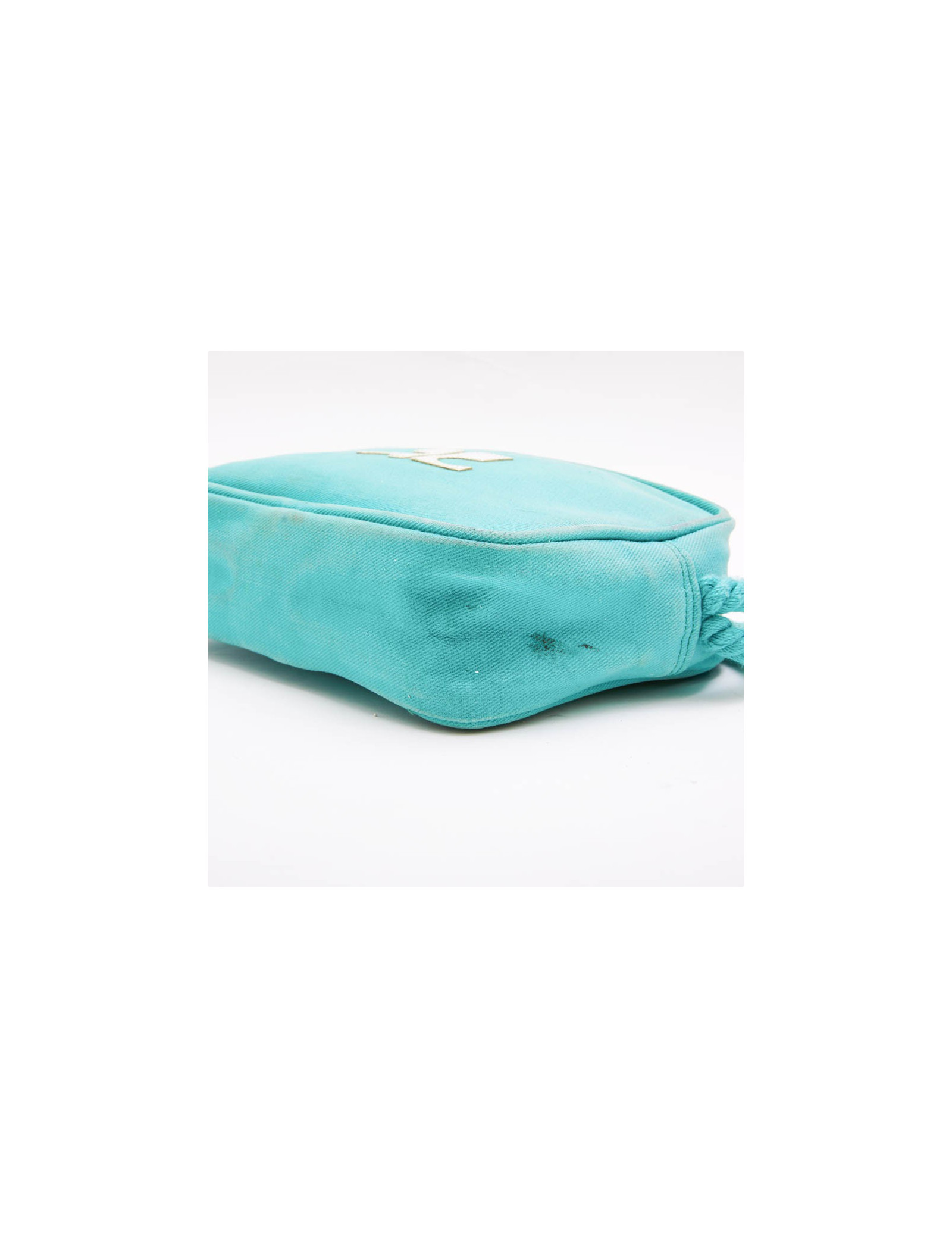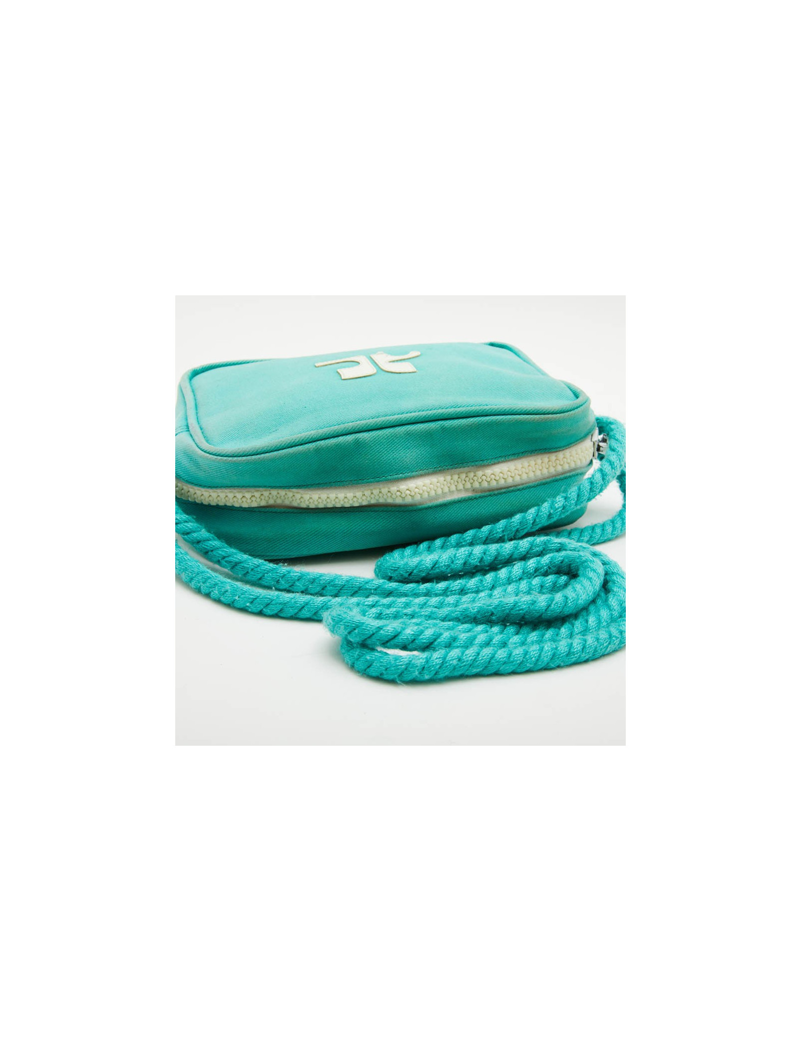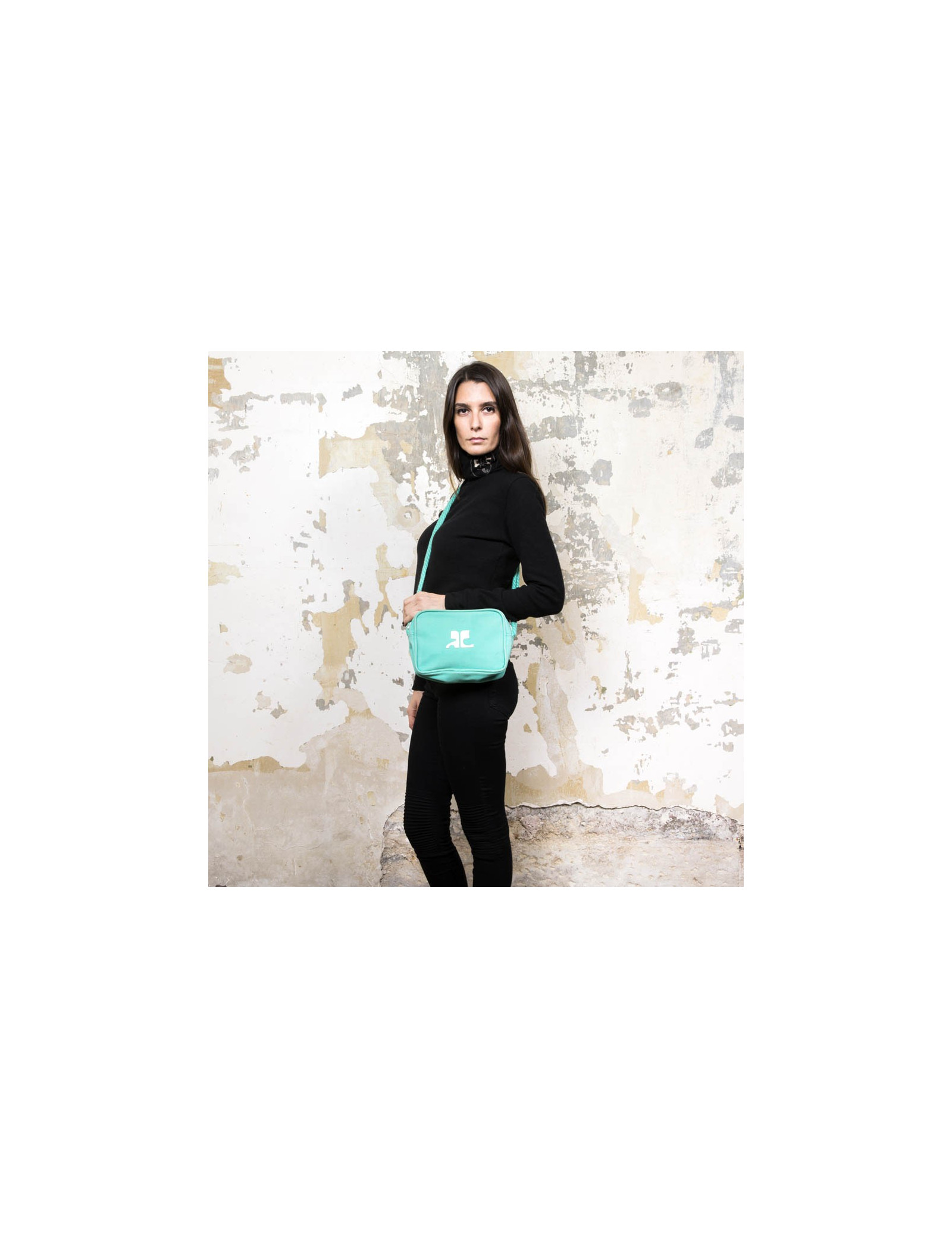 Sac Courrèges vintage en toile turquoise. Porté épaule ou crossover.