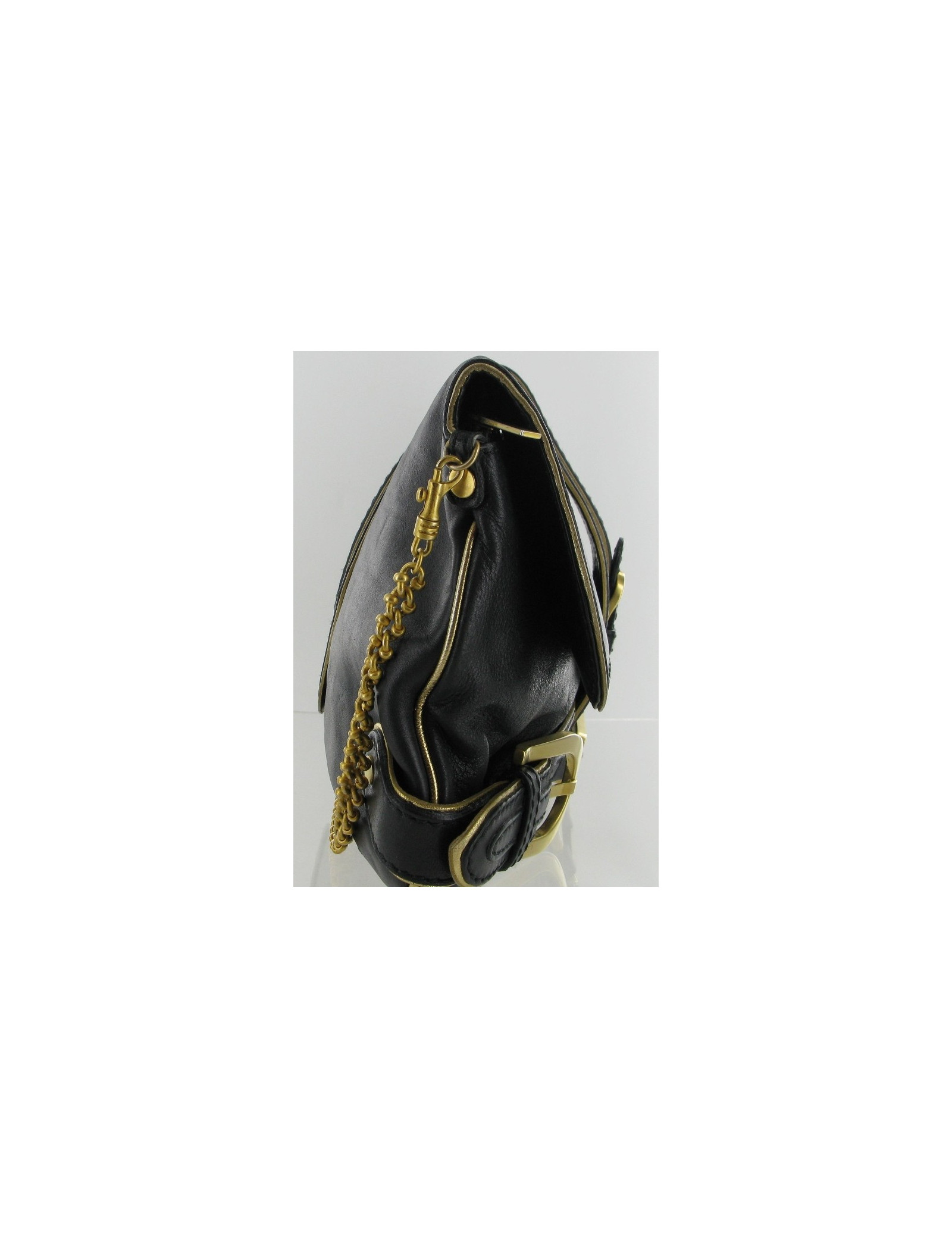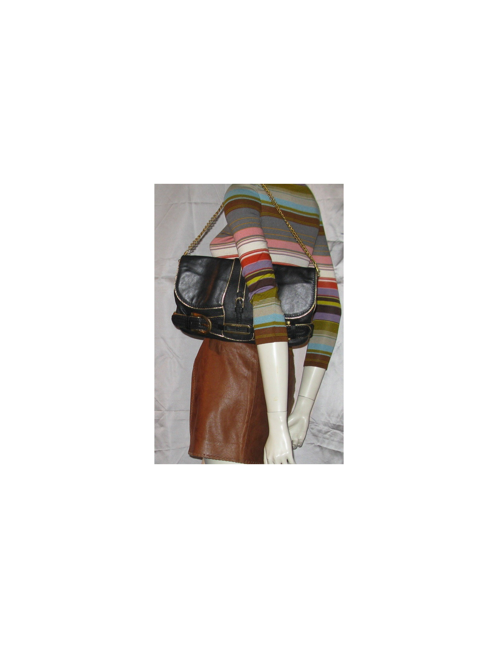 Superbe sac pochette JIMMY CHOO en cuir noir à liserai doré. La bijouterie est en métal doré. Peut se porter en pochette ou porté épaule grâce à une chaîne amovible en métal doré qui mesure 58 cm. Il se ferme grâce à un rabat et une fermeture zippée. L'intérieure est en daim camel, il y a une poche intérieure. Il y a des tâches sur la doublure intérieure.