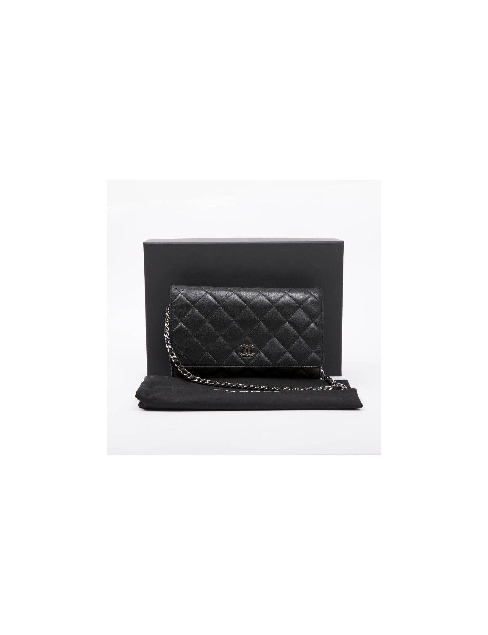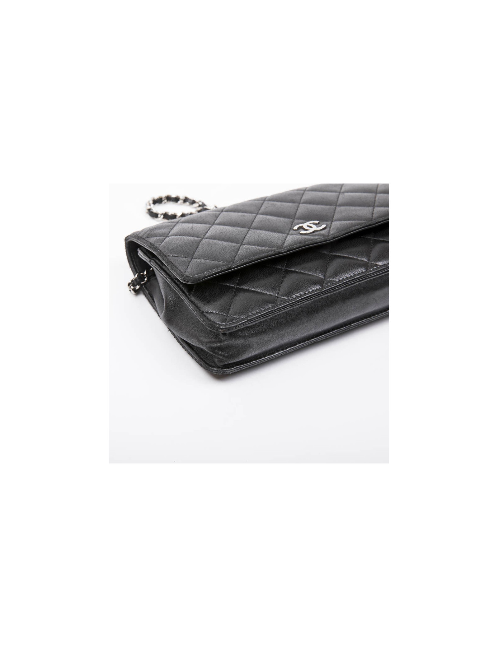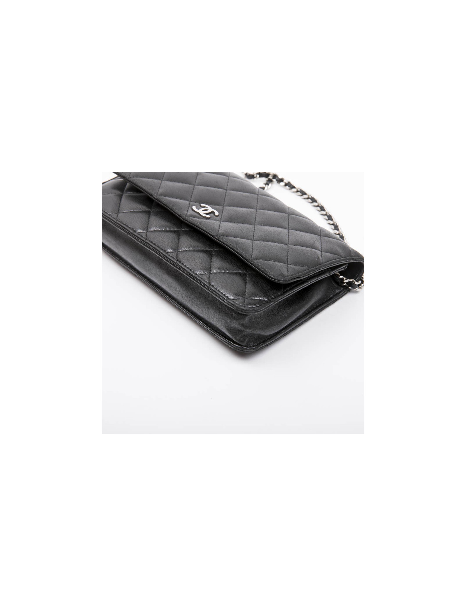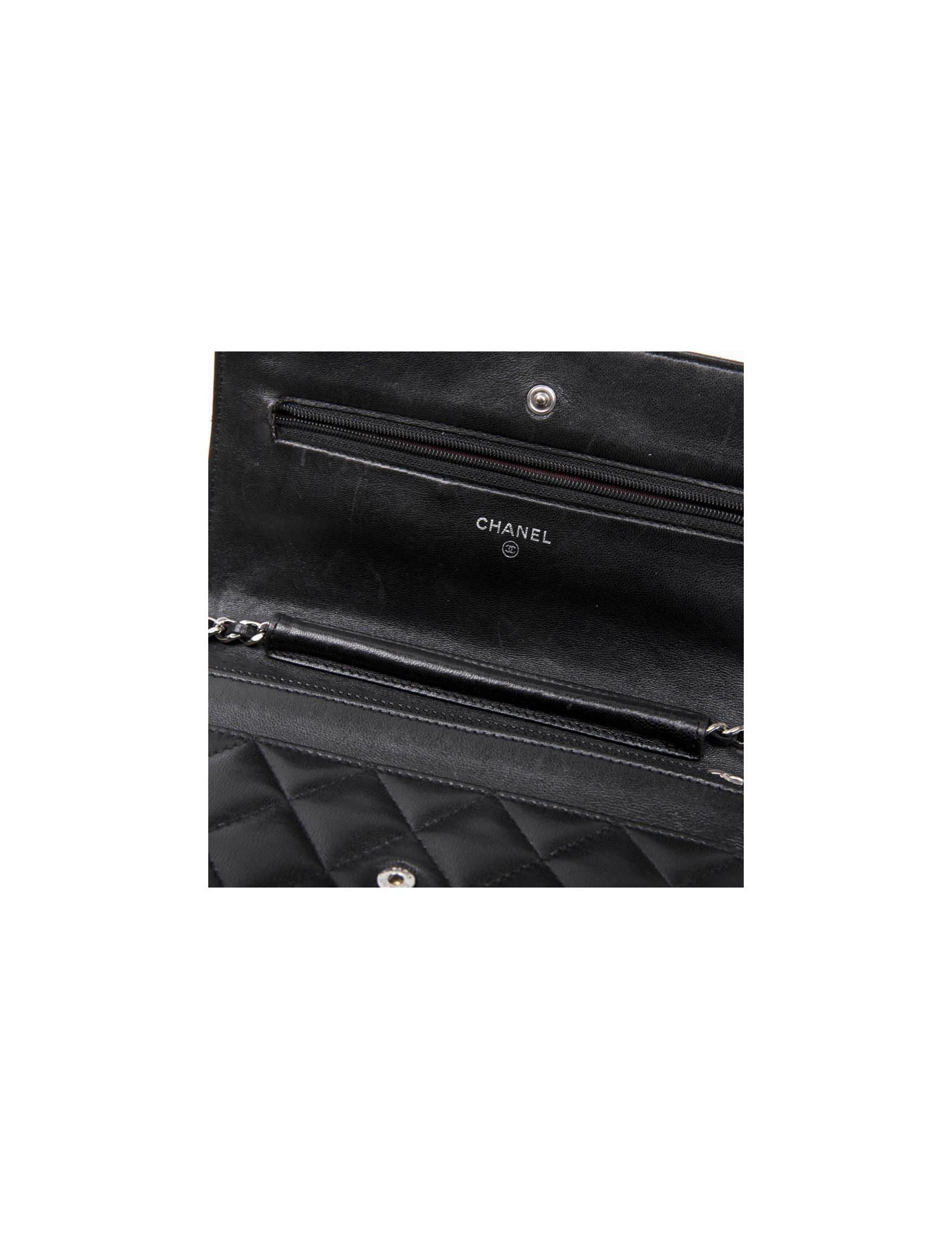 Sac 'Wallet on Chain' de la Maison Chanel en cuir matelassé noir. Chaine en métal argent. Porté main, épaule ou crossover. Fermeture siglée sur le rabat, une poche plaquée au dos du sac. Doublure intérieure en tissu bordeaux, une poche zippée, 6 emplacements pour cartes.