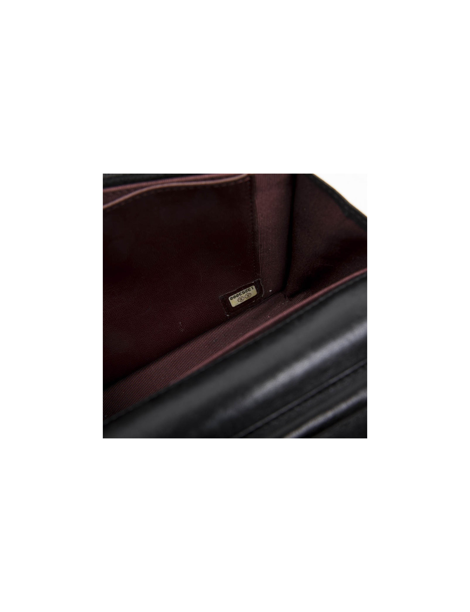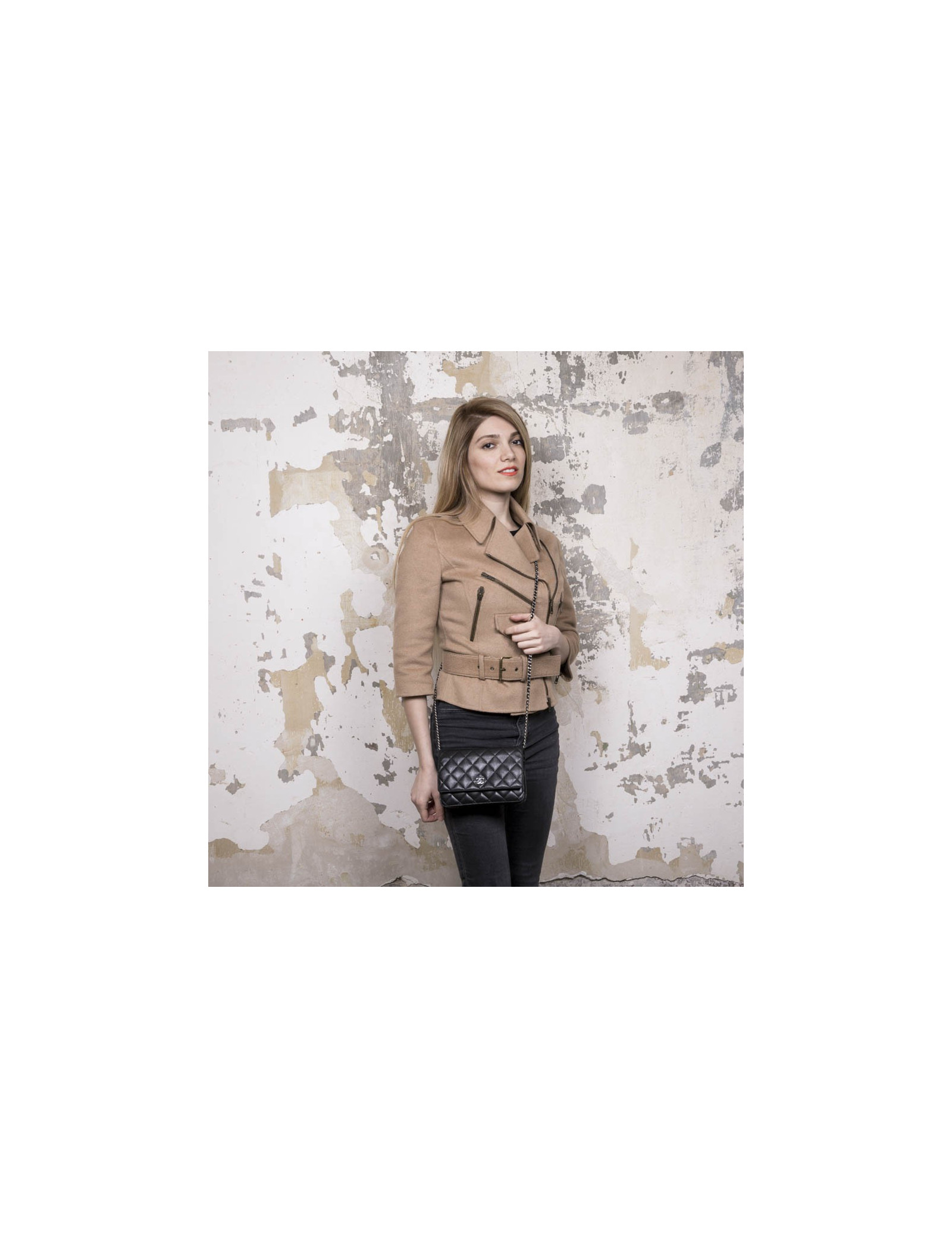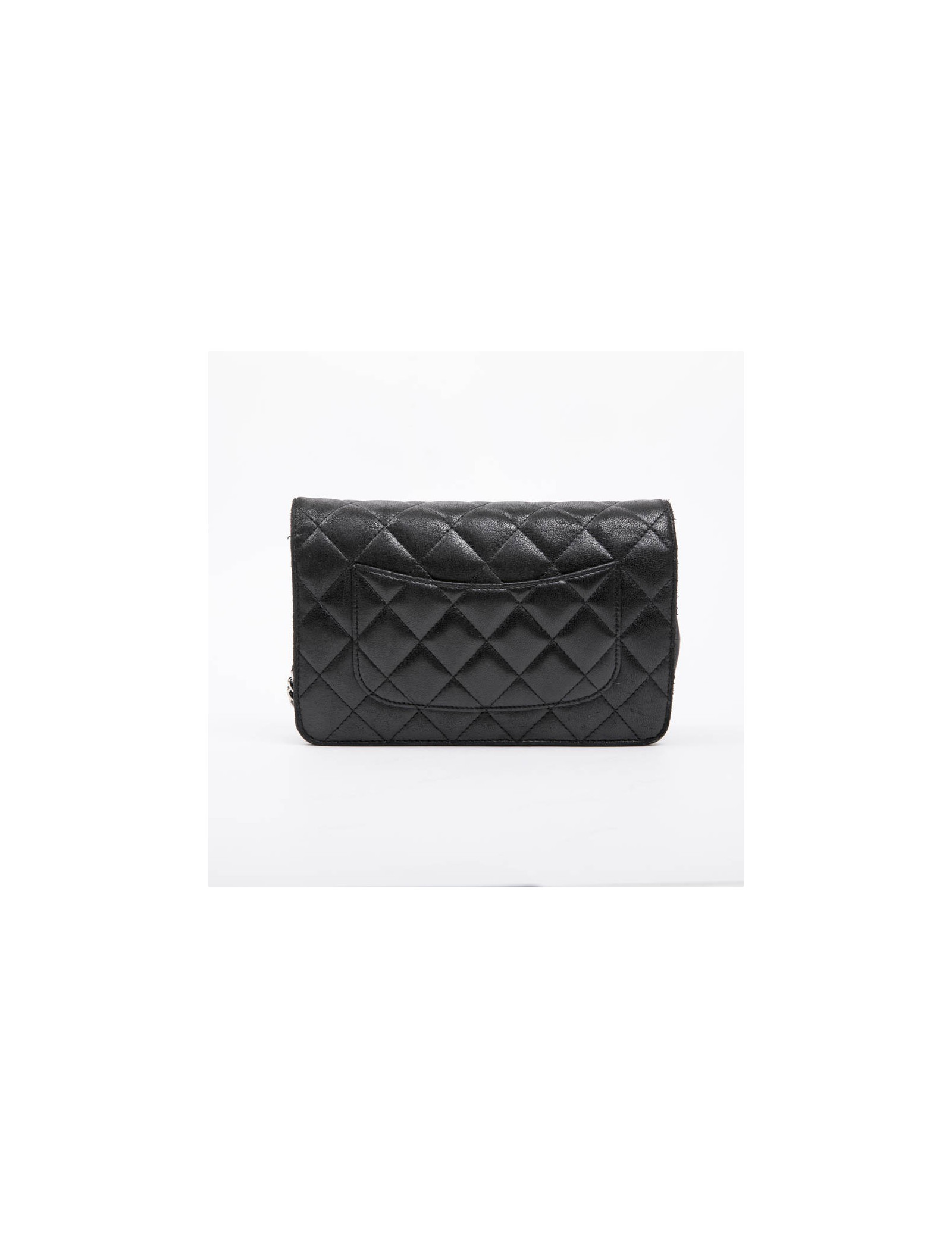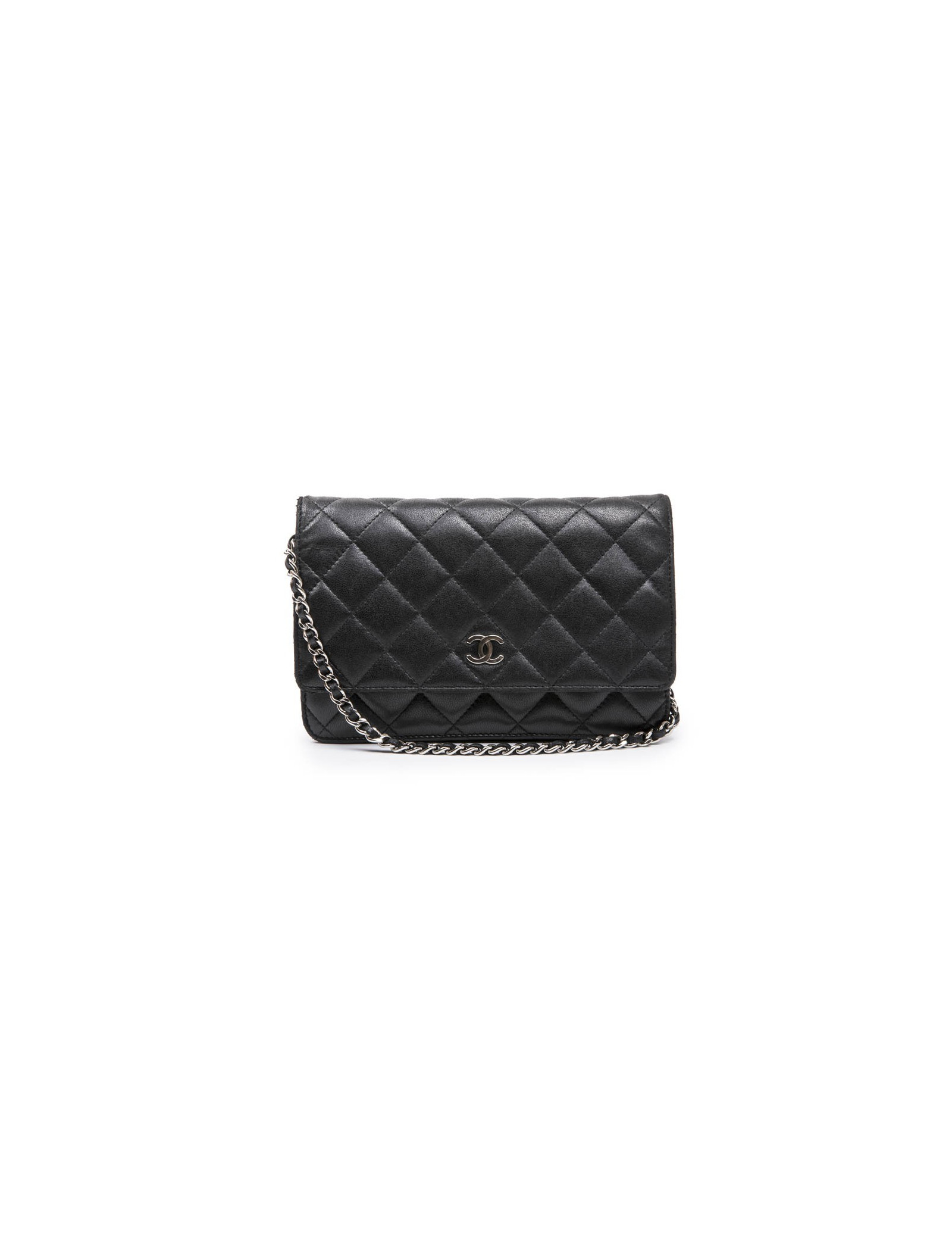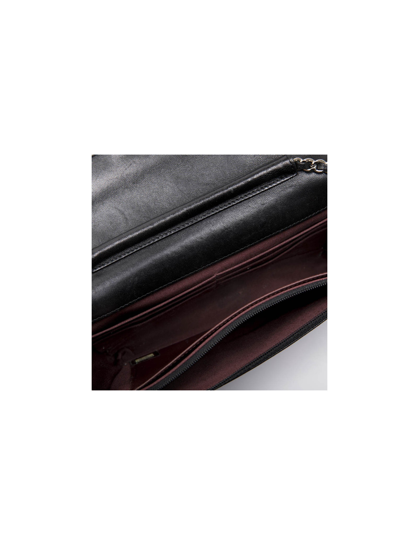 Sac 'Wallet on Chain' de la Maison Chanel en cuir matelassé noir. Chaine en métal argent. Porté main, épaule ou crossover. Fermeture siglée sur le rabat, une poche plaquée au dos du sac. Doublure intérieure en tissu bordeaux, une poche zippée, 6 emplacements pour cartes.