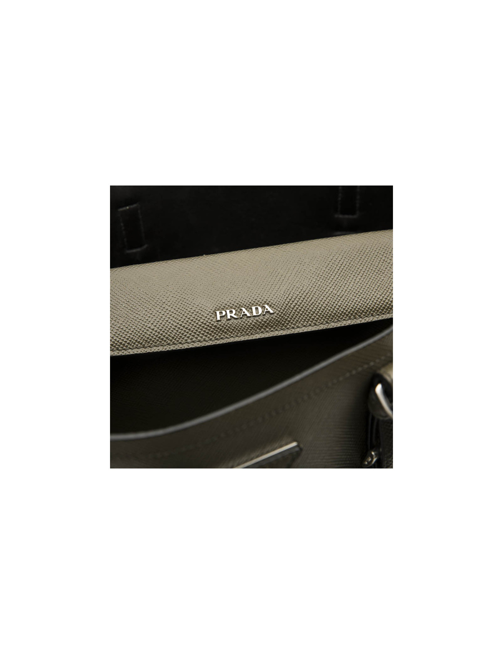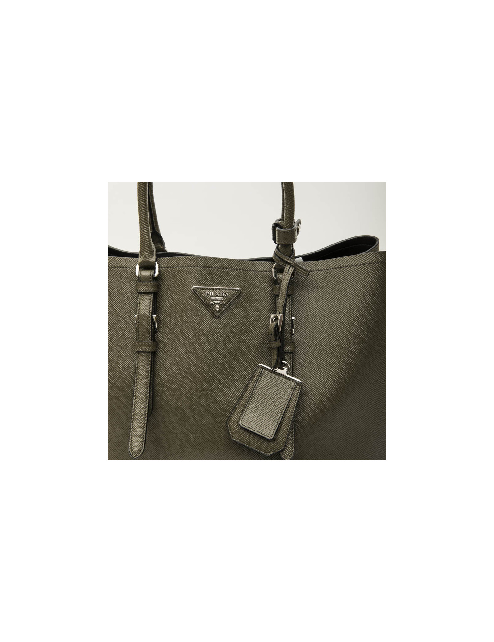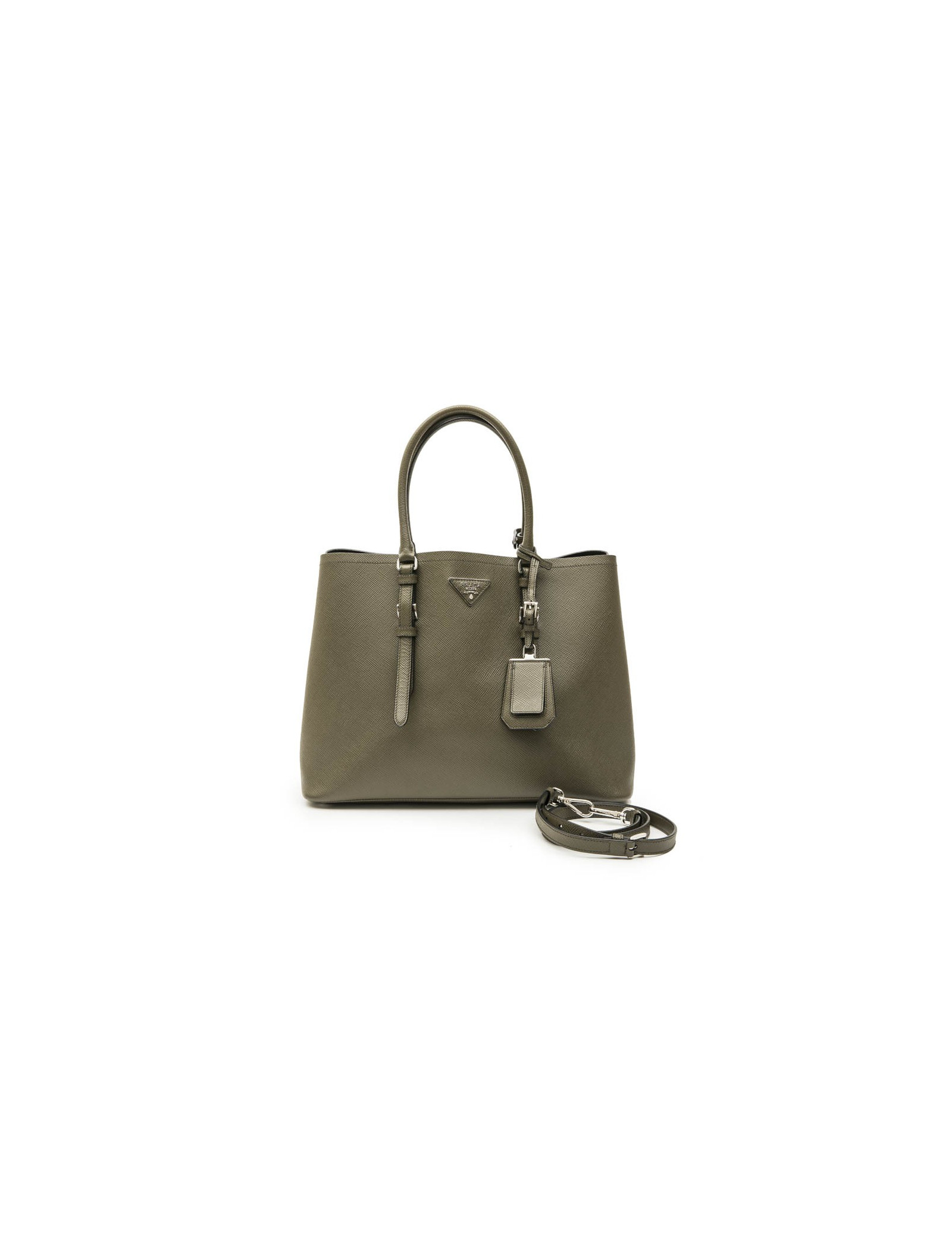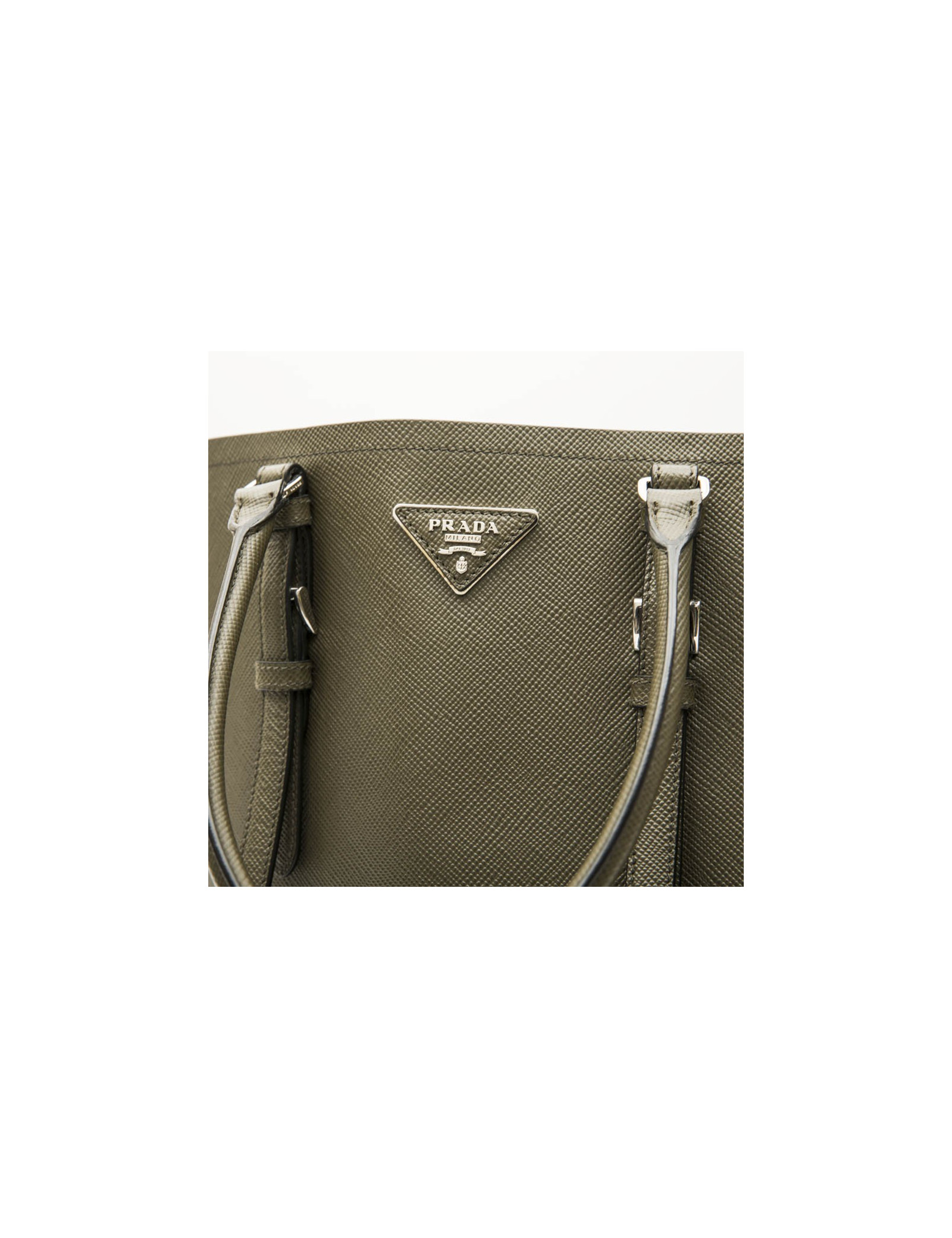 Sac double Prada en cuir Saffiano vert kaki, accastillage acier argent palladié. Deux soufflets séparés par une poche centrale. Porté à la main par 2 anses (13 cm) ou à l'épaule à l'aide d'une bandoulière amovible112/115 cm. Fermeture avec bouton pression sur les côtés. Il a un porte étiquette.