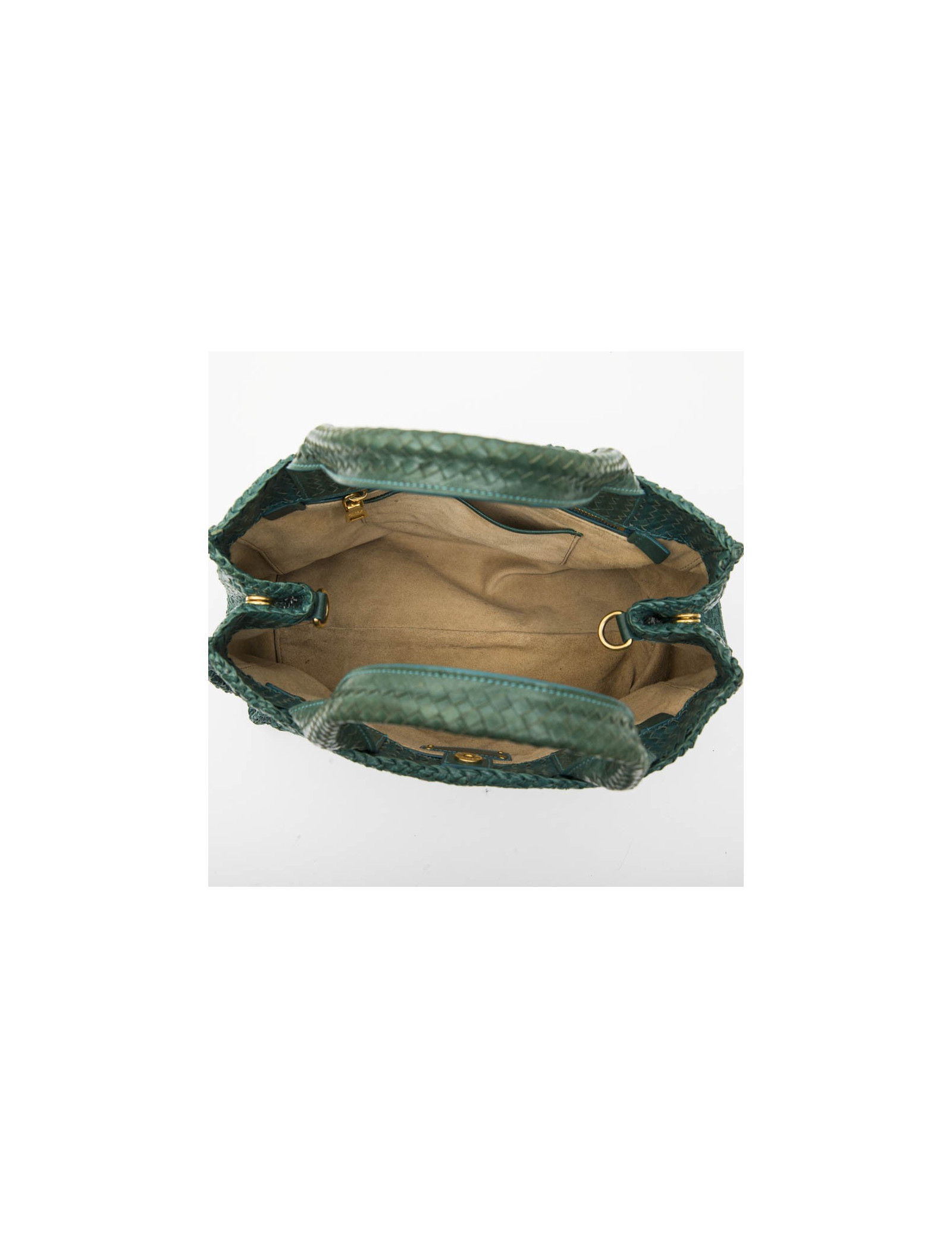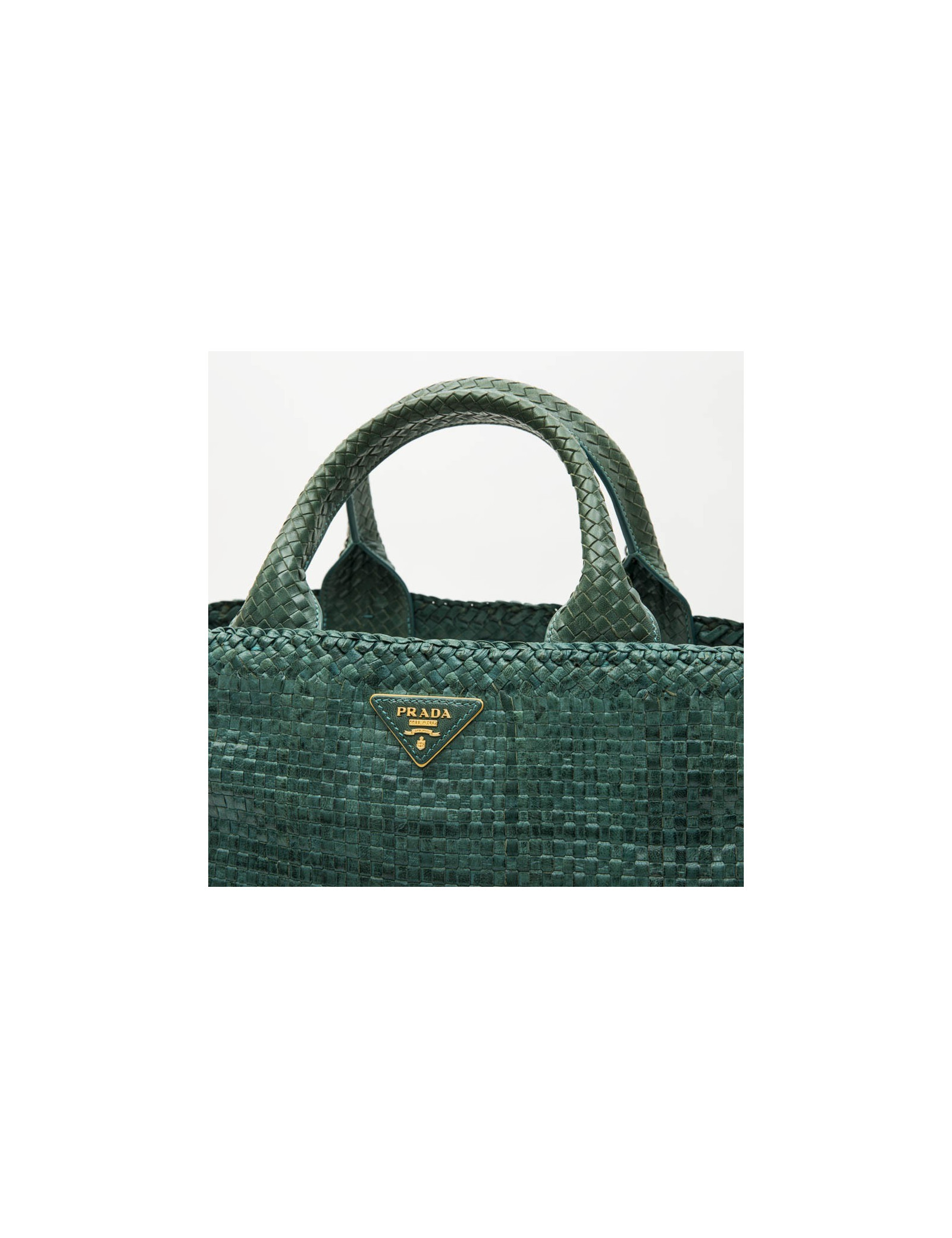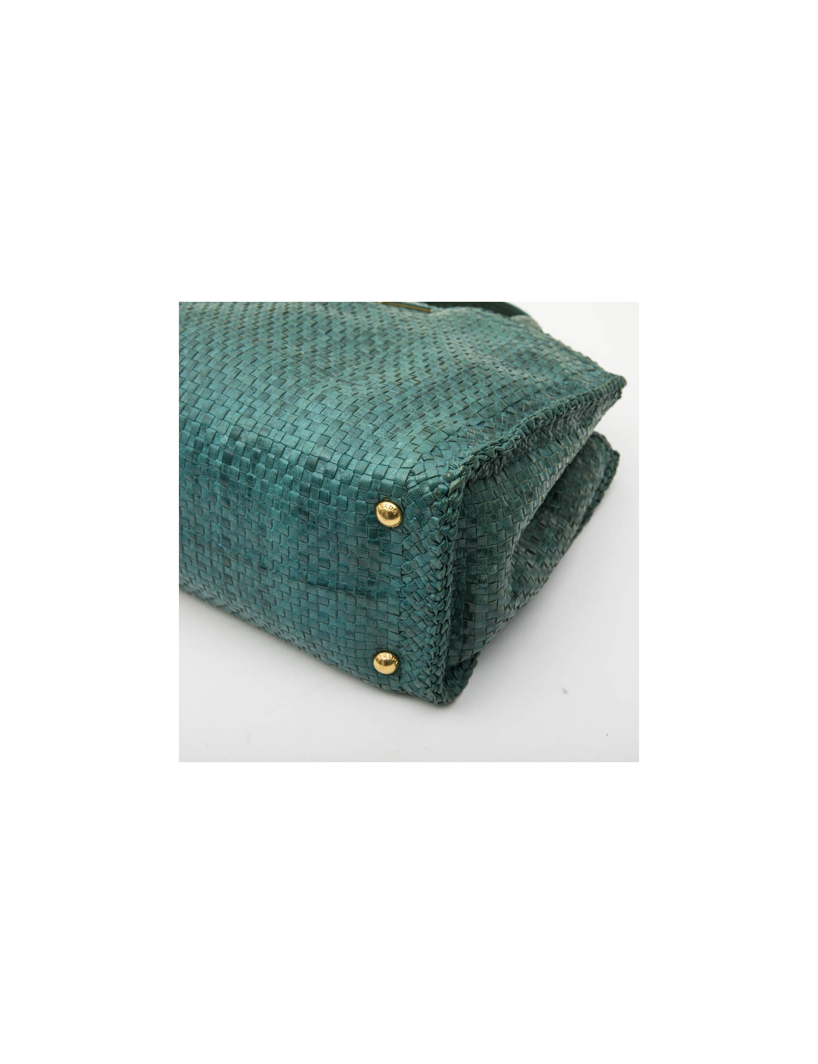 Sac shopping "Madras" Prada en cuir tressé vert paon. Bijouterie laiton doré. Fermeture par bouton pression. L'intérieur est en suède beige avec 3 poches dont 2 avec fermeture à glissière.