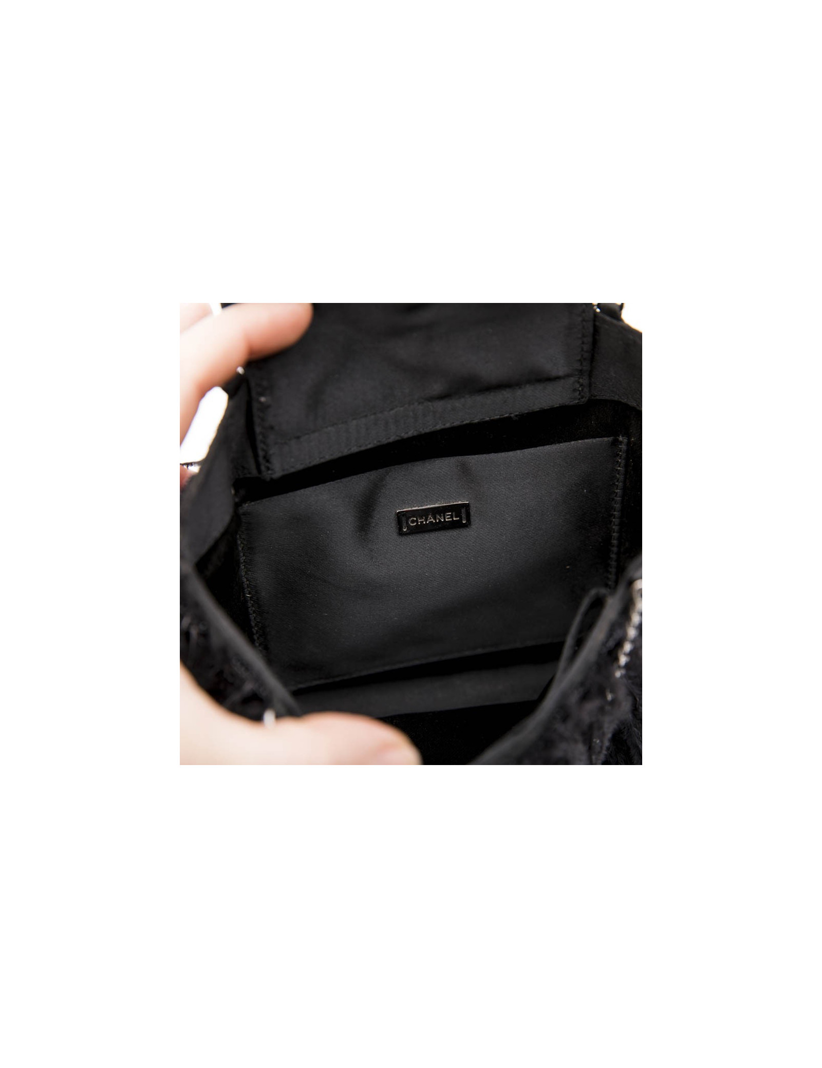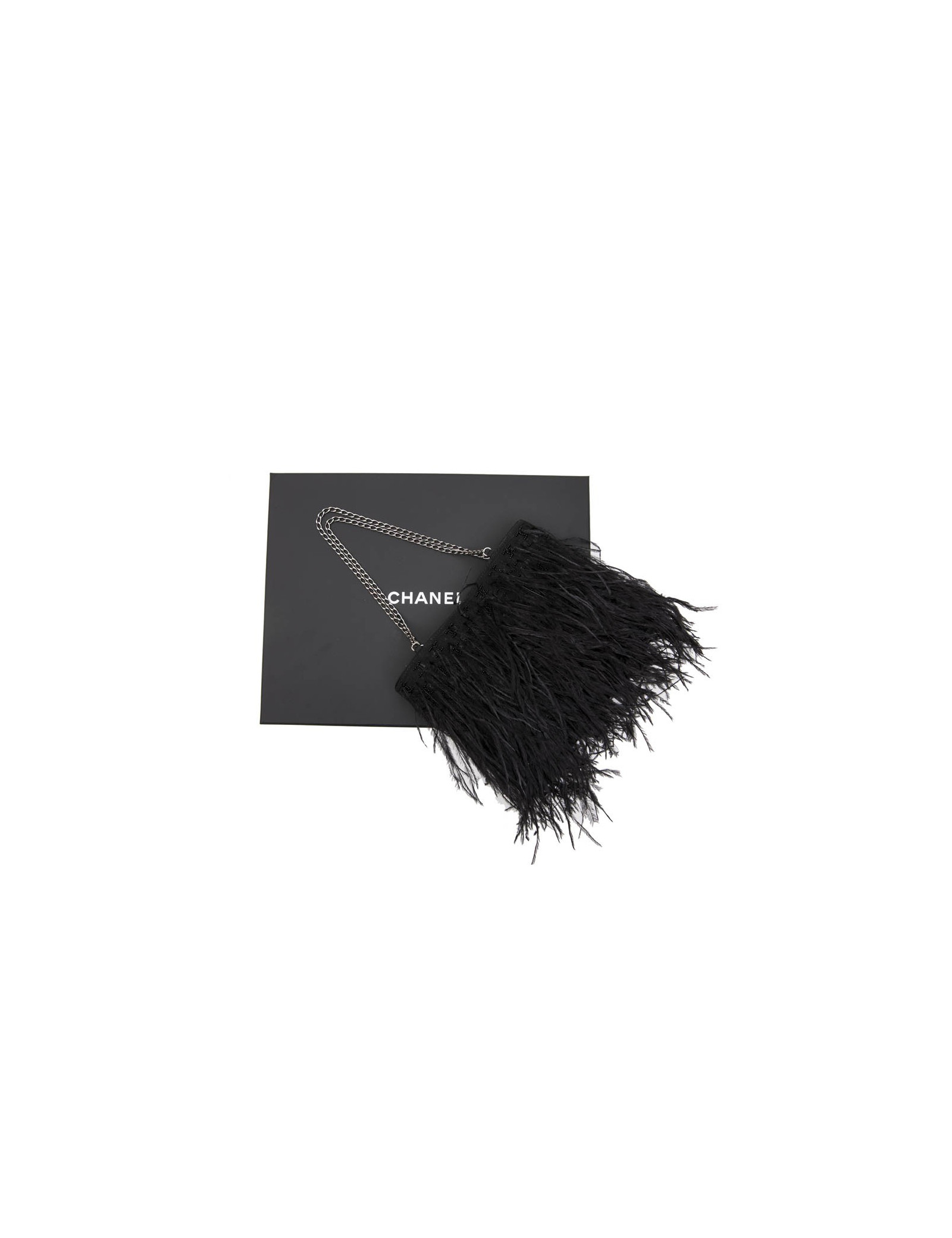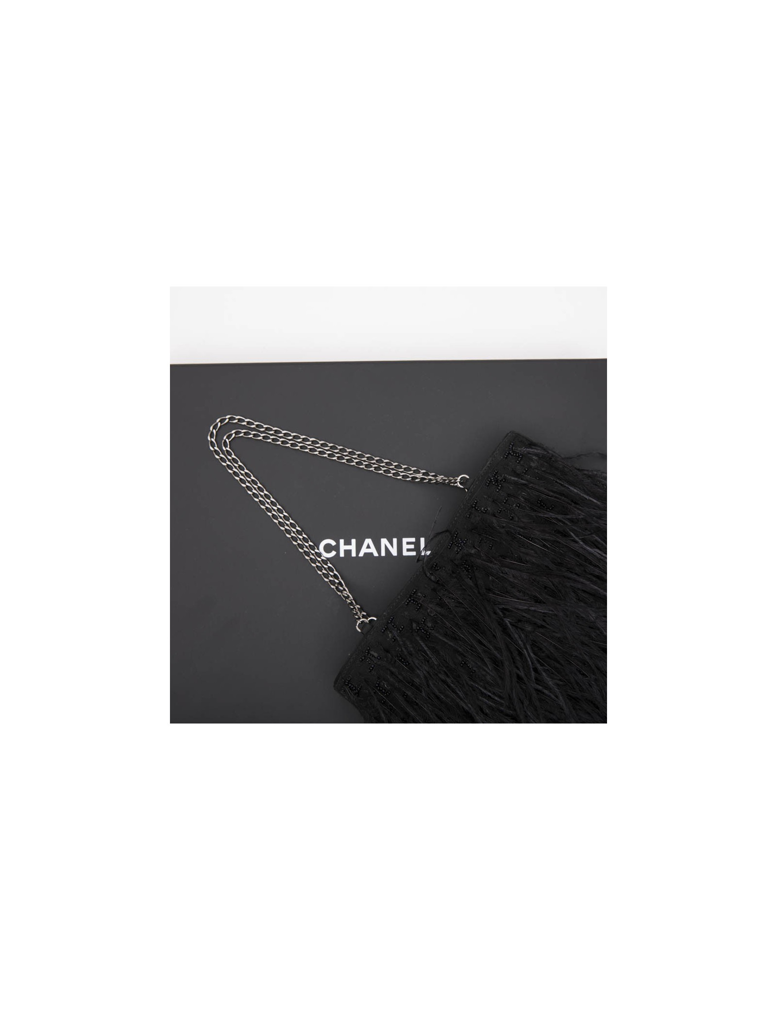 Mini sac du soir Chanel Couture en plumes noires et "CC" perlés noirs. Métallerie argent. L'intérieur est en satin noir. Fermeture aimantée. Pas de carte d'authenticité, ni d'hologramme. En très bon état.