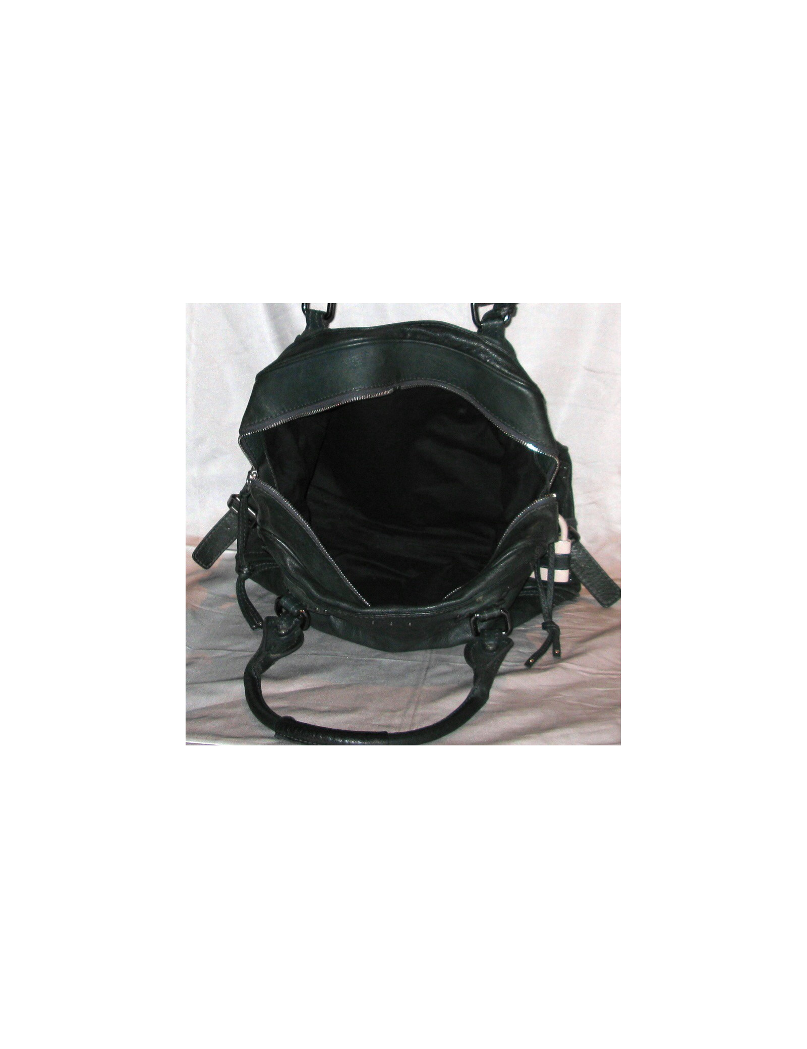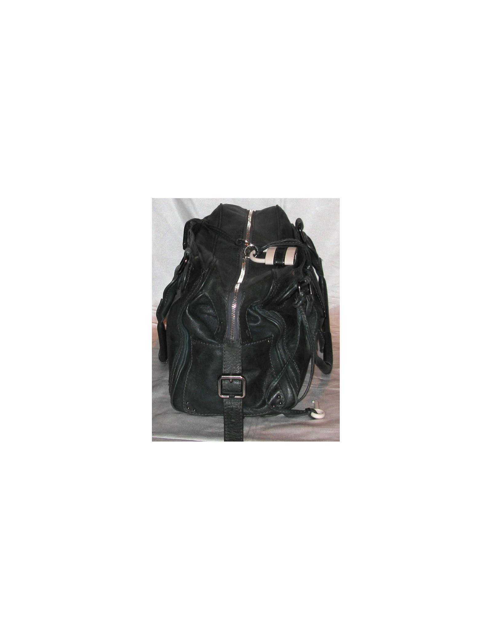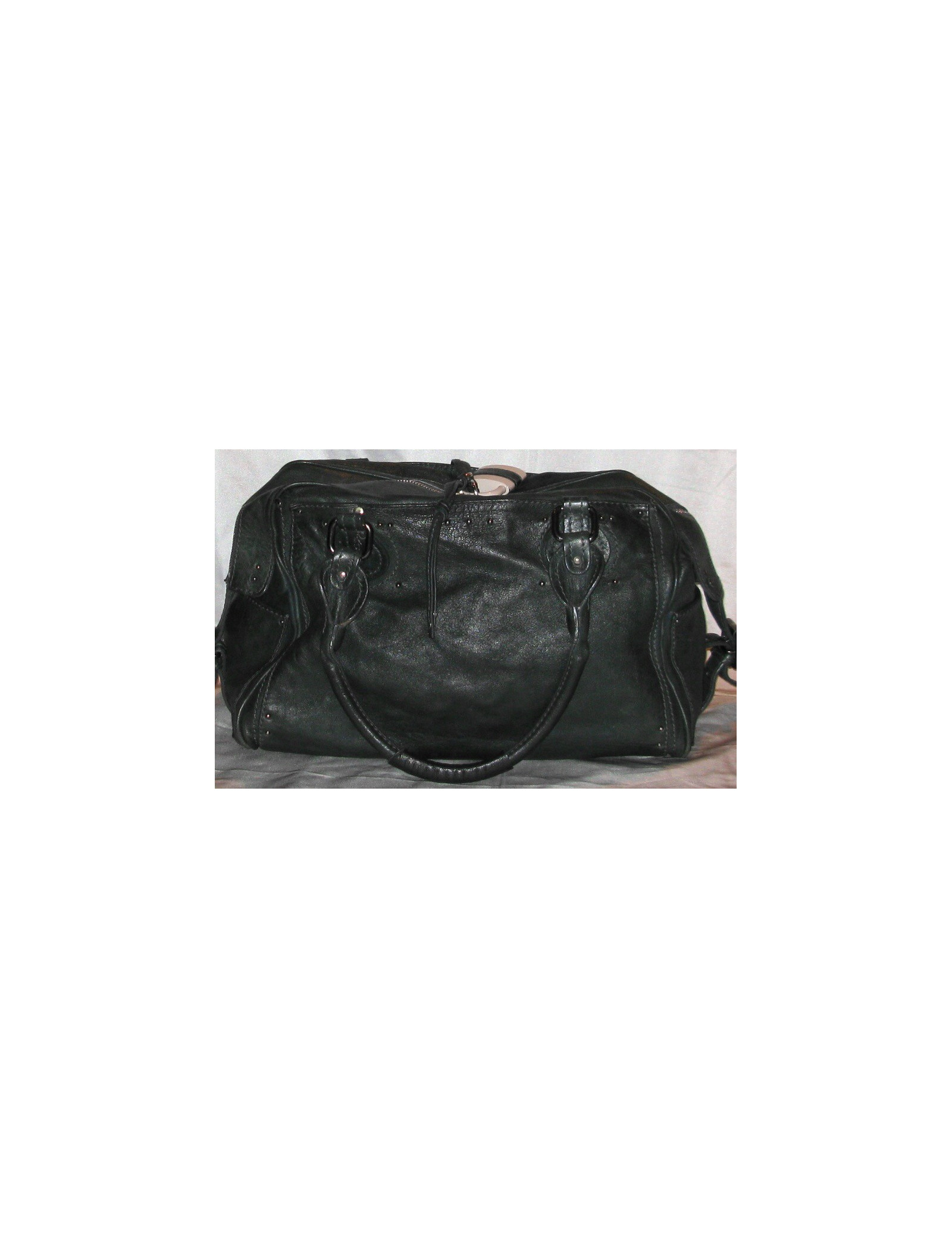 Sac CHLOE en cuir vert foncé avec un cadenas et une clé en métal beige. C'est un grand modèle. Il a une poche intérieure zippée et deux poches extérieures non zippées. La doublure intérieure est en tissu. La bijouterie est en métal argenté.