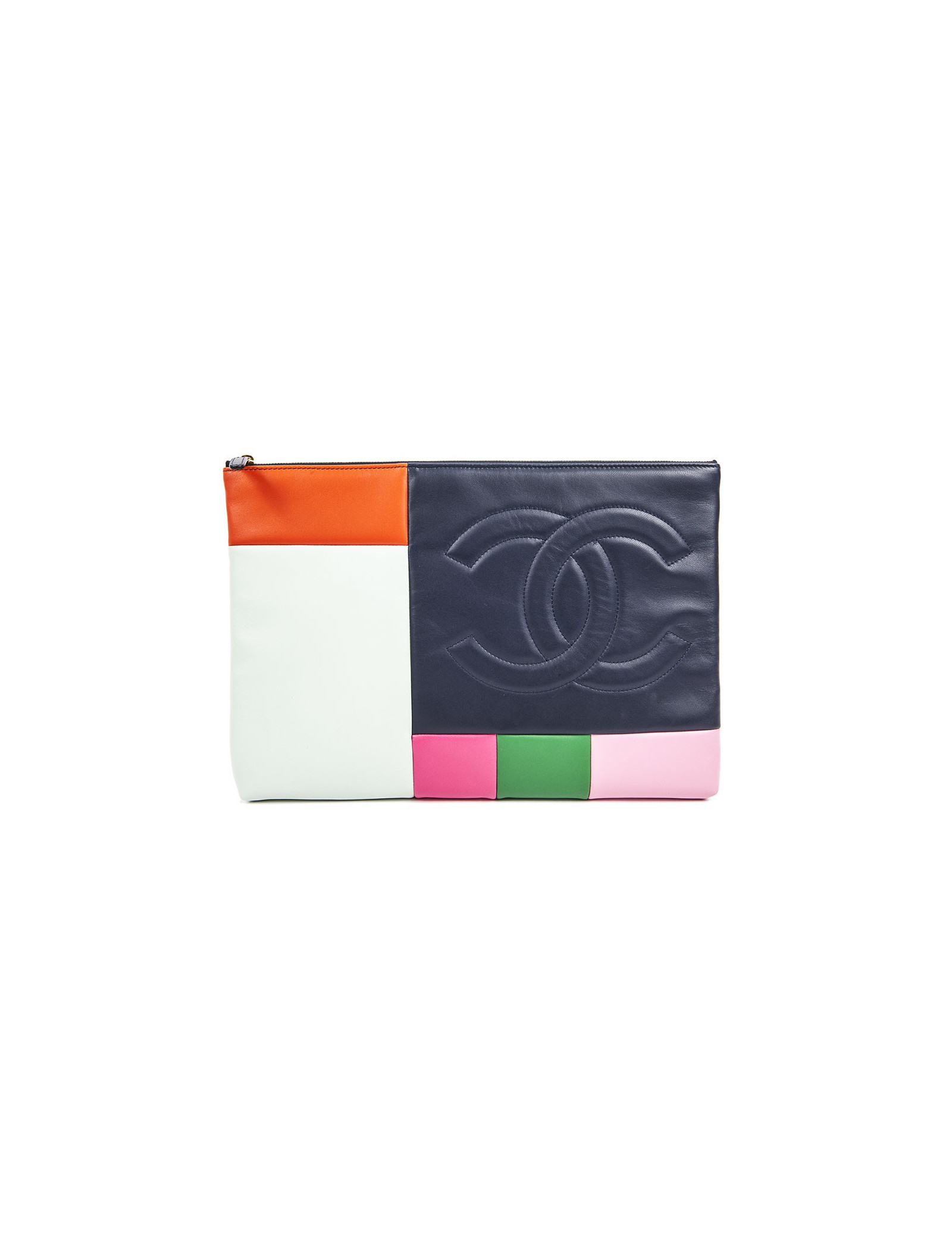 Pochette de la Maison Chanel en cuir d'agneau lisse multicolore. Fermeture zippée et dorée. L'intérieur est matelassé de couleur bleu. Hologramme: 217095... et sa carte d'authenticité.