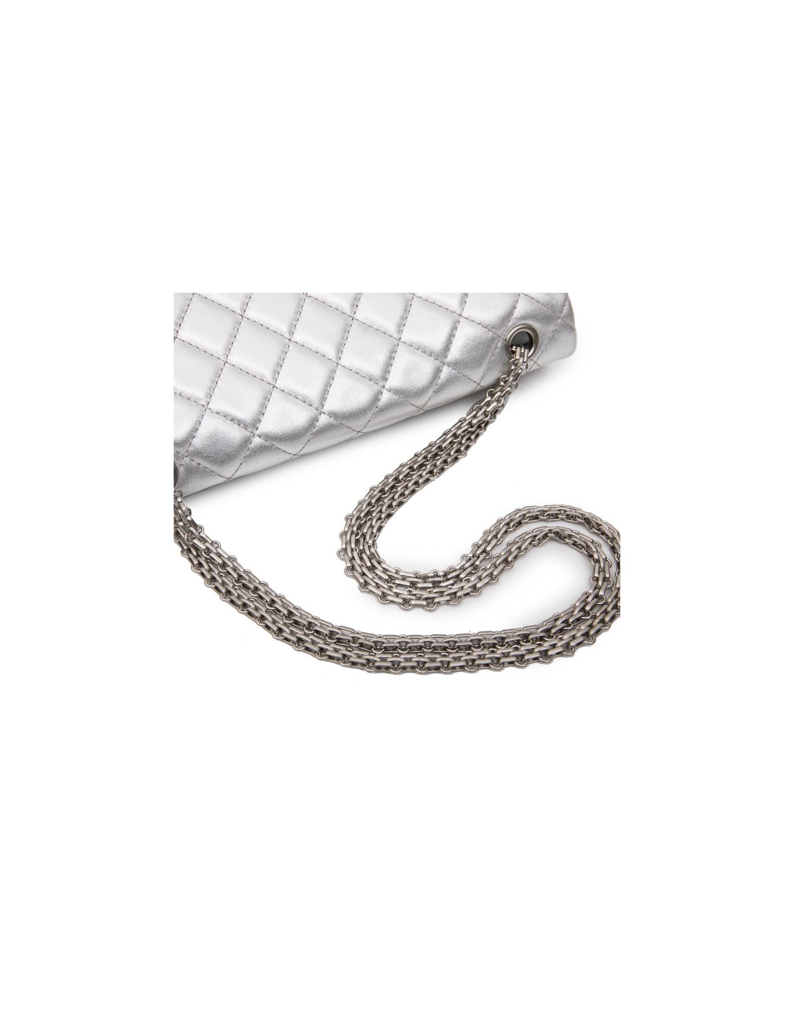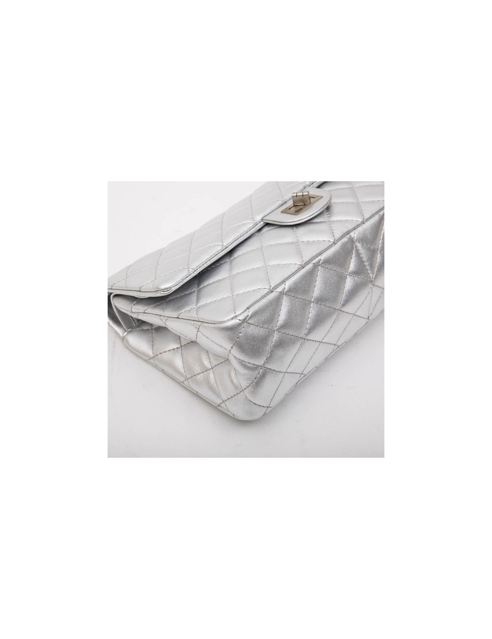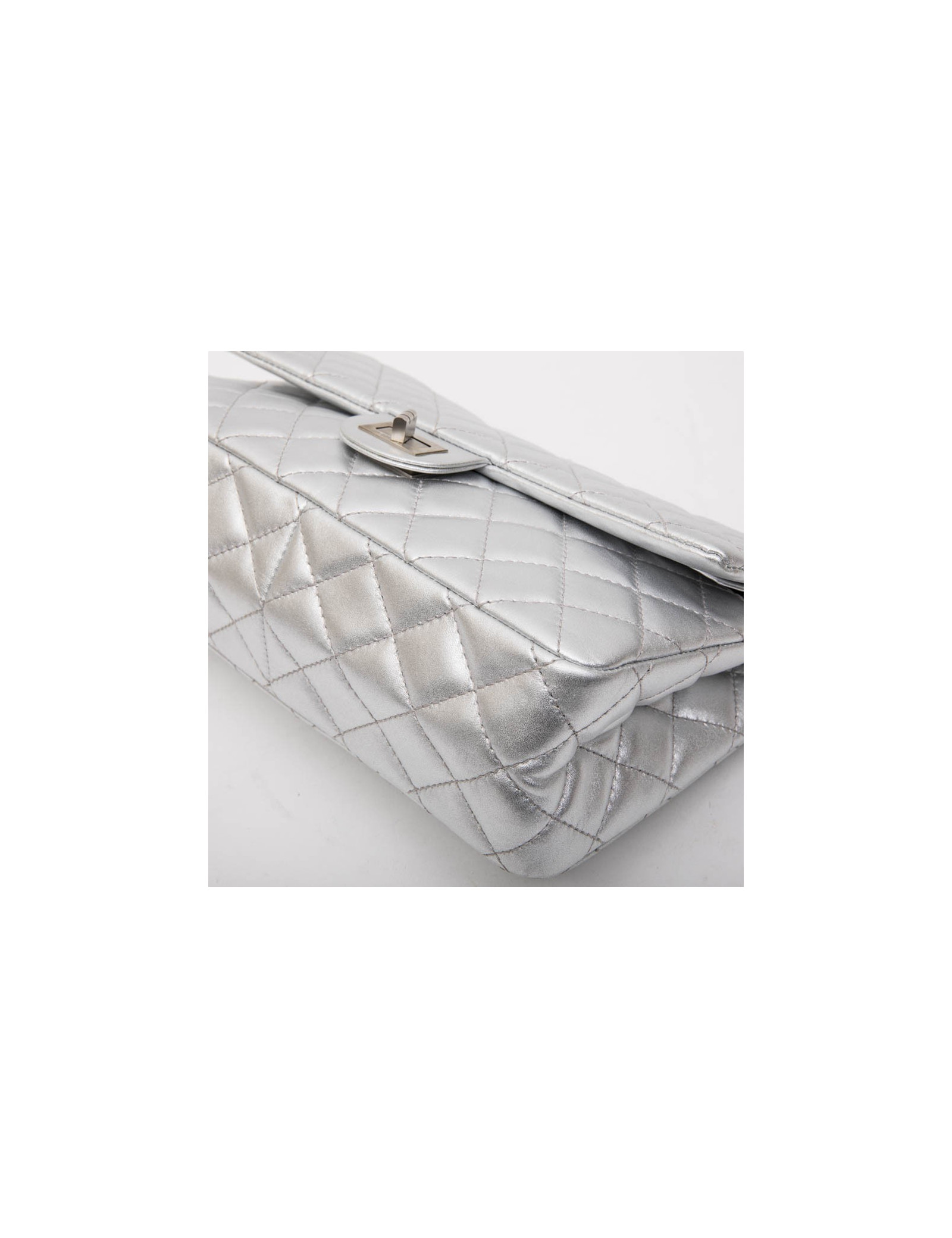Sac 'Timeless' Chanel en cuir matelassé argenté. Fermoir 2.55. Bijouterie argentée mate. Double rabat. L'intérieur est entièrement doublé en cuir argent. Made in France.