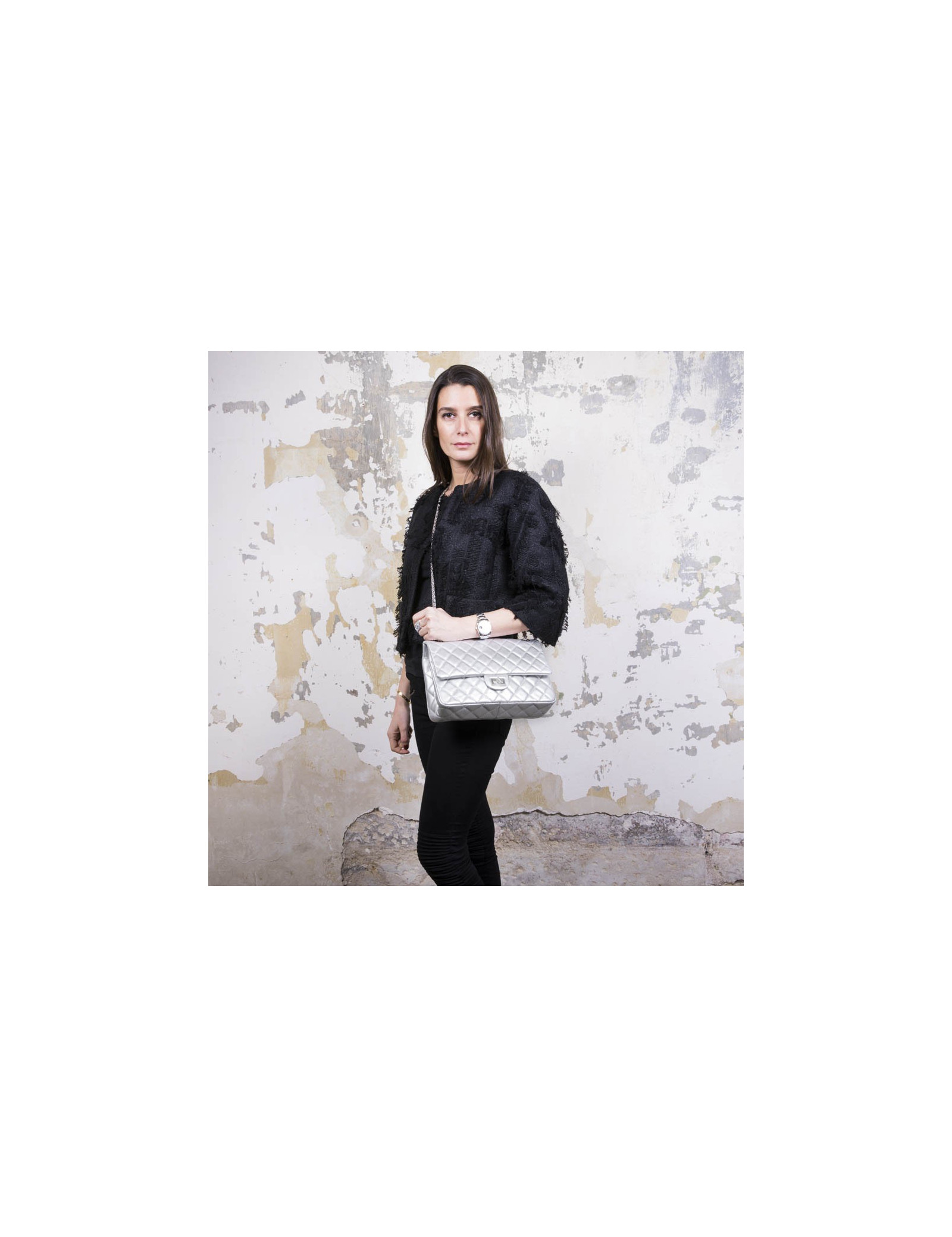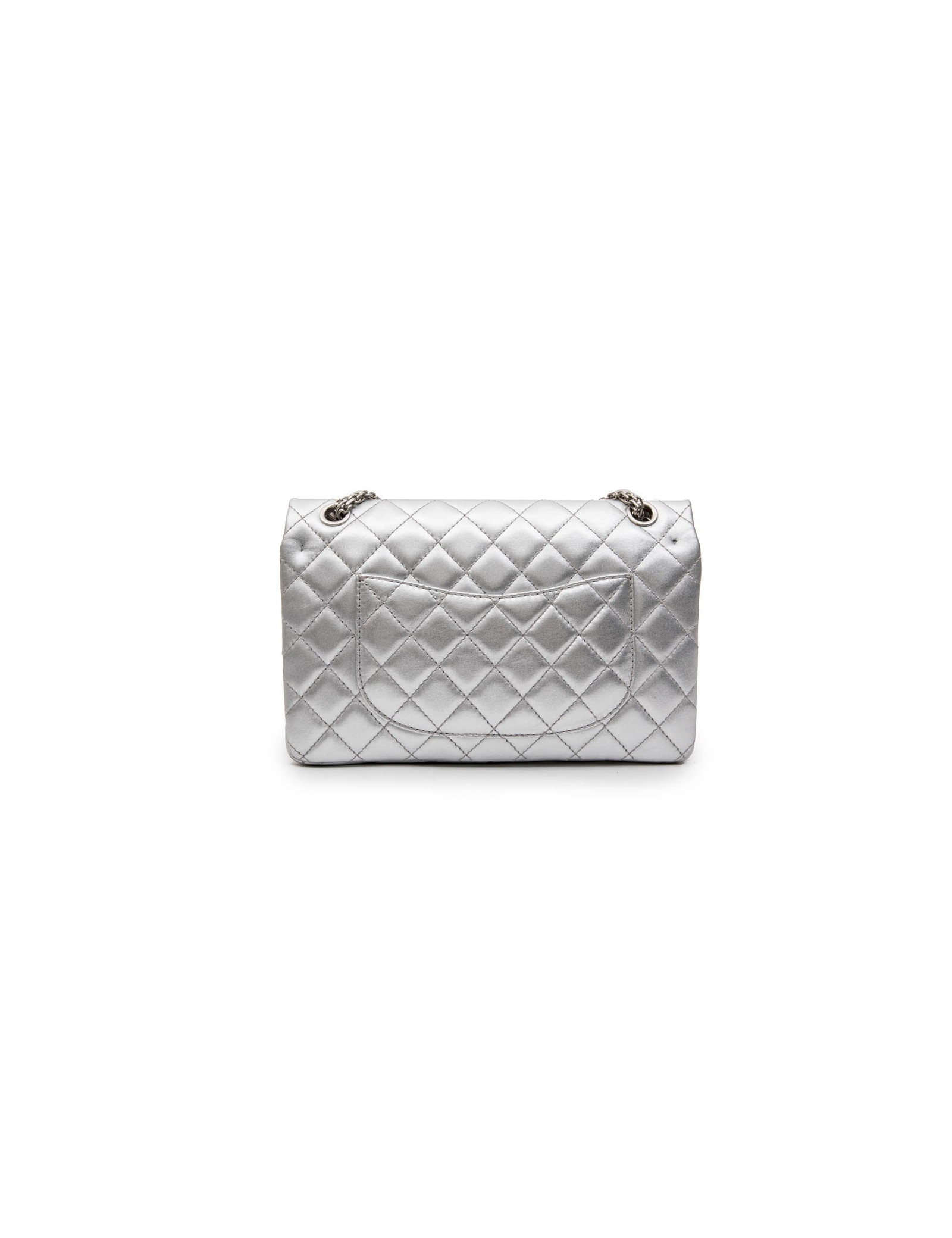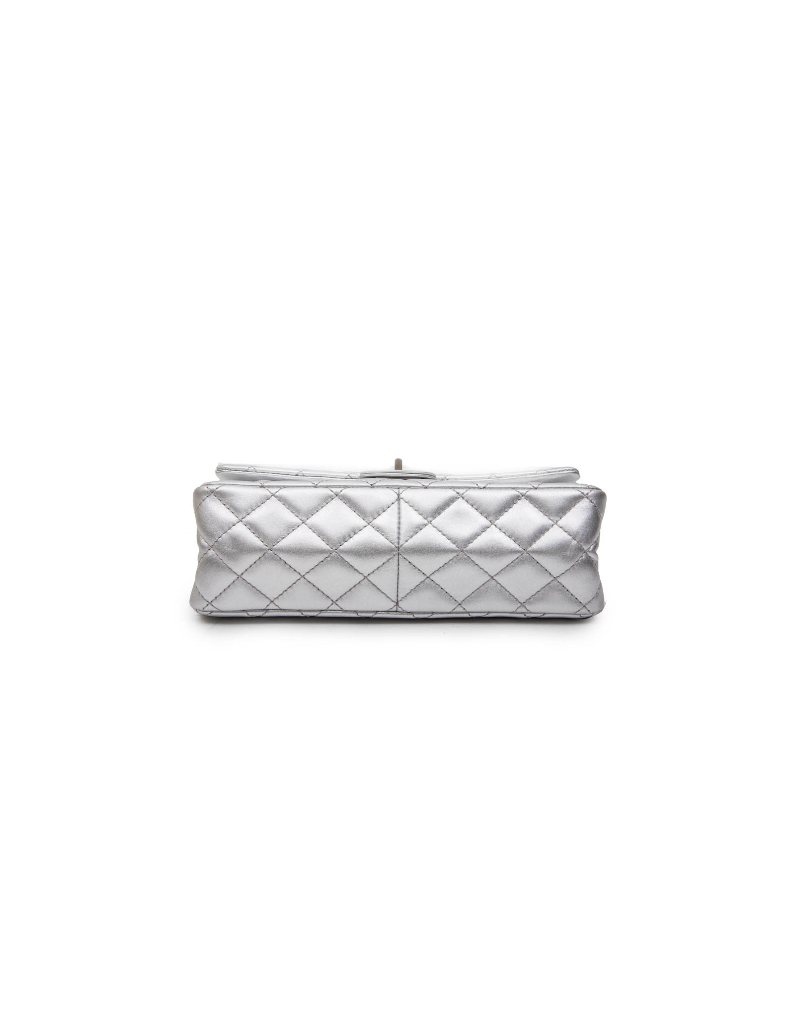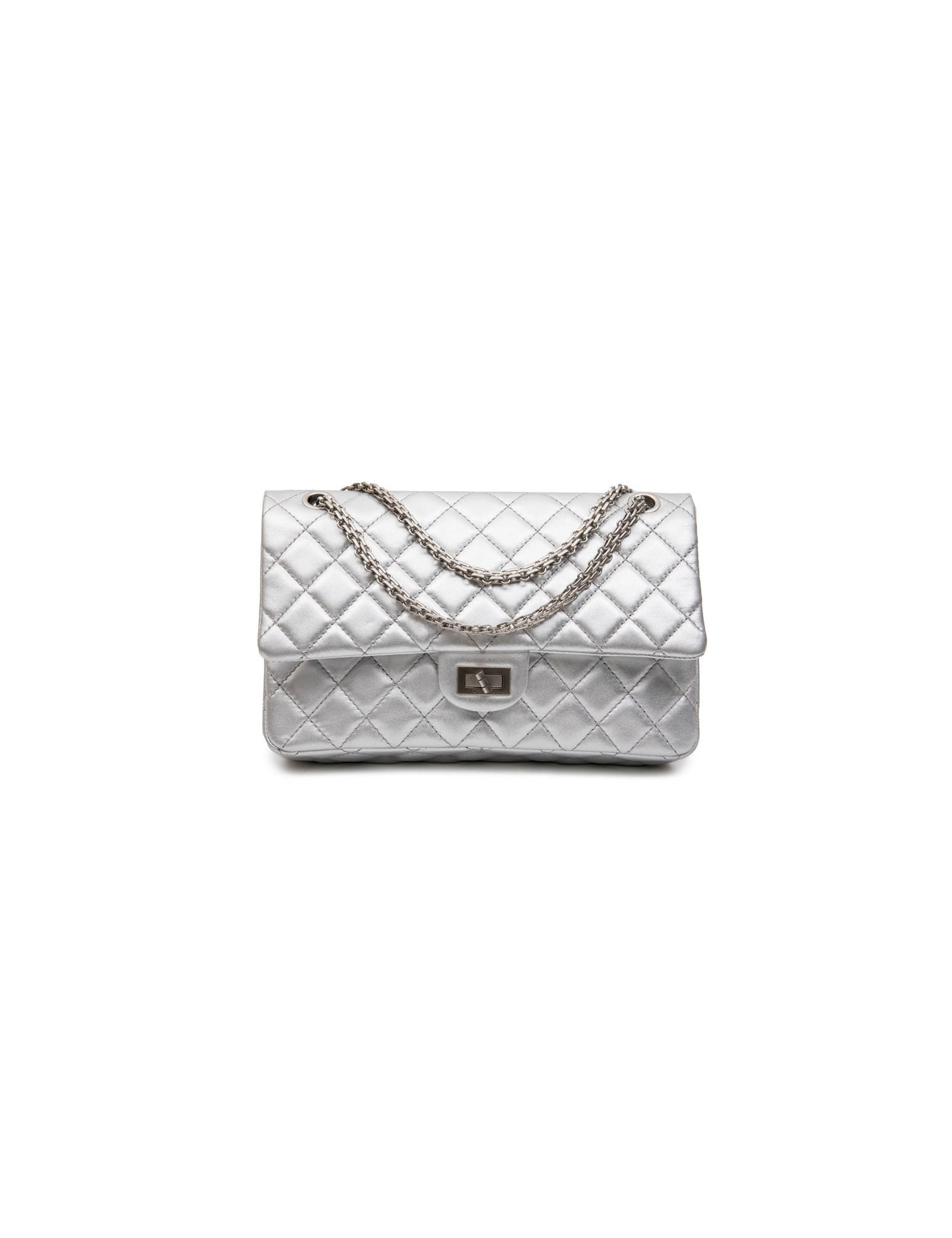 Sac 'Timeless' Chanel en cuir matelassé argenté. Fermoir 2.55. Bijouterie argentée mate. Double rabat. L'intérieur est entièrement doublé en cuir argent. Made in France.