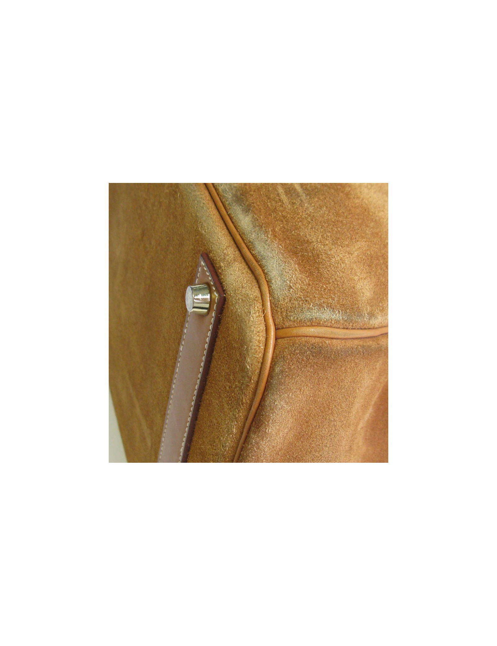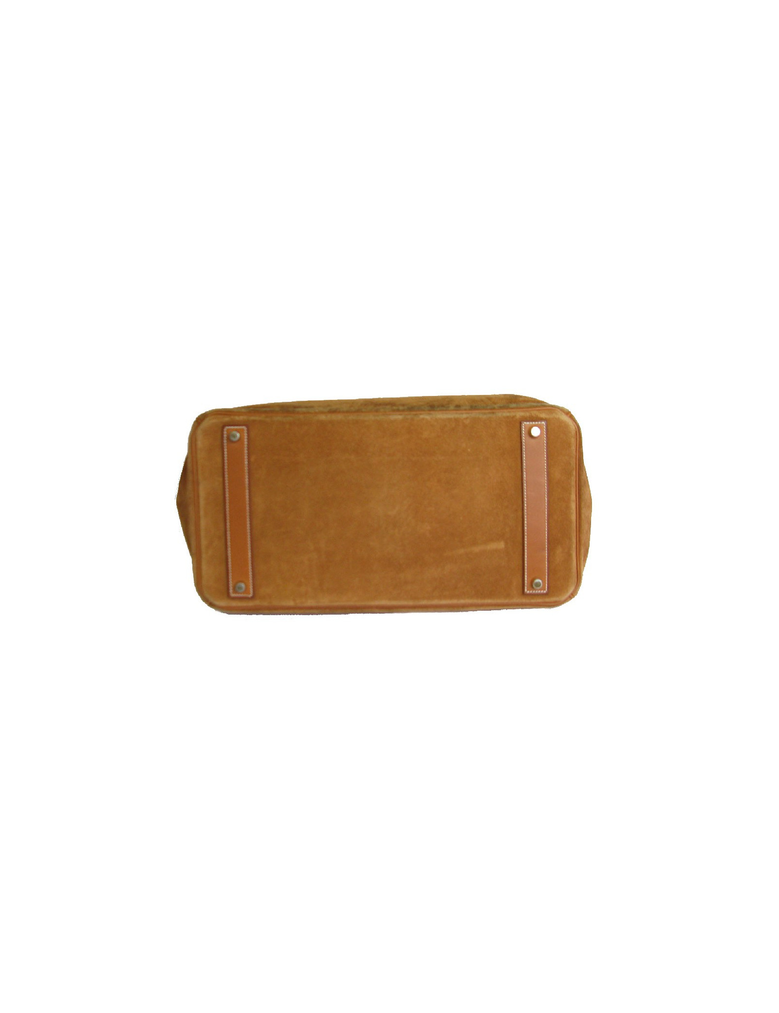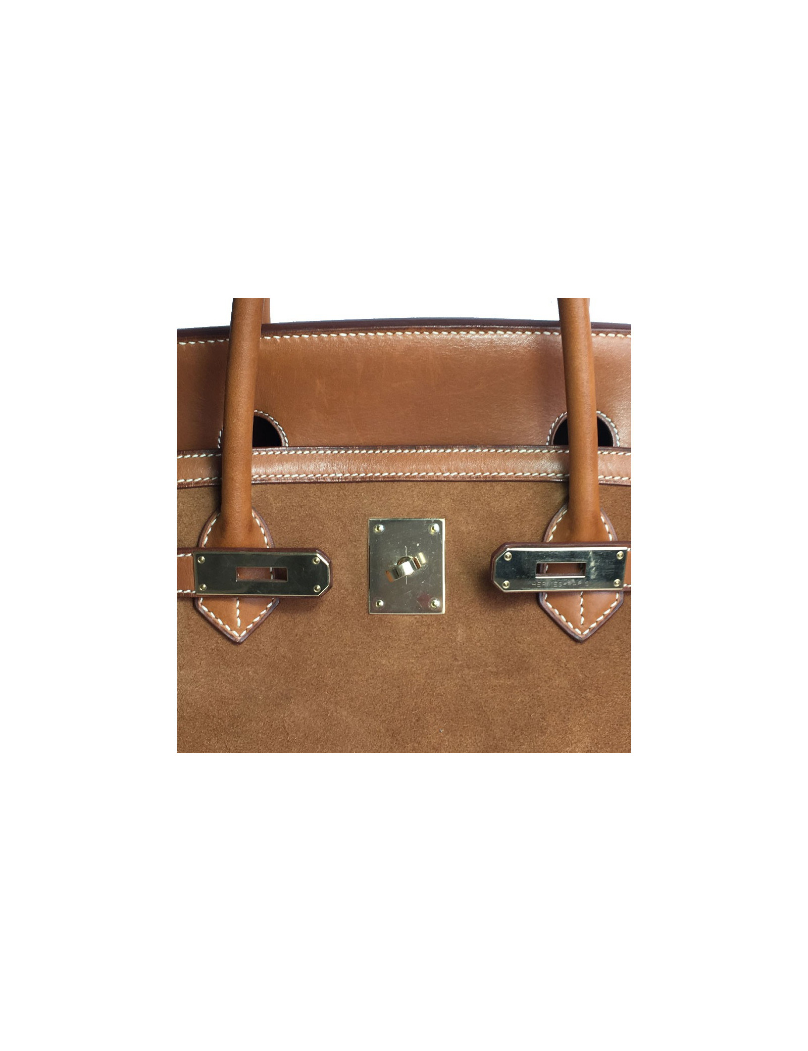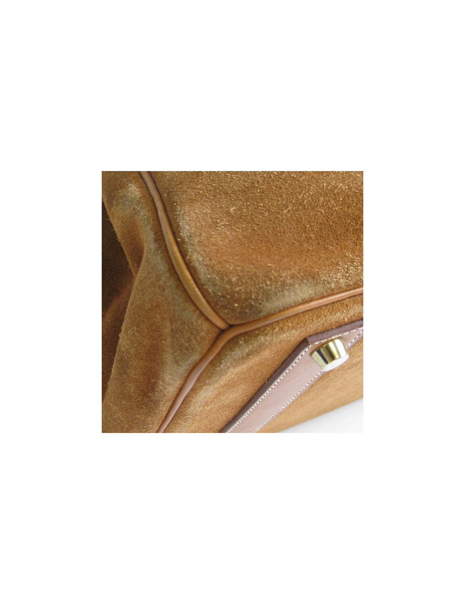 Édition limitée. Birkin 40, modèle Grizzly, Hermès en veau doblis (daim) et cuir barenia de couleur fauve, bijouterie couleur permabrass (doré pâle). Pas de cadenas, ni de clés, ni de clochette.Année 2012 (P dans un carré). L’intérieur est en toile chevron (impeccable) et en cuir barenia.