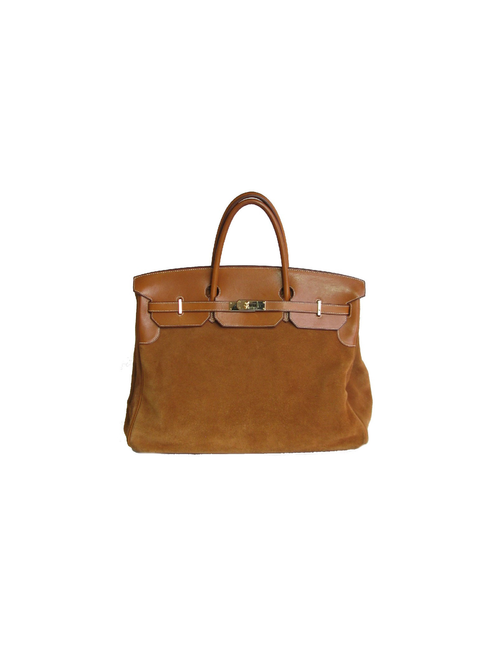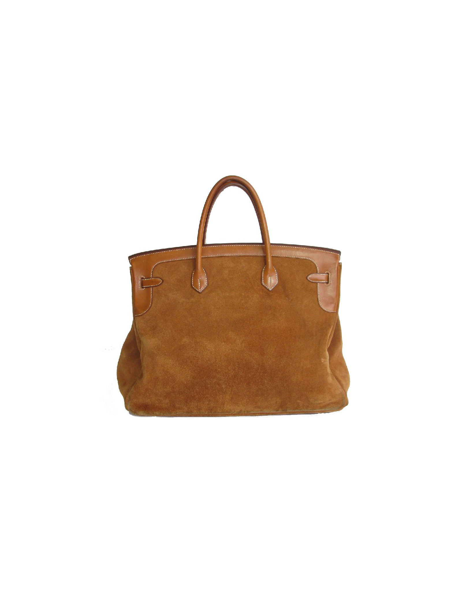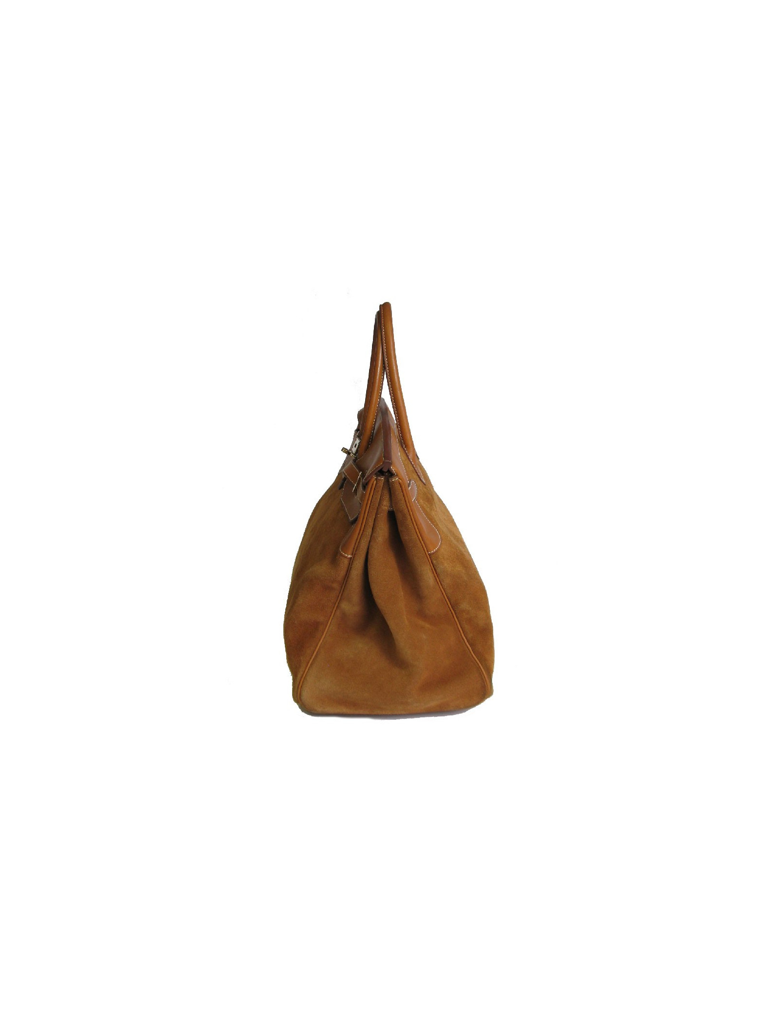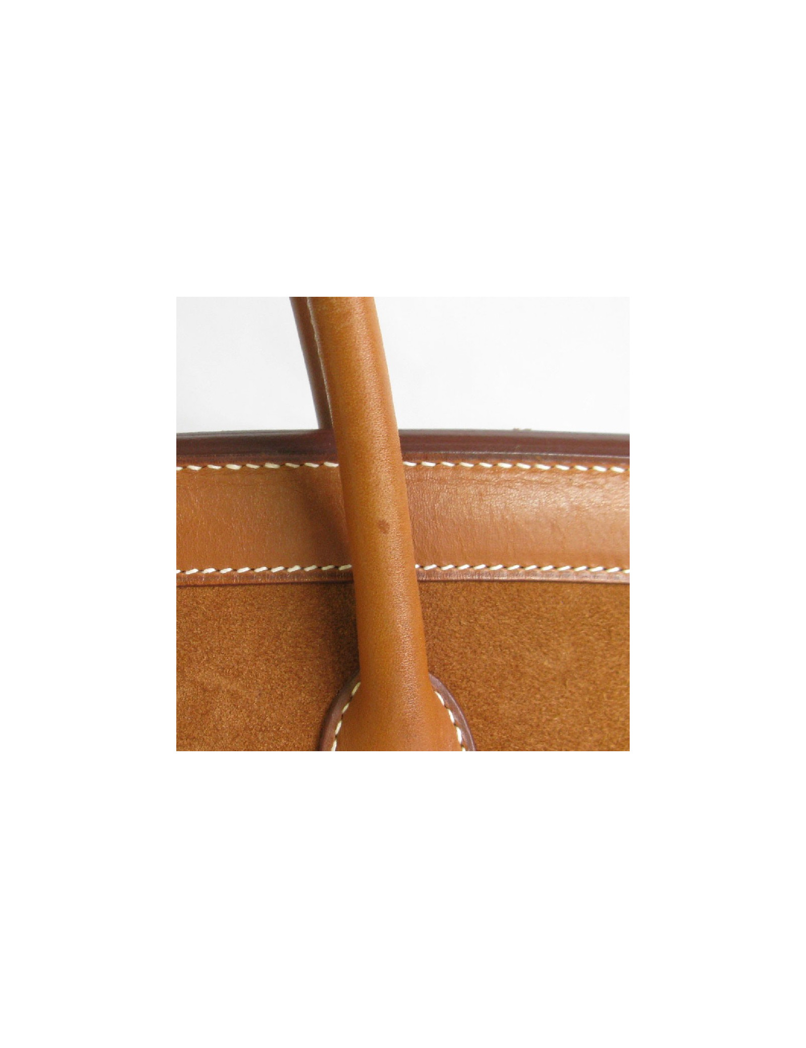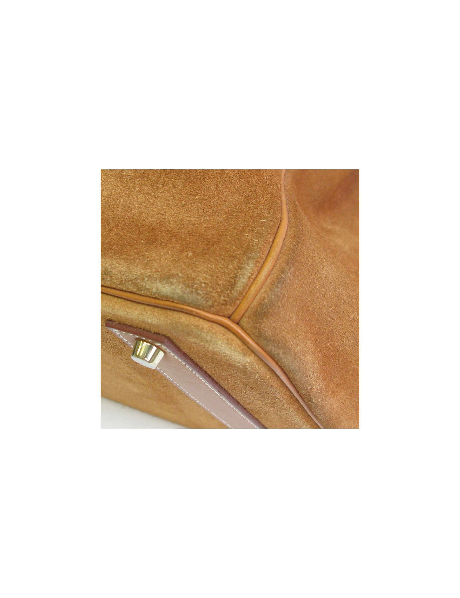 Édition limitée. Birkin 40, modèle Grizzly, Hermès en veau doblis (daim) et cuir barenia de couleur fauve, bijouterie couleur permabrass (doré pâle). Pas de cadenas, ni de clés, ni de clochette.Année 2012 (P dans un carré). L’intérieur est en toile chevron (impeccable) et en cuir barenia.