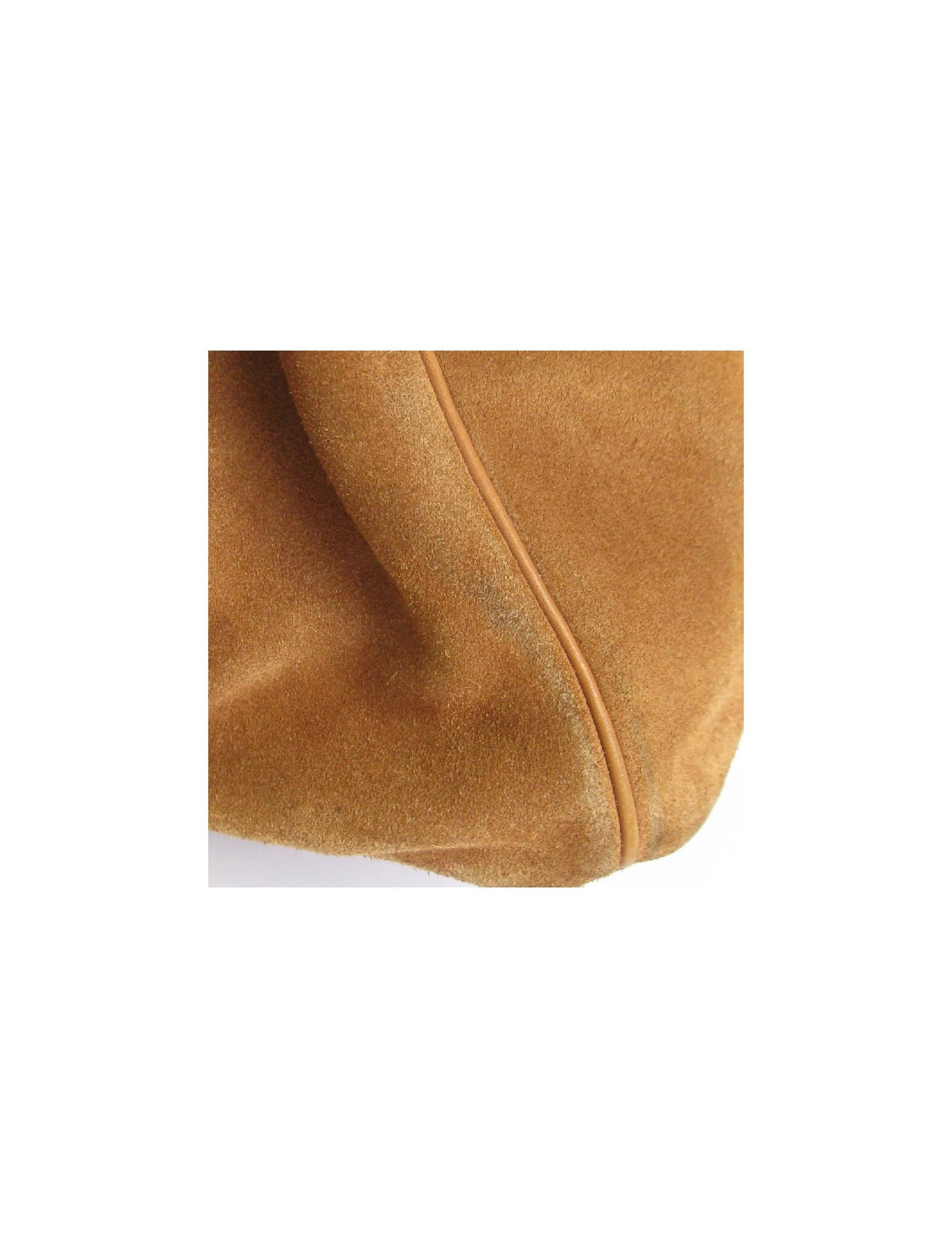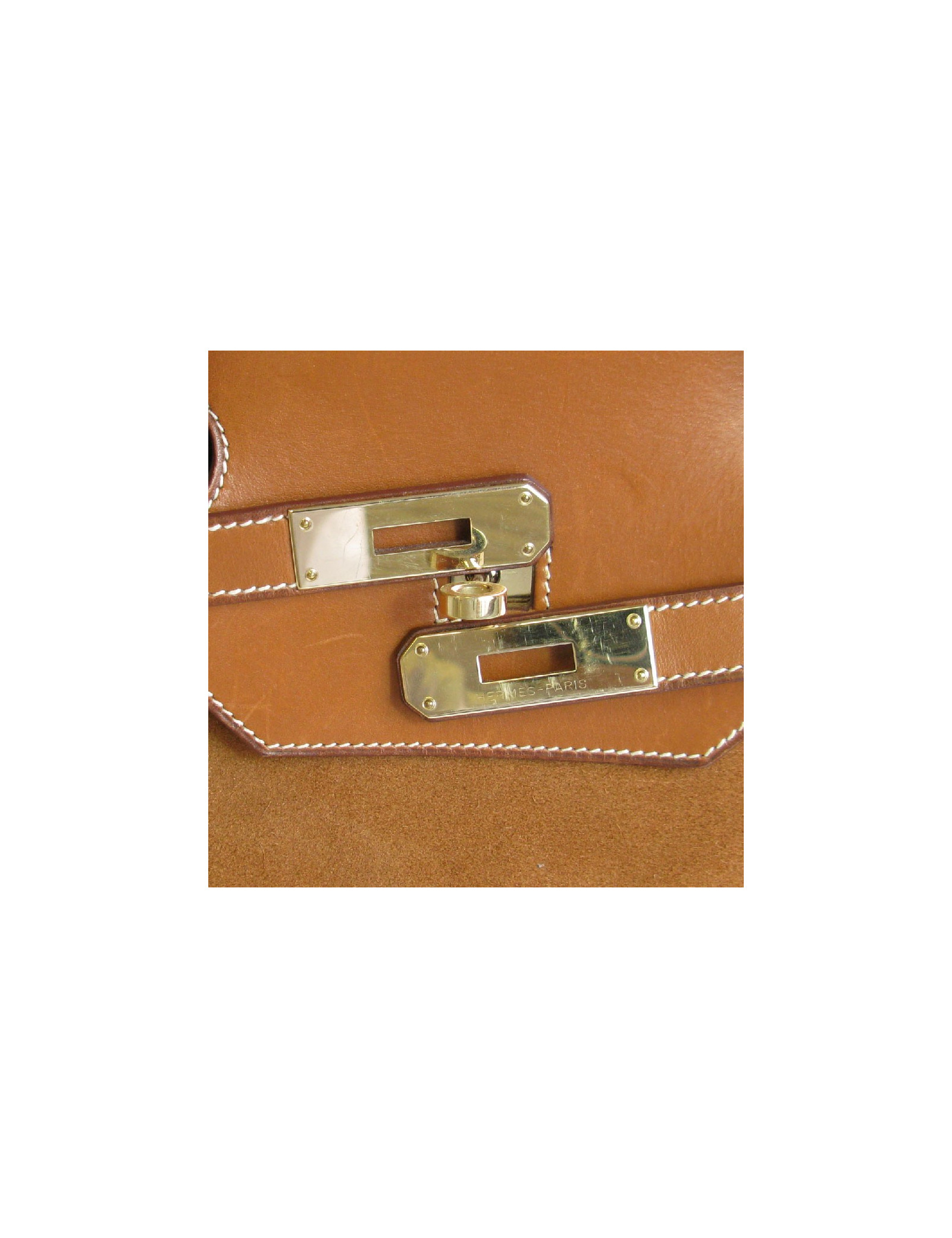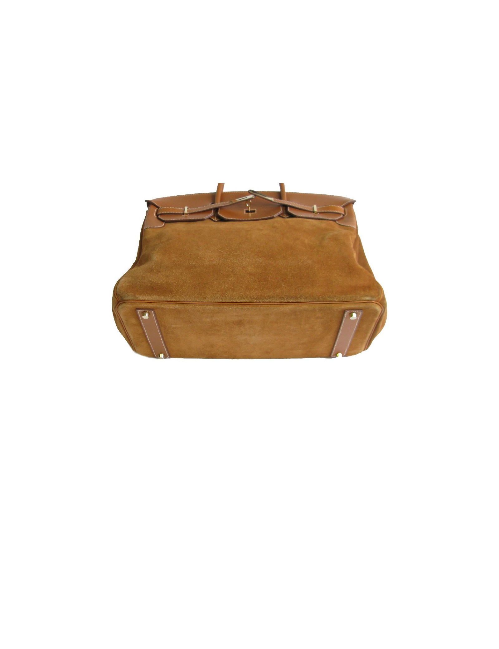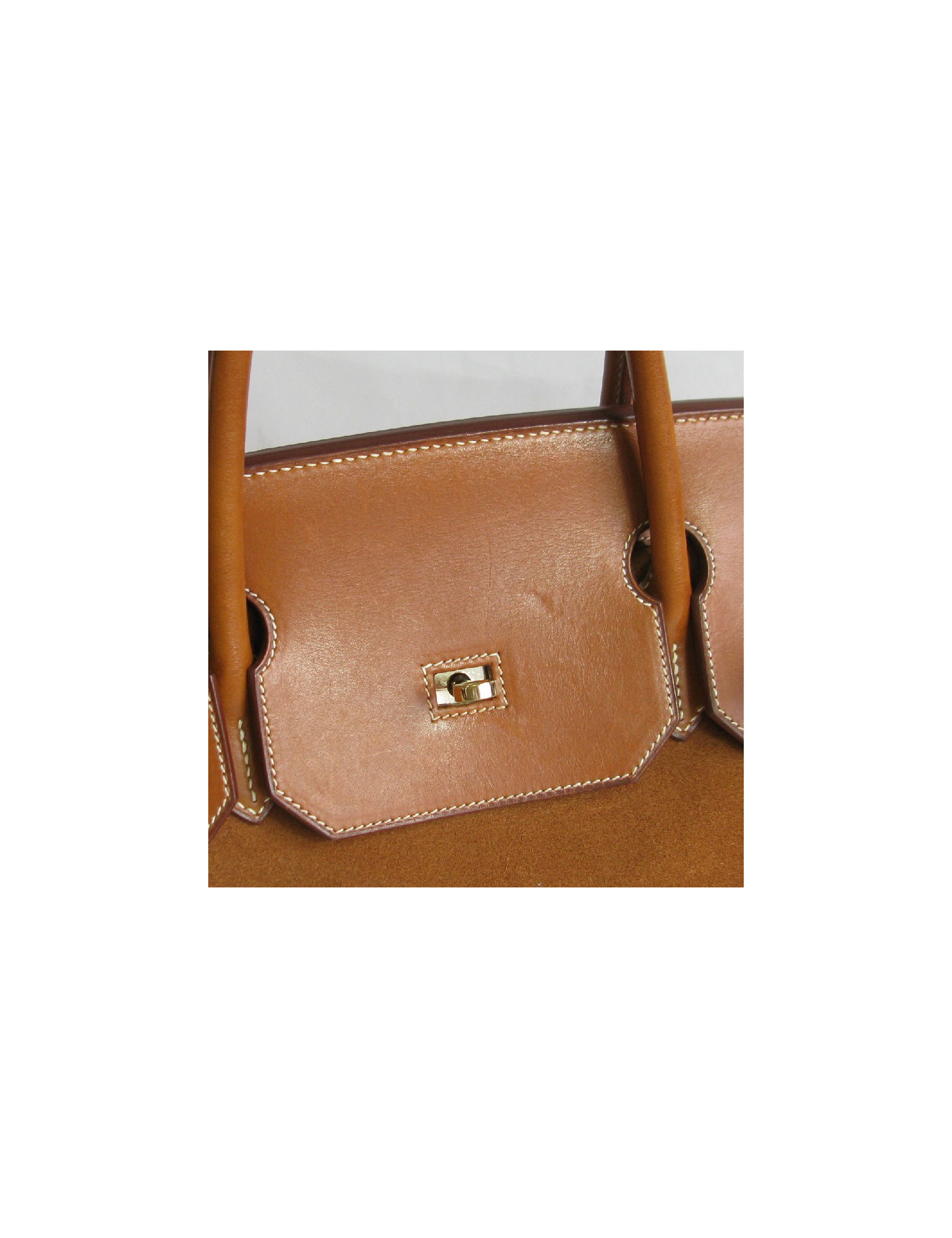 Édition limitée. Birkin 40, modèle Grizzly, Hermès en veau doblis (daim) et cuir barenia de couleur fauve, bijouterie couleur permabrass (doré pâle). Pas de cadenas, ni de clés, ni de clochette.Année 2012 (P dans un carré). L’intérieur est en toile chevron (impeccable) et en cuir barenia.