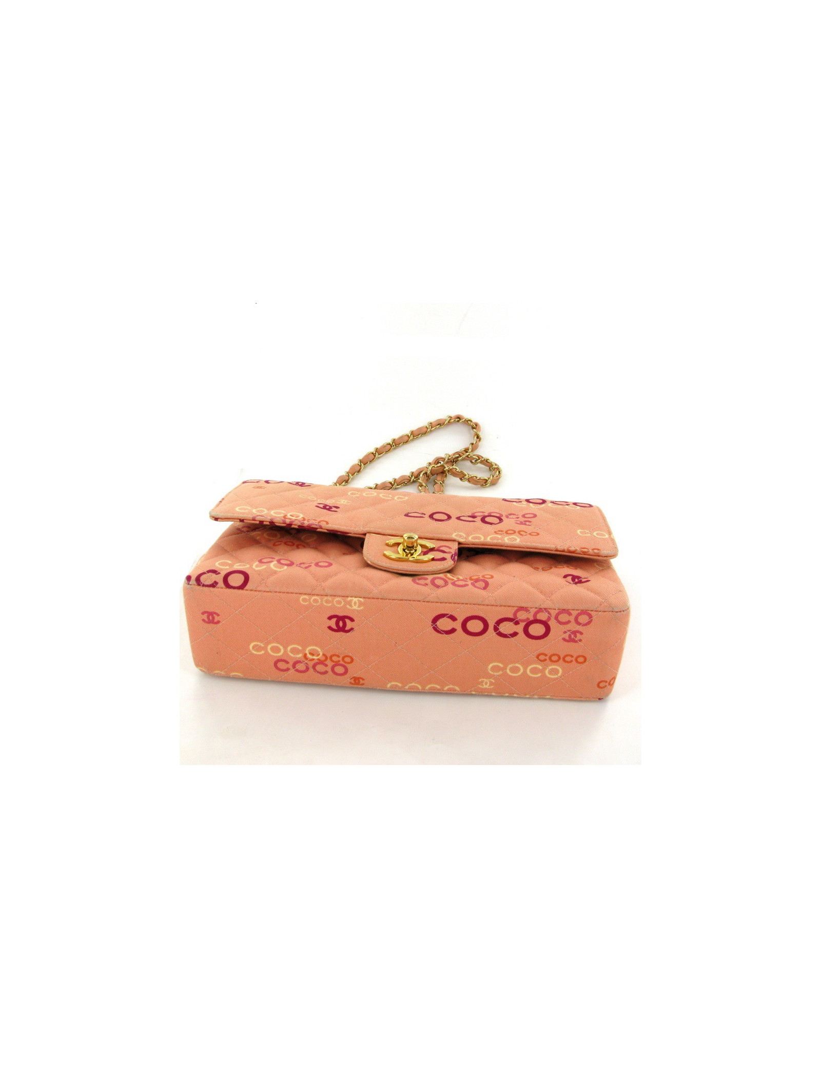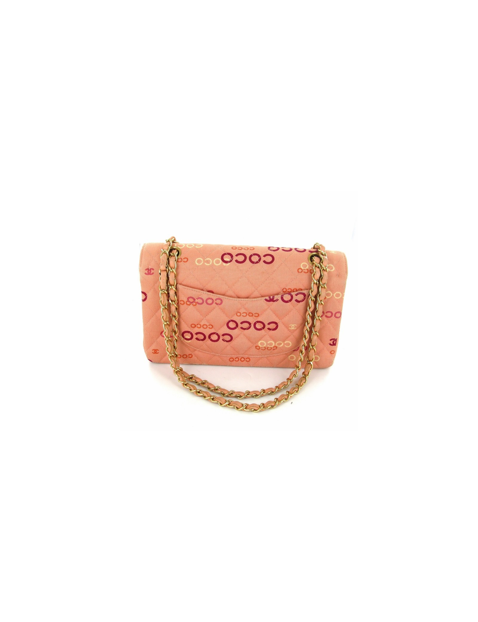 Sac CHANEL collector en toile rose. Les ferrures sont dorées. La couleur des inscriptions est rose, jaune, rouge. La chaîne est en métal doré et cuir. Le sac possède un double rabat. L'intérieur est en cuir rose et il y a 4 poches ouvertes. Les bords du sac sont légèrement blanchis.
