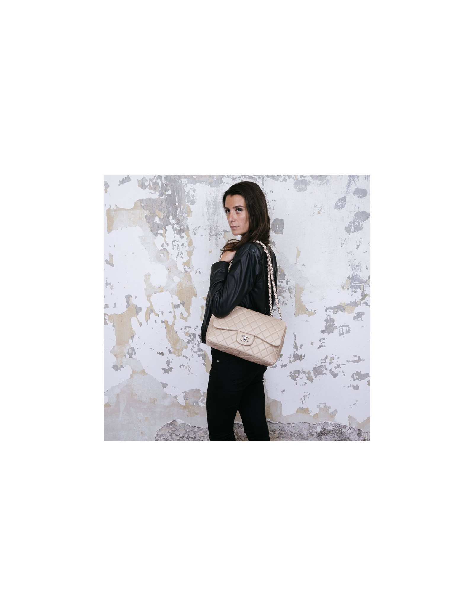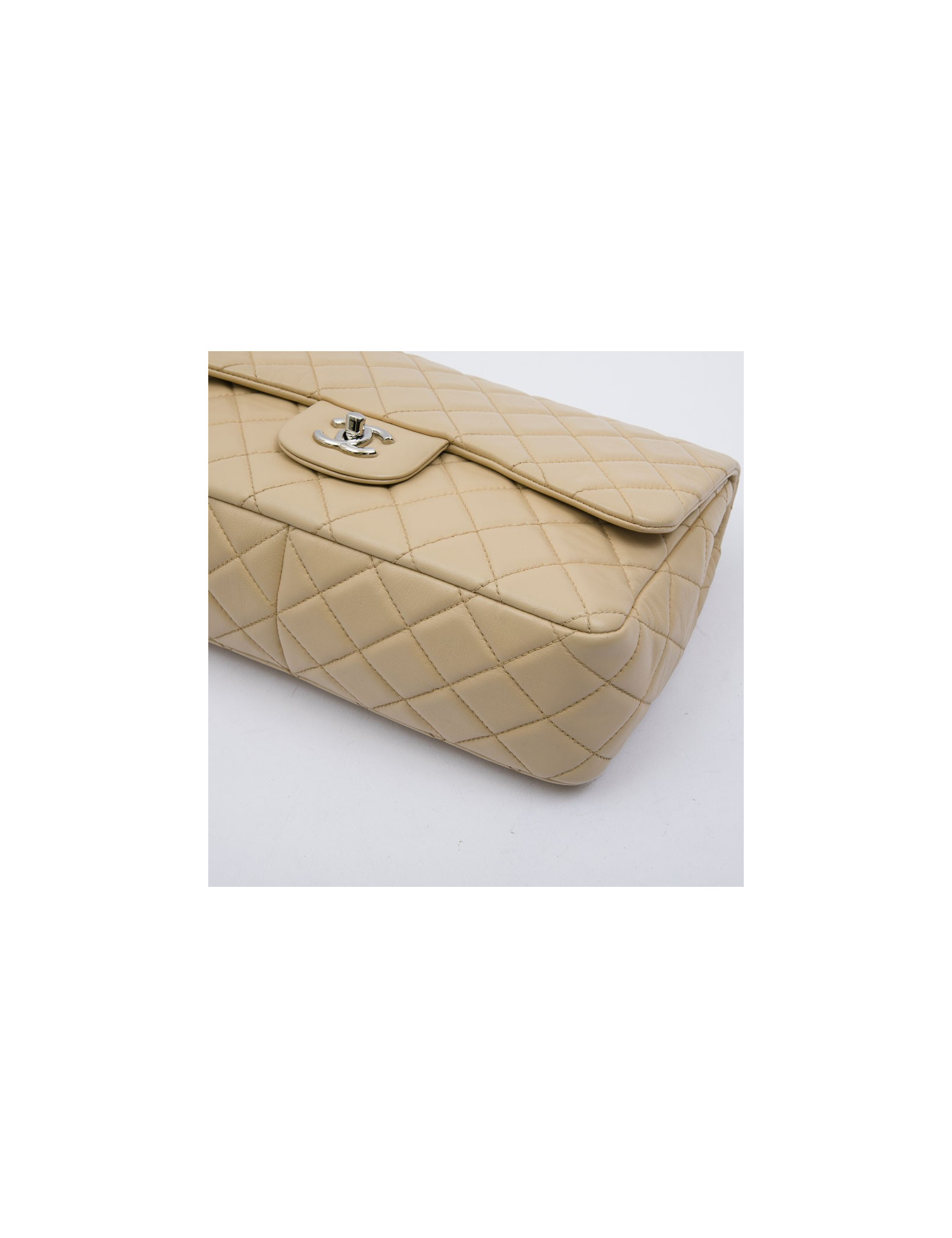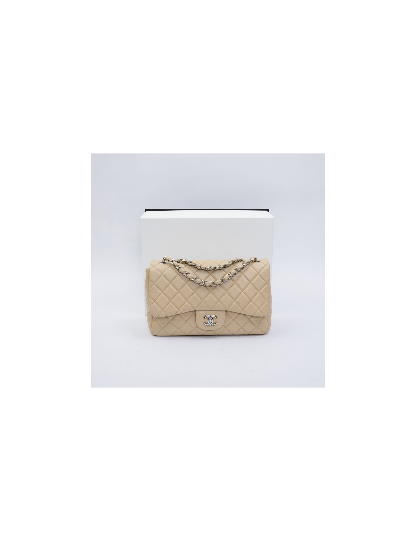 Sac classique jumbo CHANEL en cuir d'agneau souple beige. Accastillage en métal argenté. L'intérieur en cuir lisse beige dispose de deux poches plates dont une zippée. Fermoir CC. Sac reteint chez Germaine Lesèche.