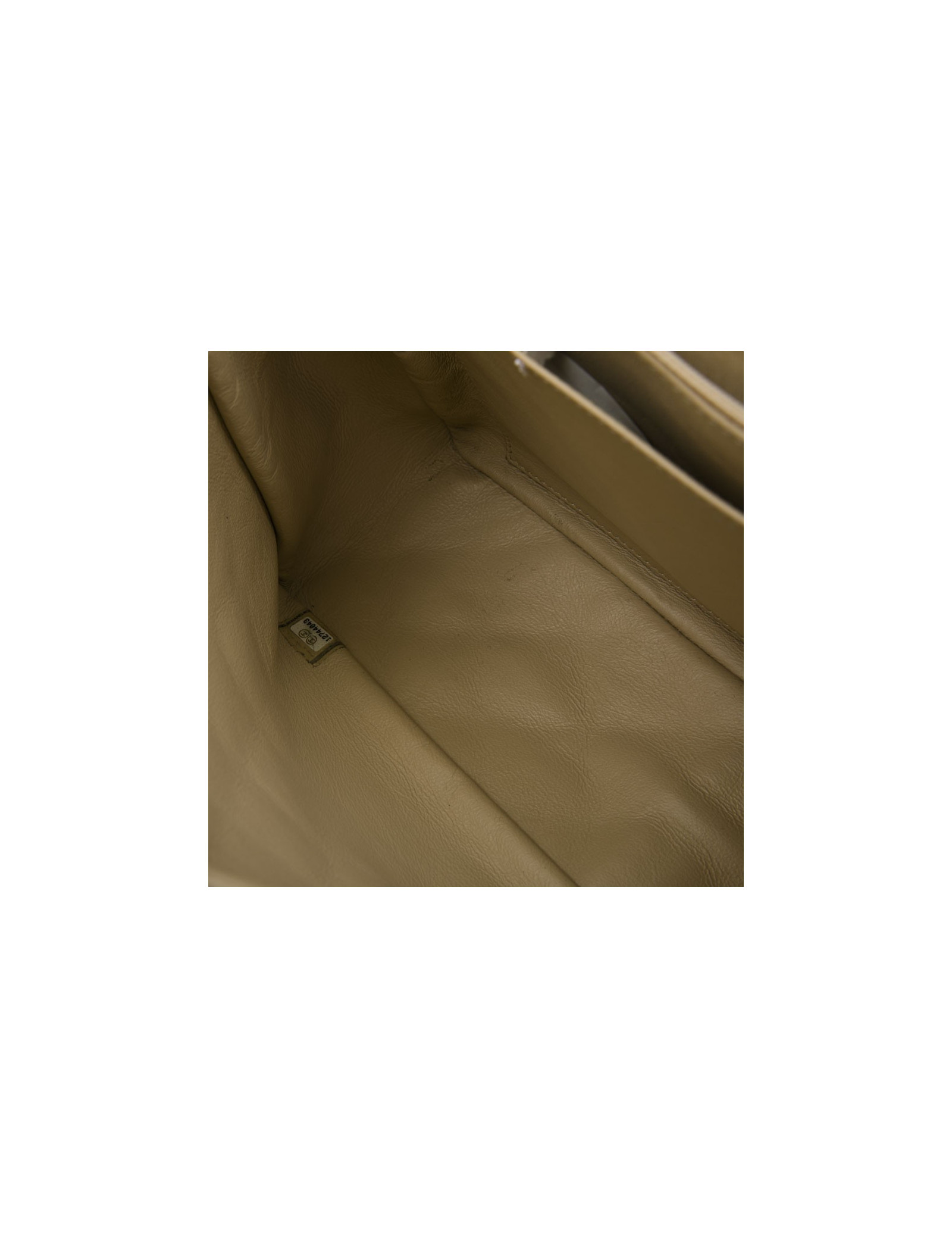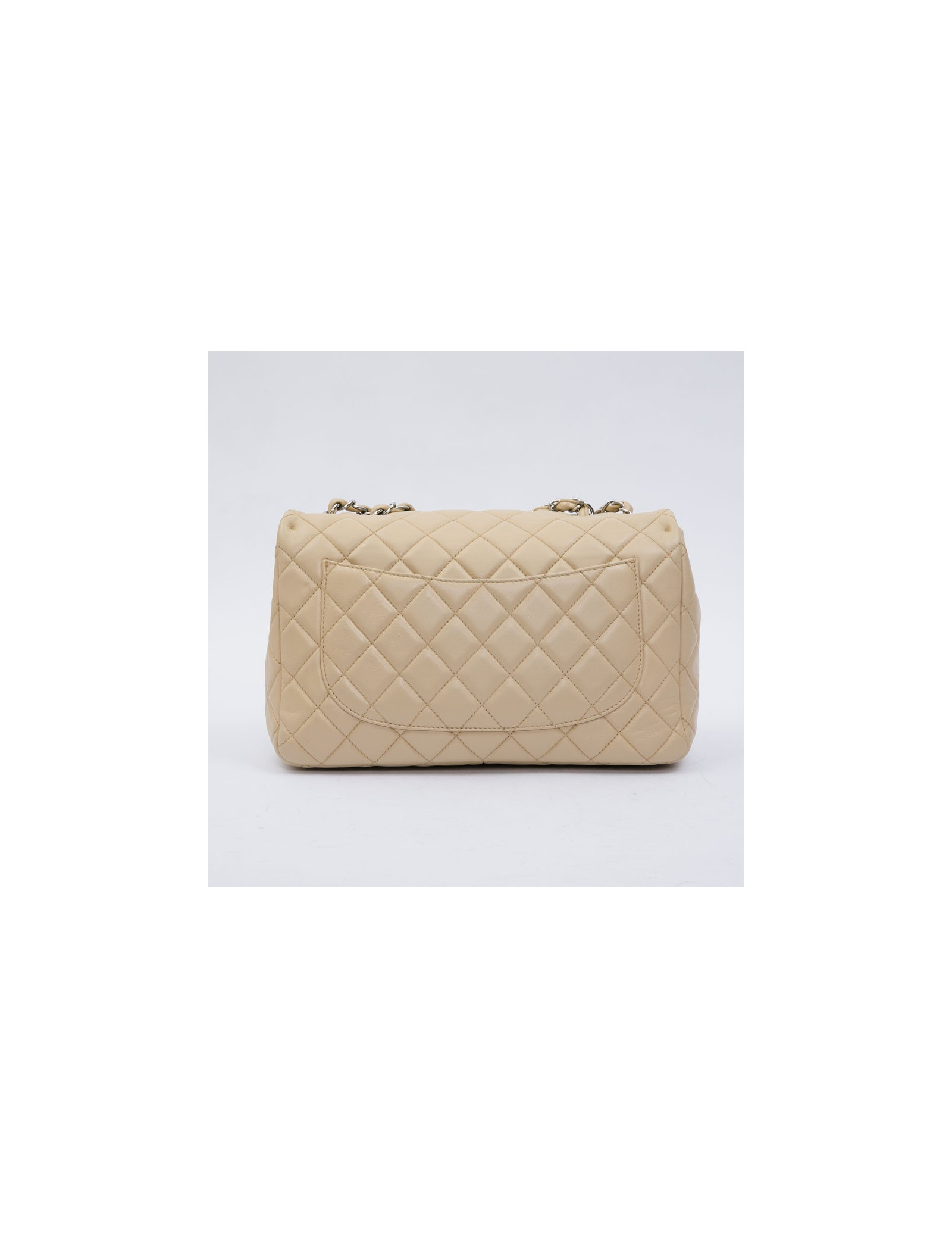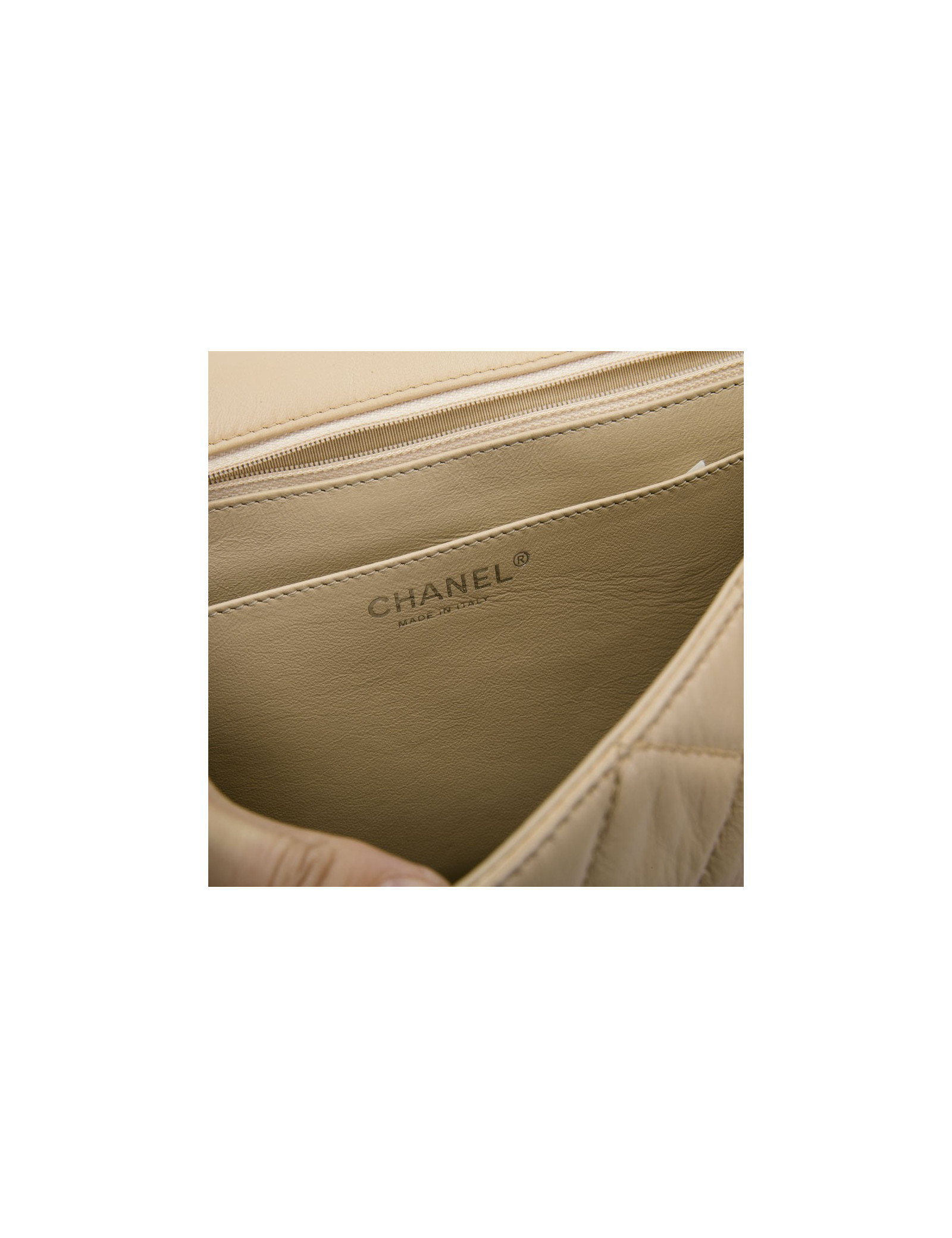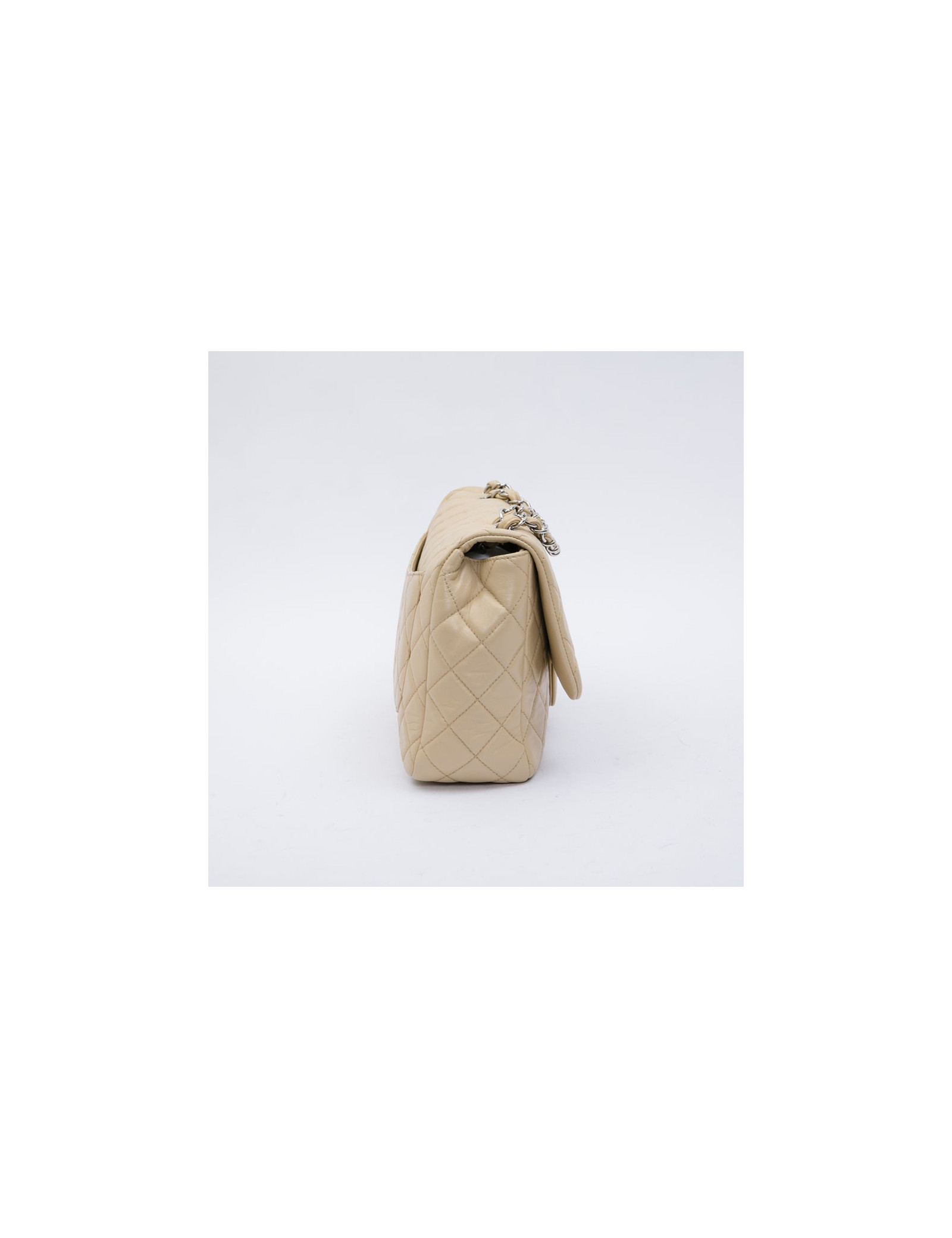 Sac classique jumbo CHANEL en cuir d'agneau souple beige. Accastillage en métal argenté. L'intérieur en cuir lisse beige dispose de deux poches plates dont une zippée. Fermoir CC. Sac reteint chez Germaine Lesèche.