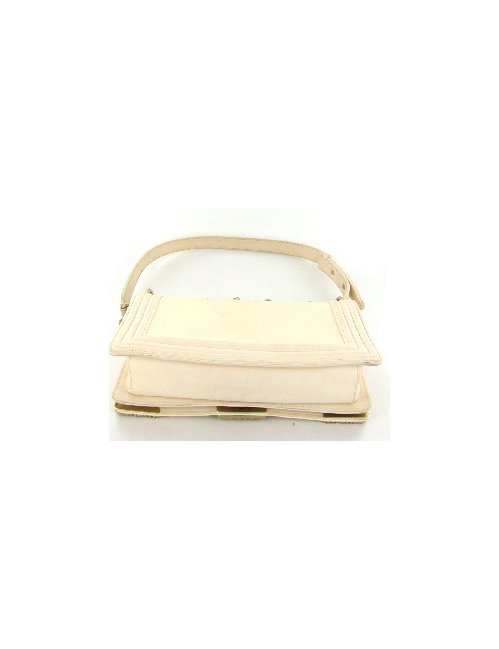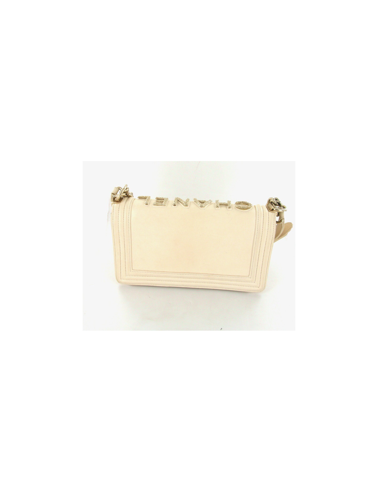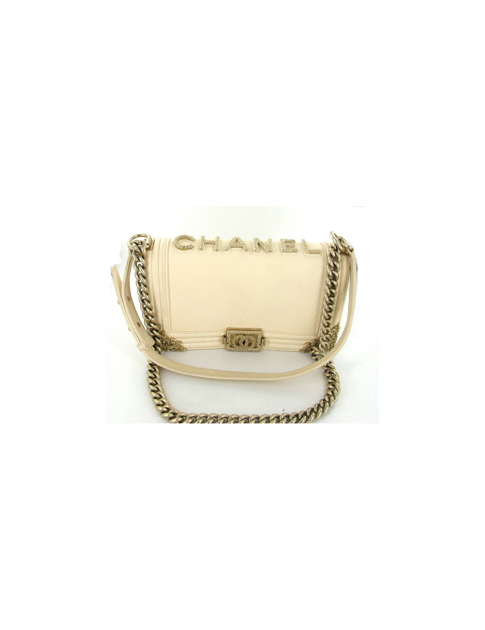 Sac" Boy" CHANEL, très Couture en cuir lisse écru. La bijouterie est en métal or pâle finemment filigrané. " CHANEL" est écrit sur le haut du sac tel un bijou. Il se porte aussi bien à l'épaule qu’en bandoullière. l'anse est en métal or pâle. L'intérieur est en tissu beige et se compose d'un poche zippée. (pas d'hologramme, vente presse)