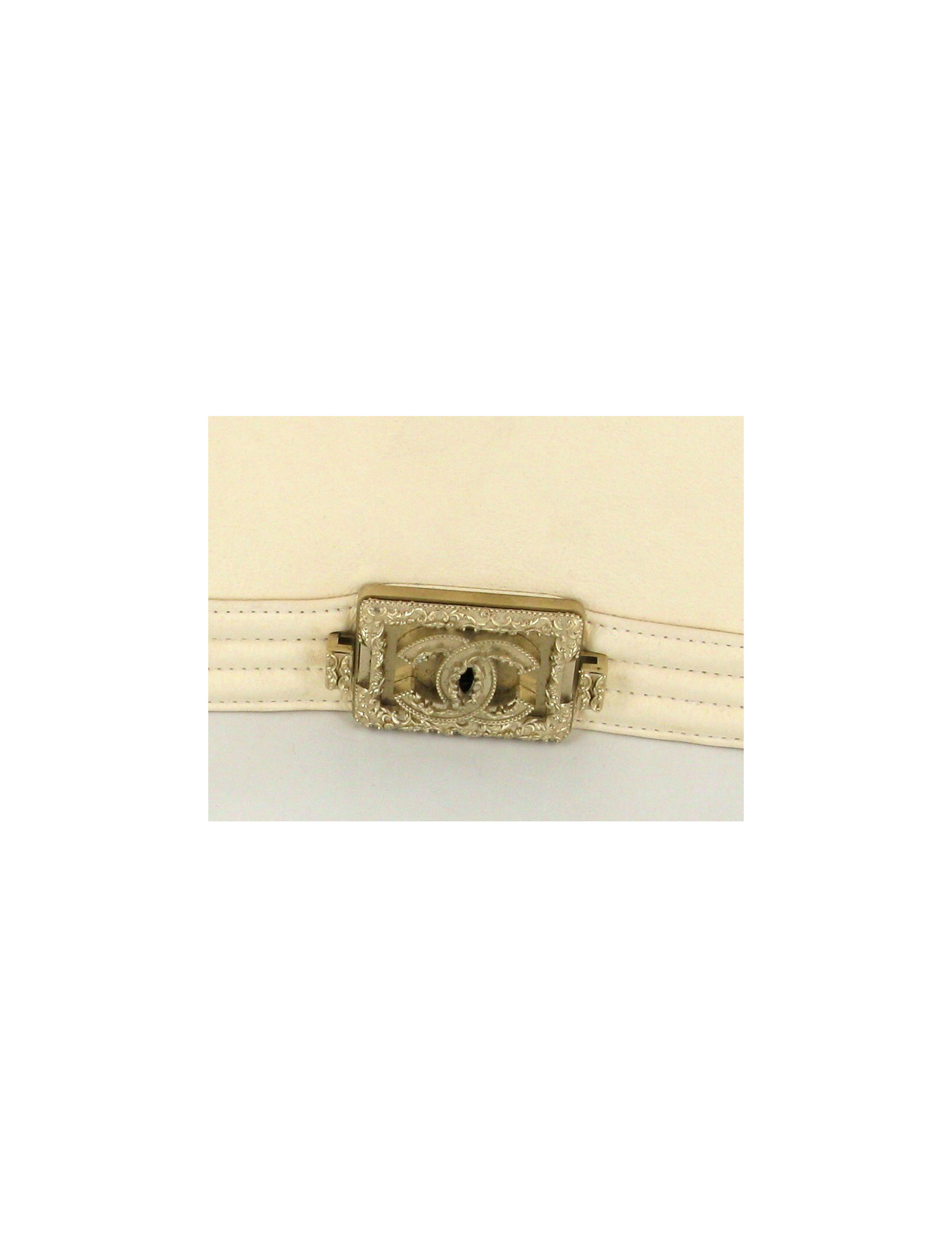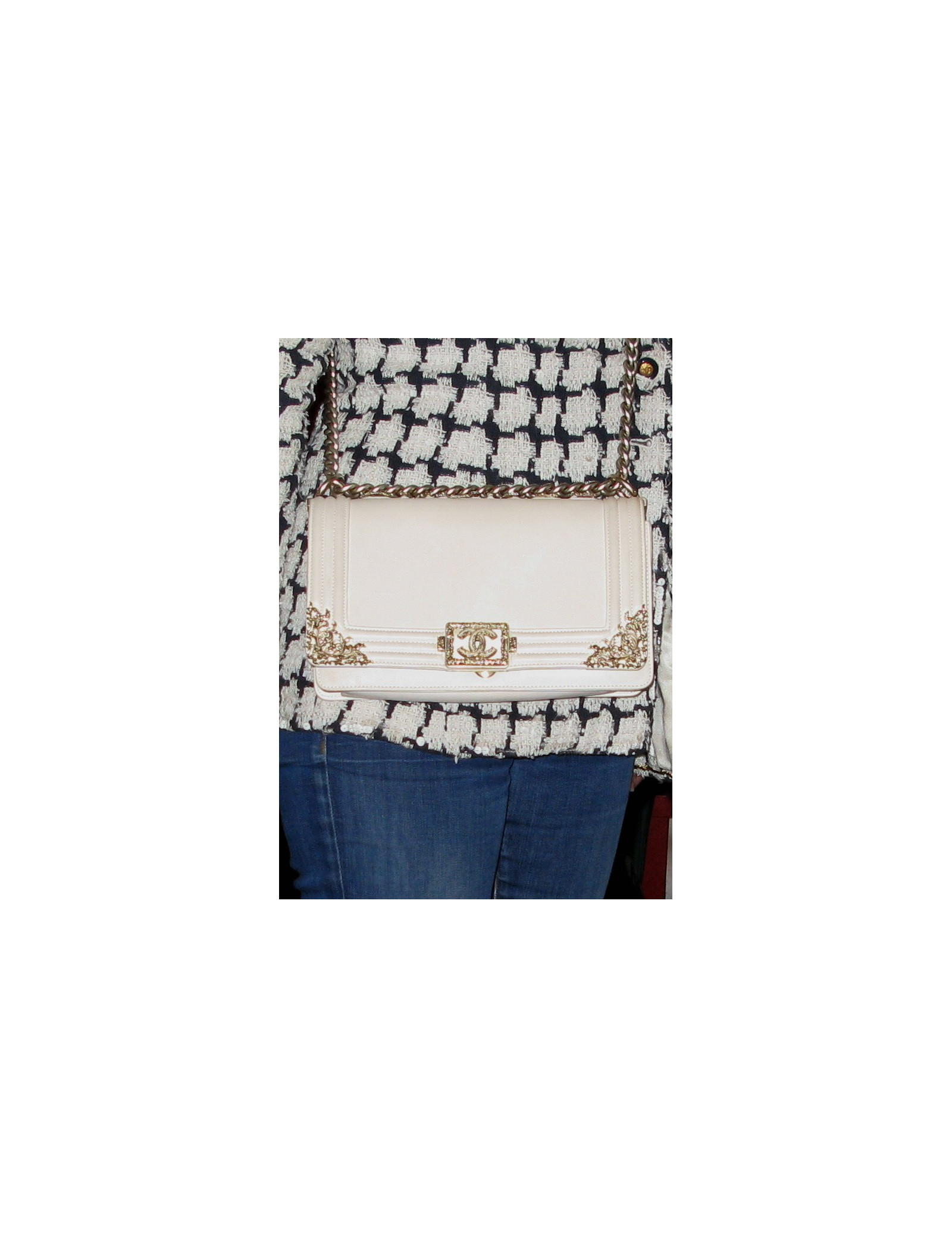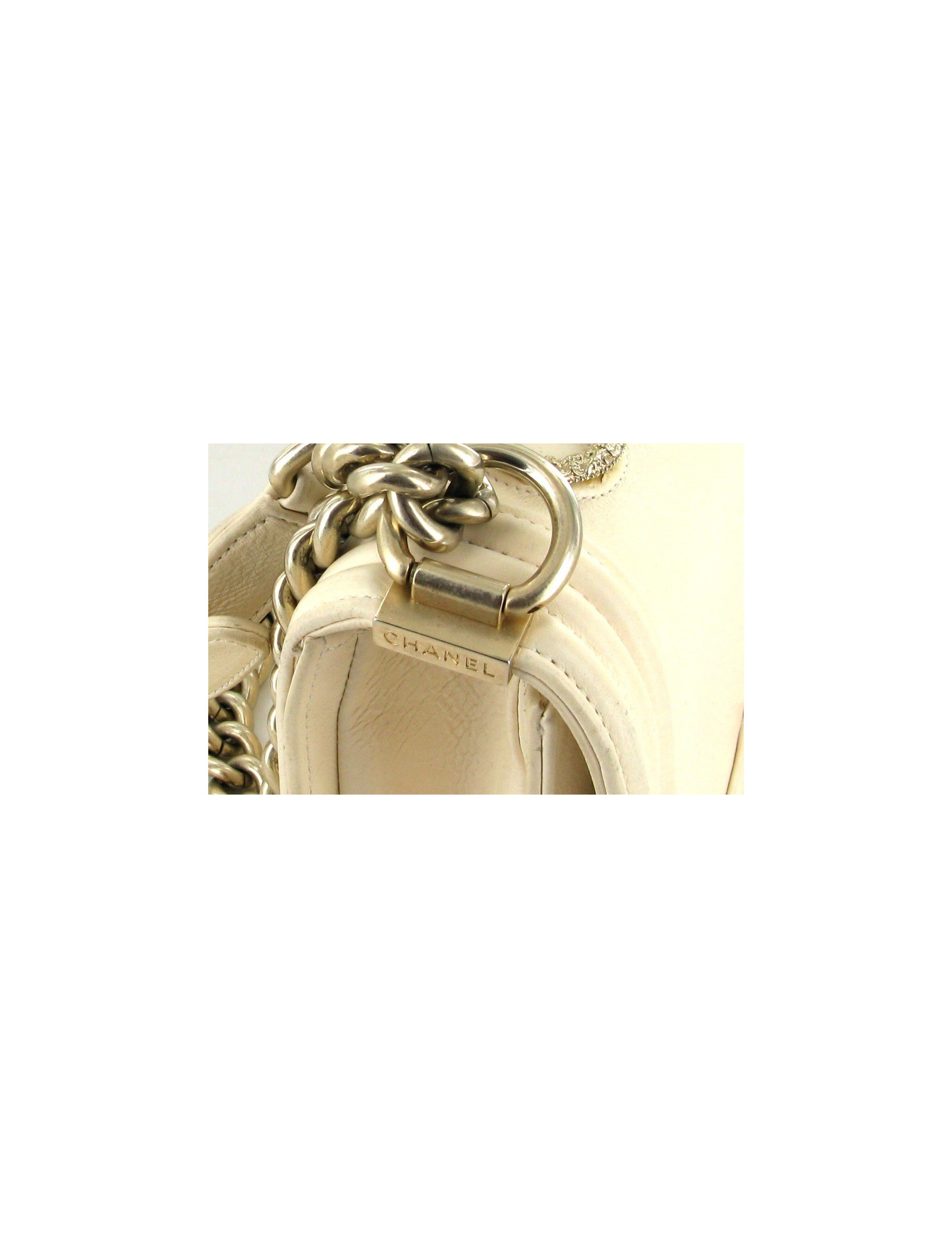 Sac" Boy" CHANEL, très Couture en cuir lisse écru. La bijouterie est en métal or pâle finemment filigrané. " CHANEL" est écrit sur le haut du sac tel un bijou. Il se porte aussi bien à l'épaule qu’en bandoullière. l'anse est en métal or pâle. L'intérieur est en tissu beige et se compose d'un poche zippée. (pas d'hologramme, vente presse)