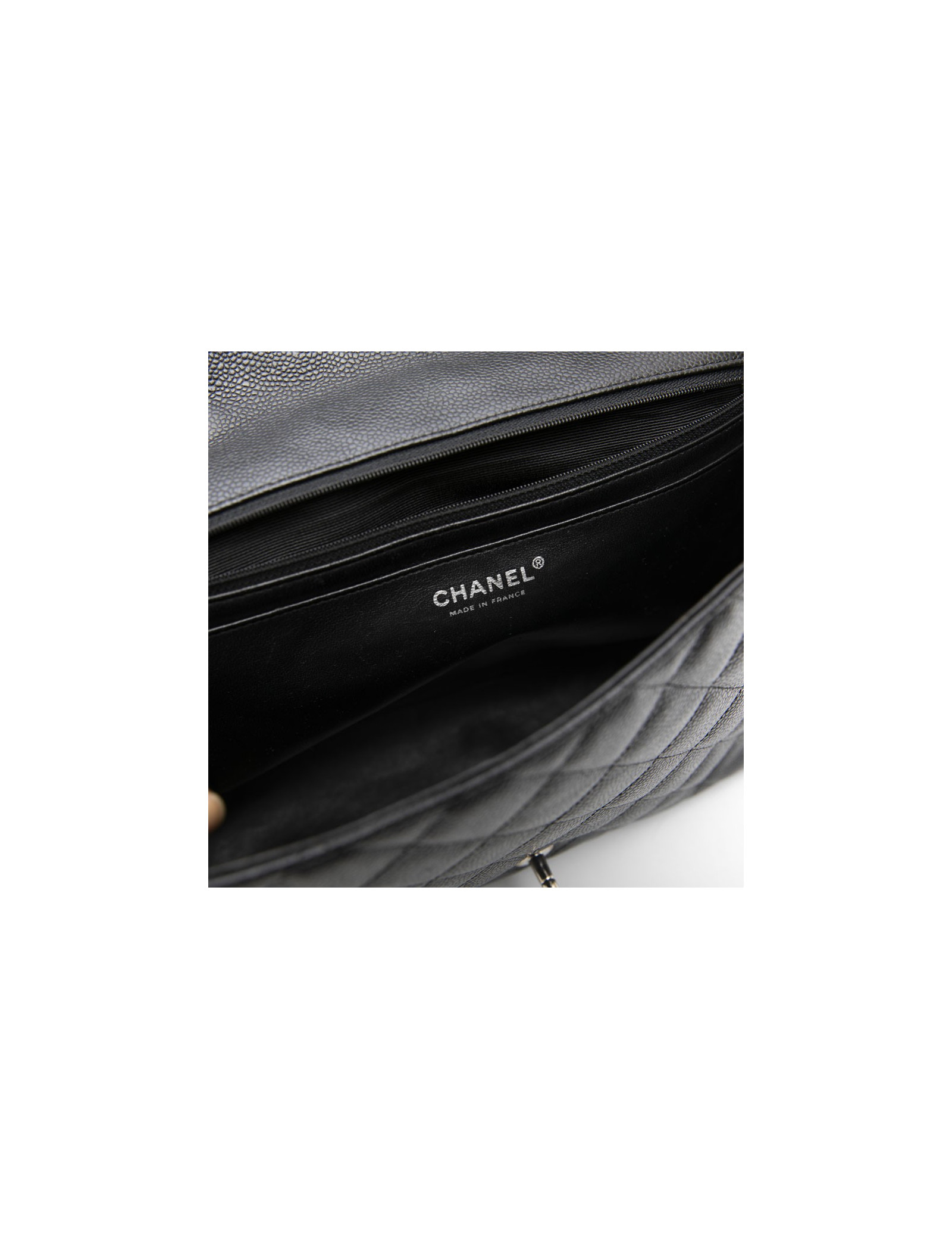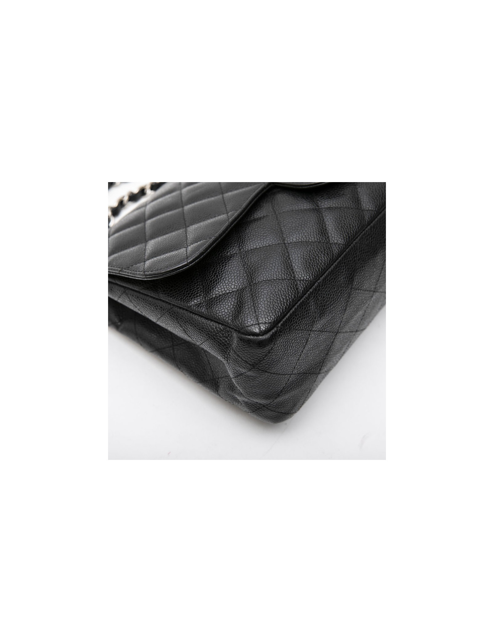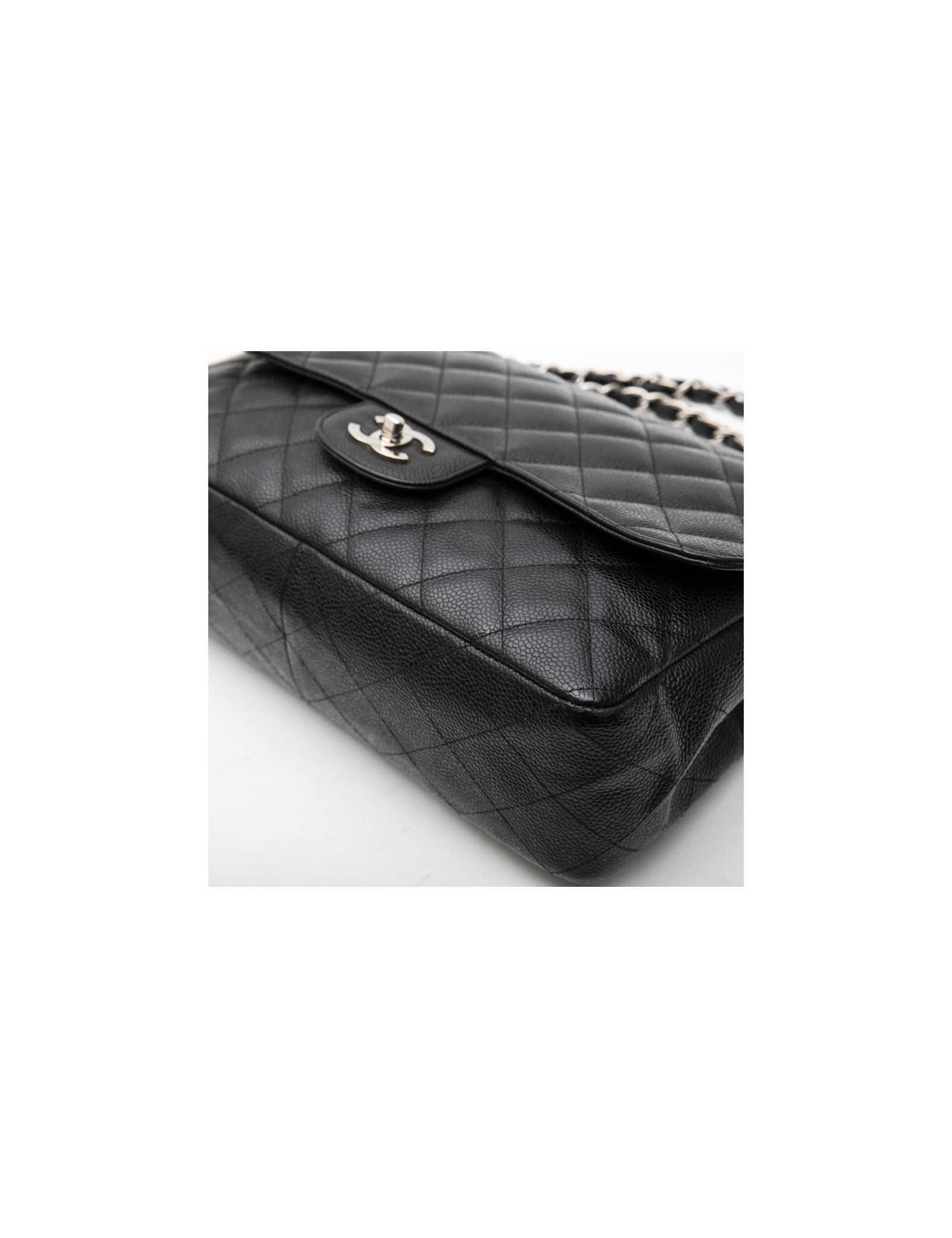 Sac classique jumbo CHANEL en cuir de veau caviar noir. Accastillage en métal argenté. L'intérieur en cuir lisse noir dispose de deux poches plates dont une zippée. Fermoir CC.