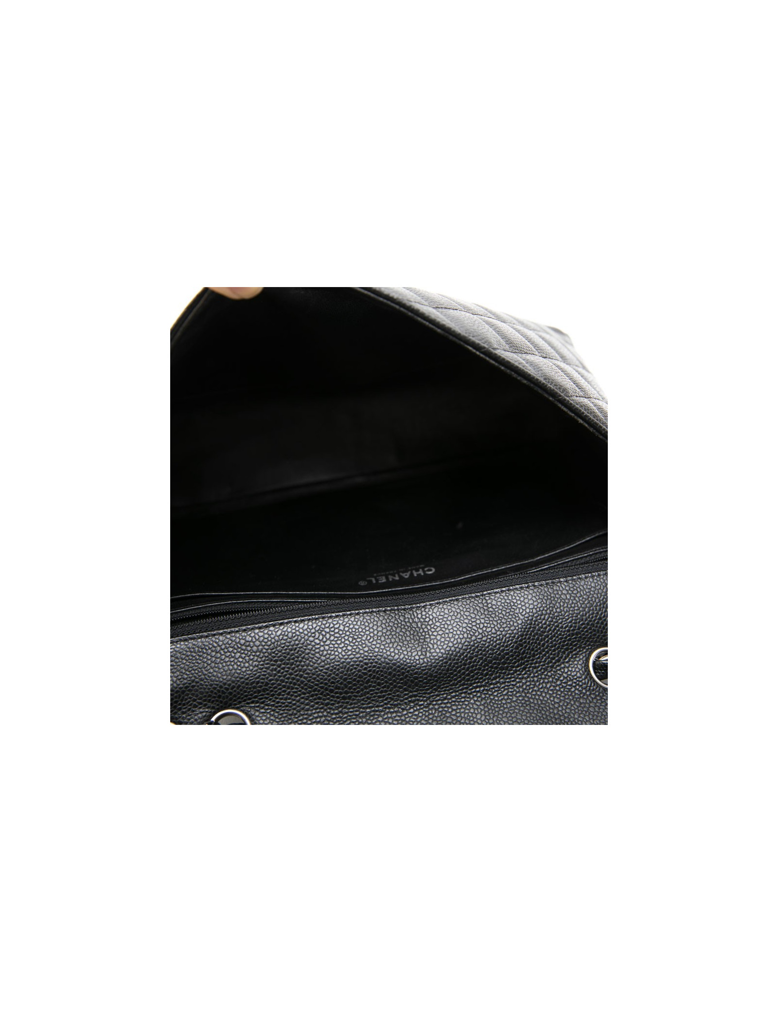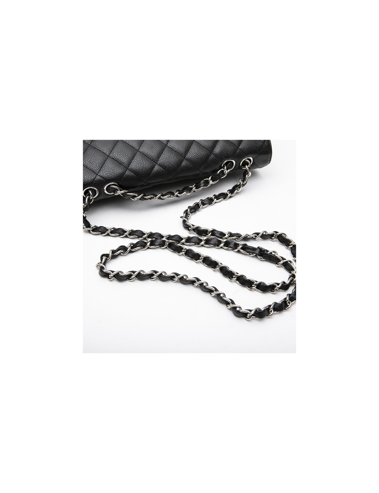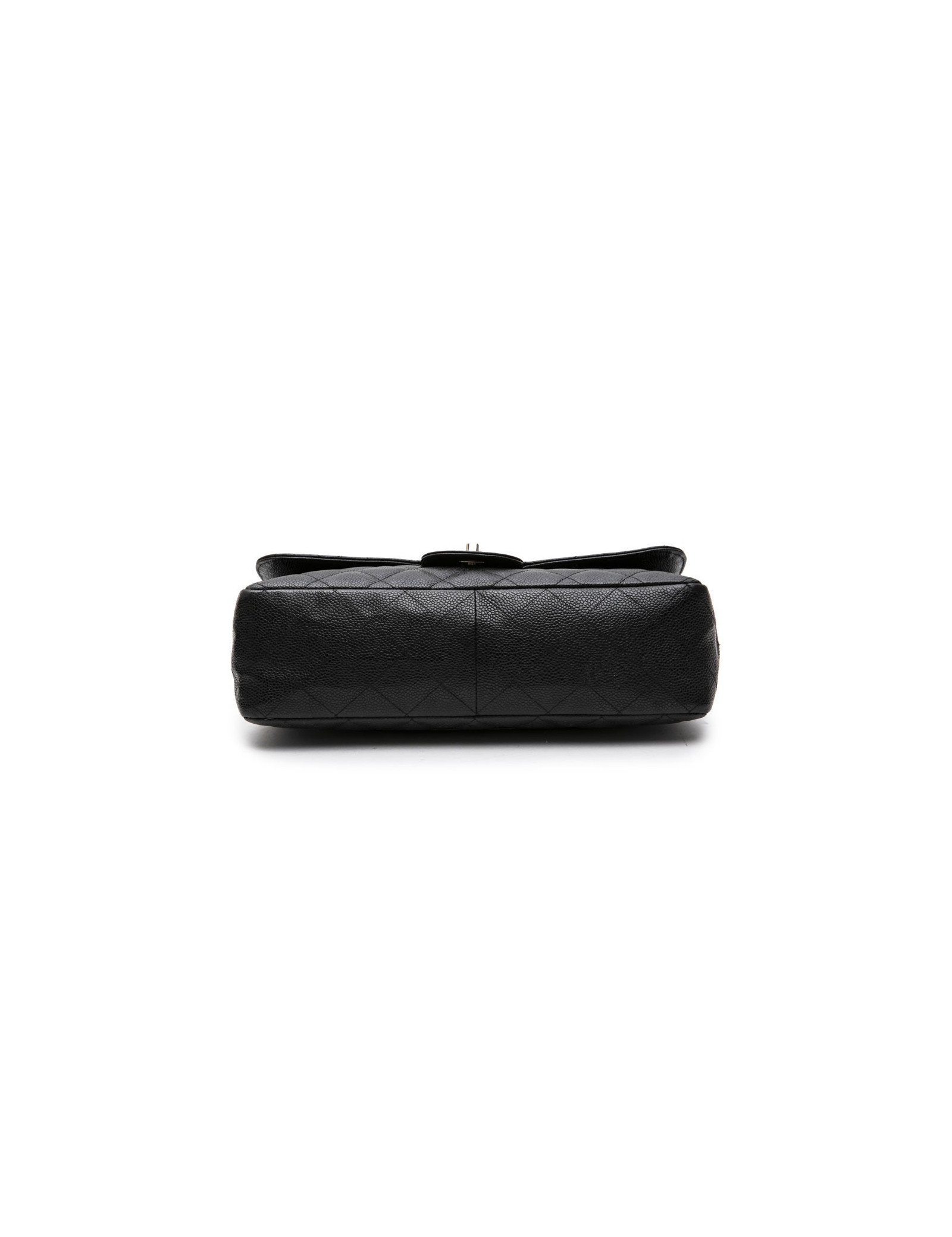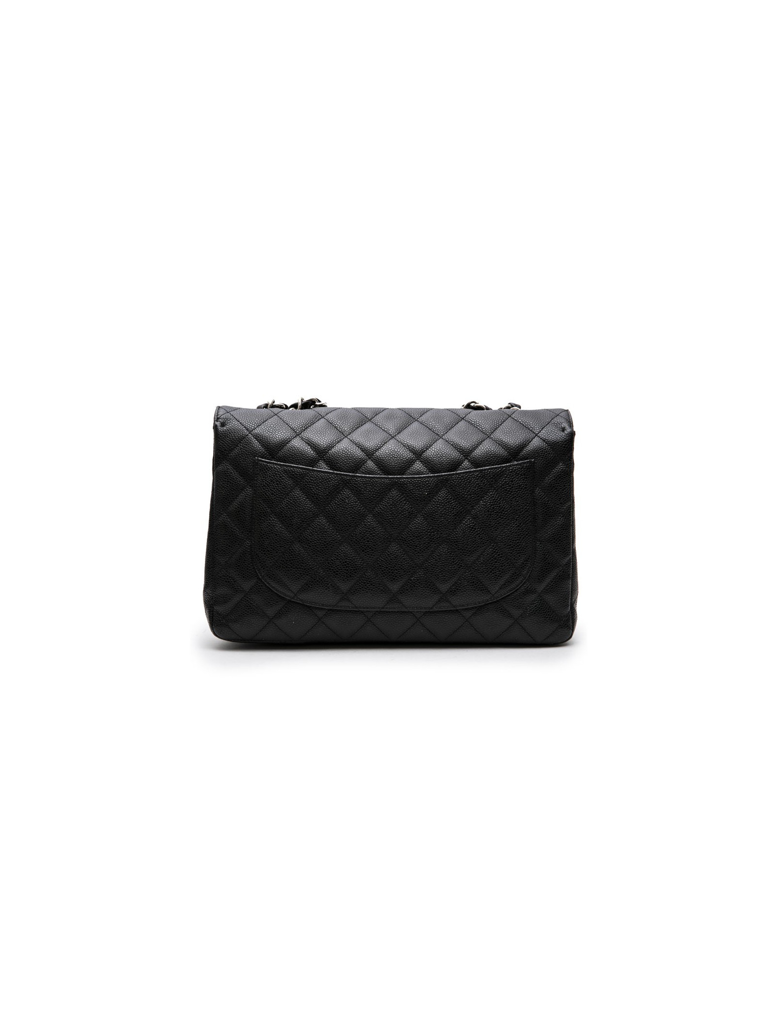 Sac classique jumbo CHANEL en cuir de veau caviar noir. Accastillage en métal argenté. L'intérieur en cuir lisse noir dispose de deux poches plates dont une zippée. Fermoir CC.