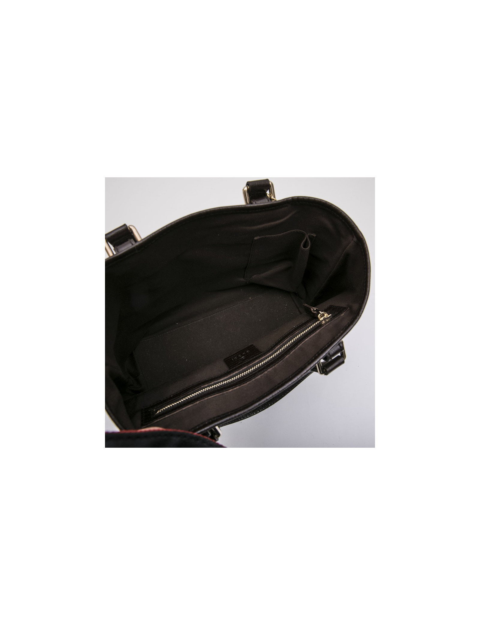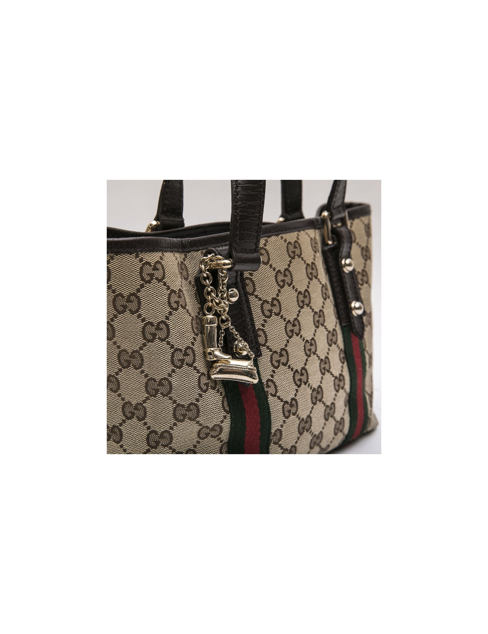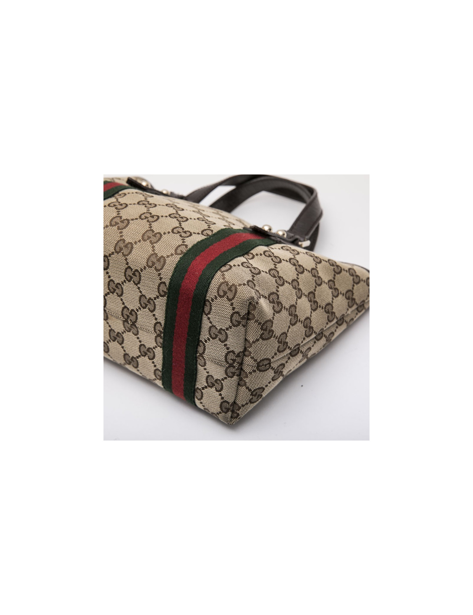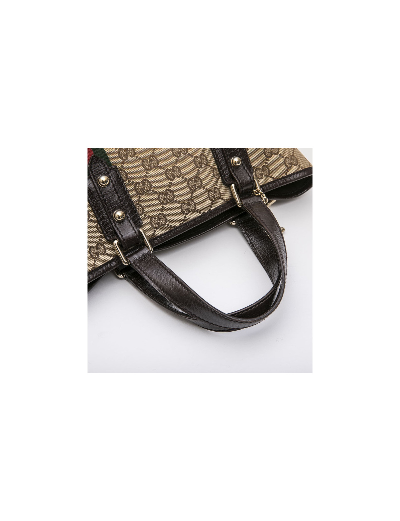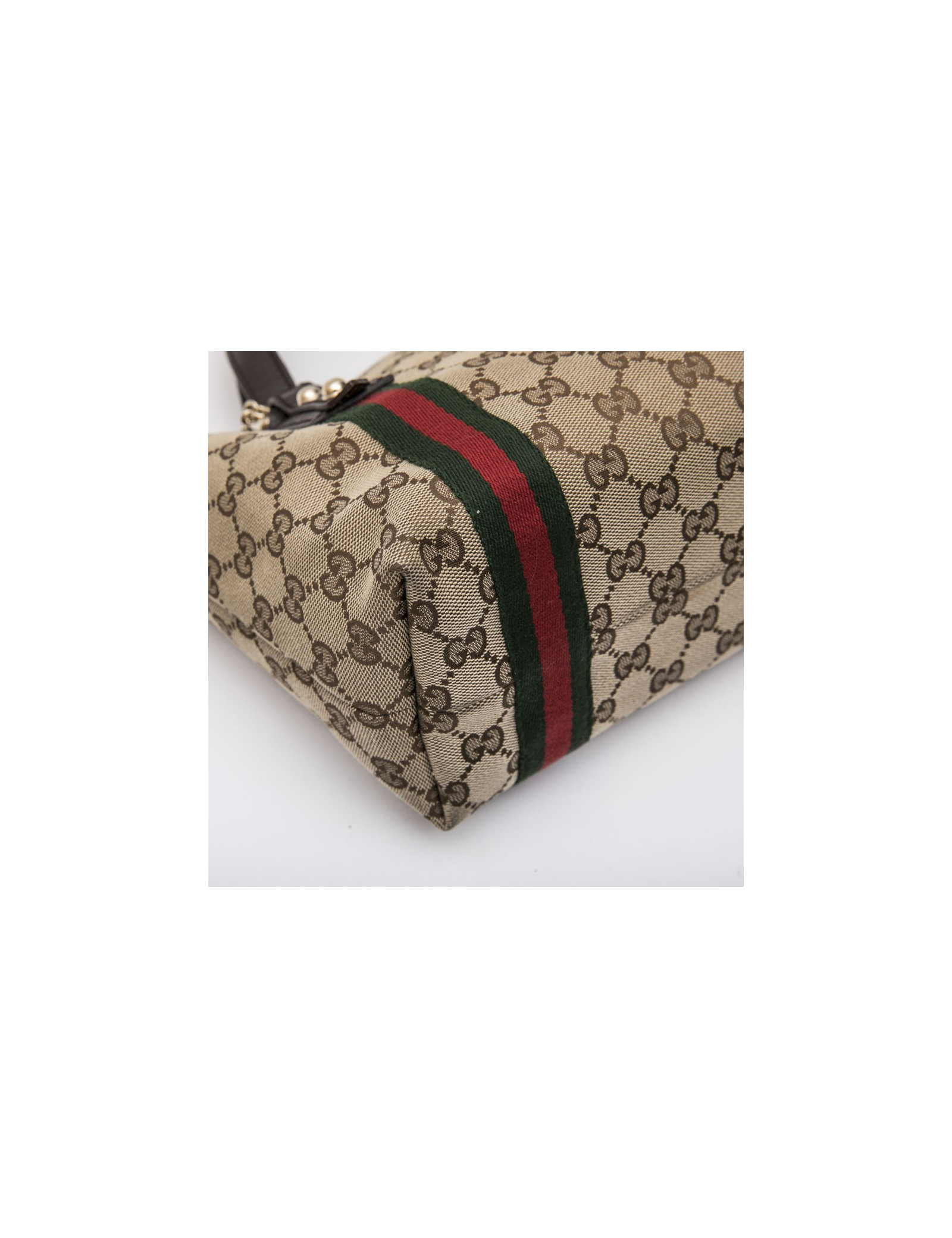 Vintage.Sac Gucci en toile monogram marron et beige avec stripes en tissu rouge et verte. Finitions en cuir strié marron. Accastillage doré. L'intérieur est en tissu marron avec 2 poches dont une zippée. Numéro de série : 139261.... Made in Italy.