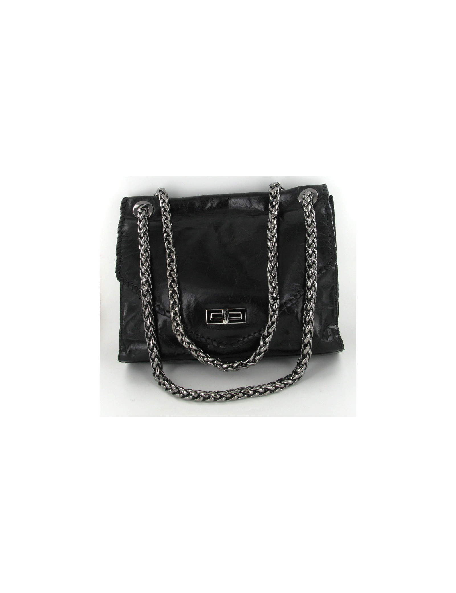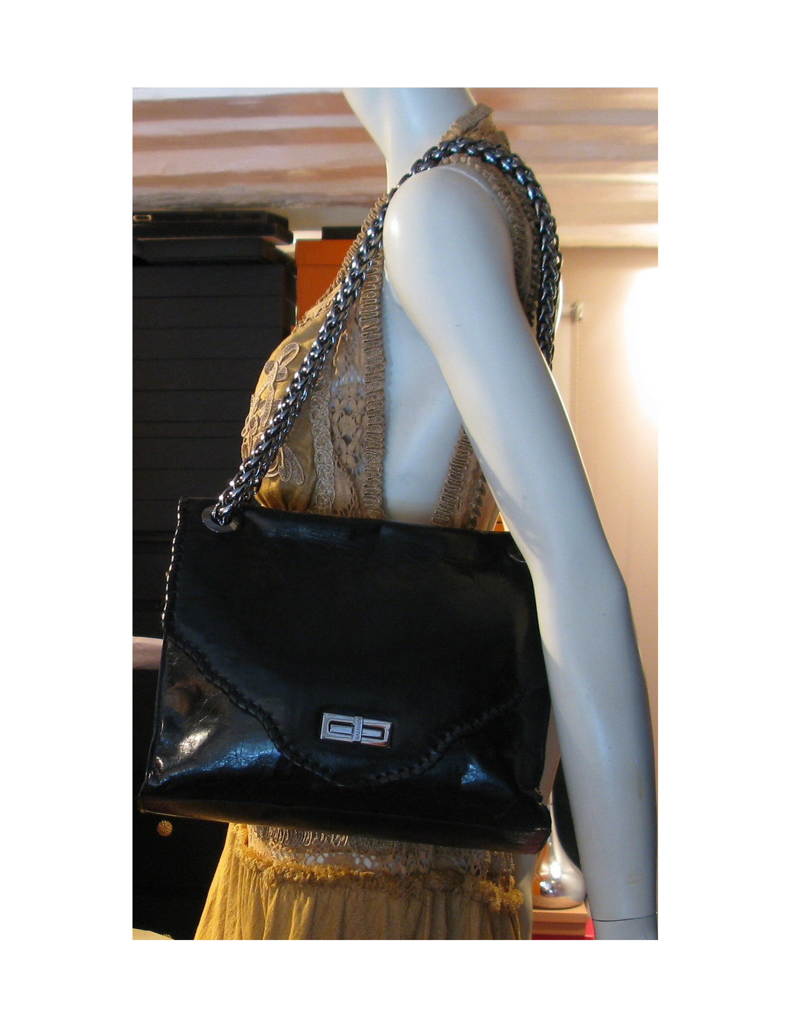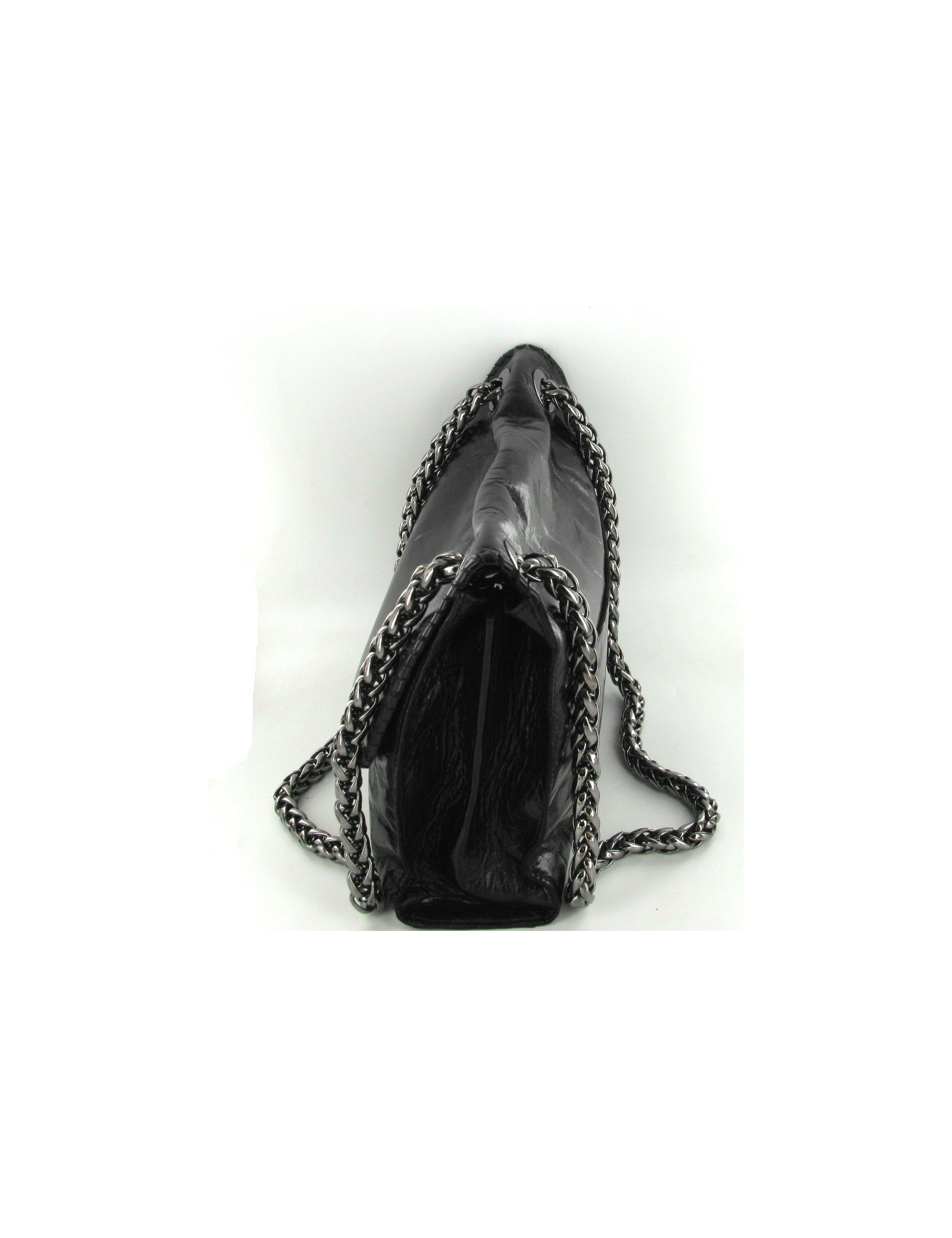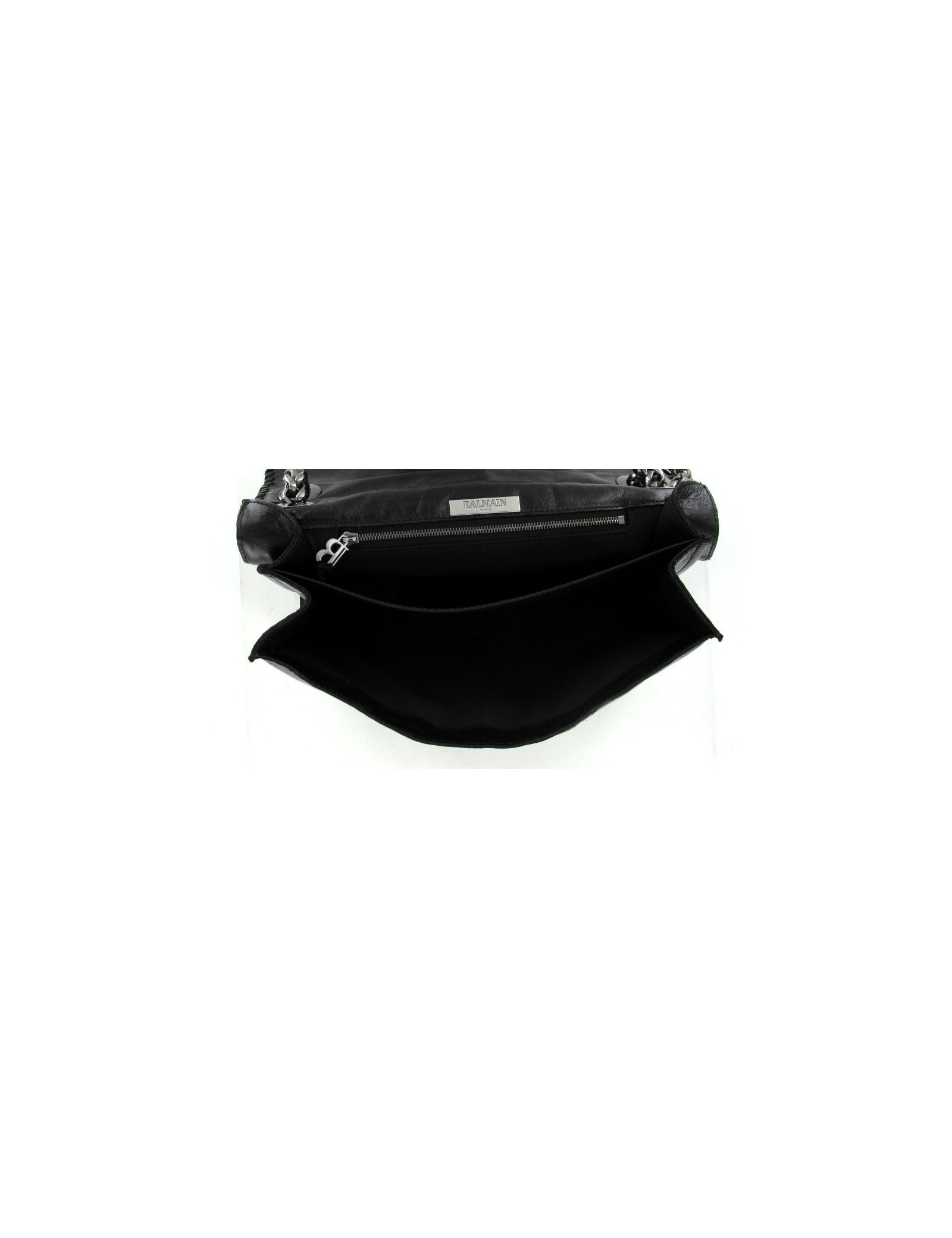 sac BALMAIN en cuir vieilli noir brillant. bijouterie est en métal couleur ruthénium. Le fermoir est siglé : BALMAIN . Ce sac se porte, à l'épaule, ou en bandoulière avec 2 larges anses, couleur ruthénium tressé modele : chaine épi. L'intérieur est en cuir noir et comporte 2 compartiments et une poche zippée. jamais été porté, livré avec dustbag et certificat d'authenticité.