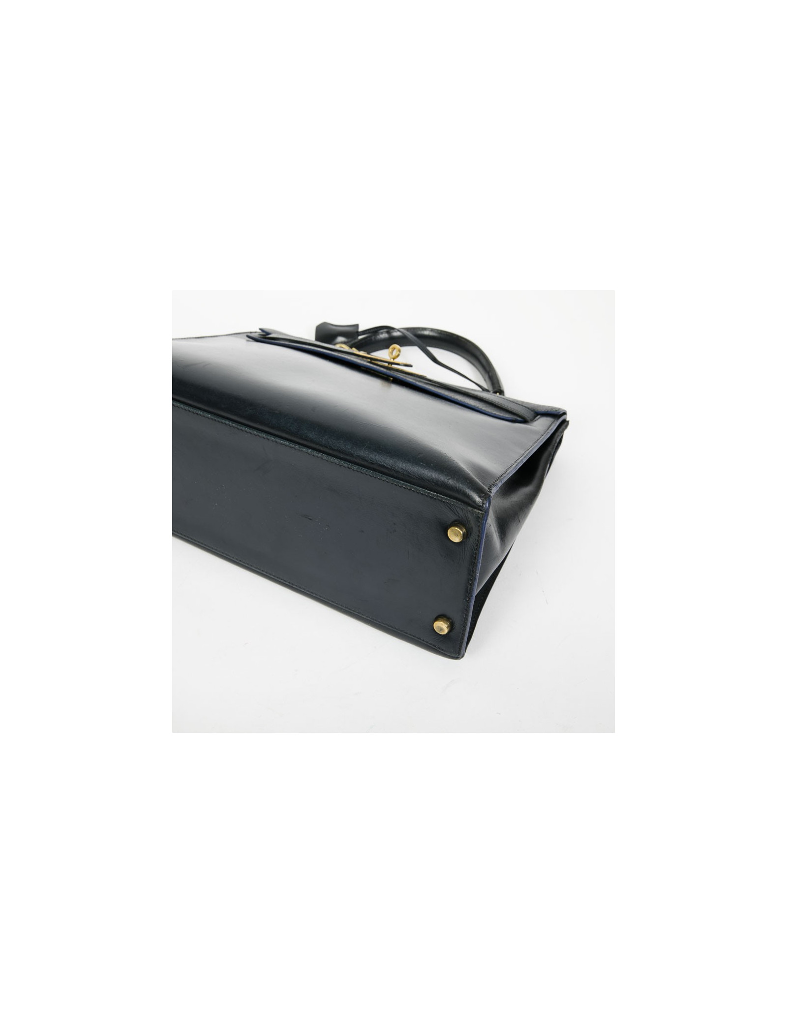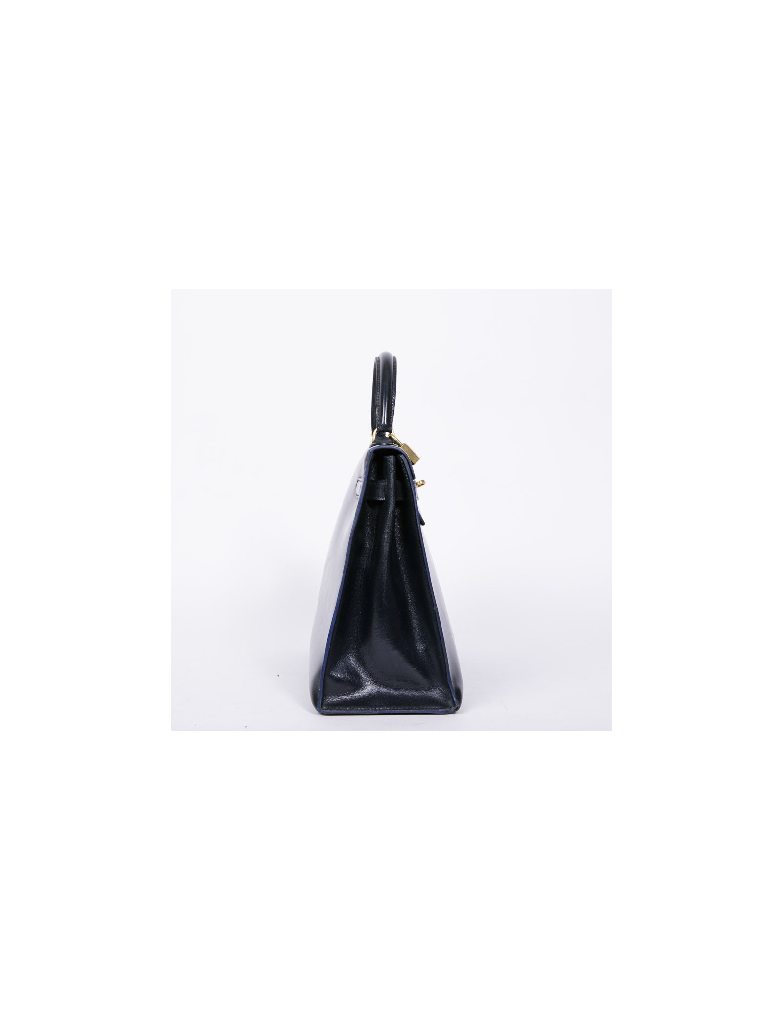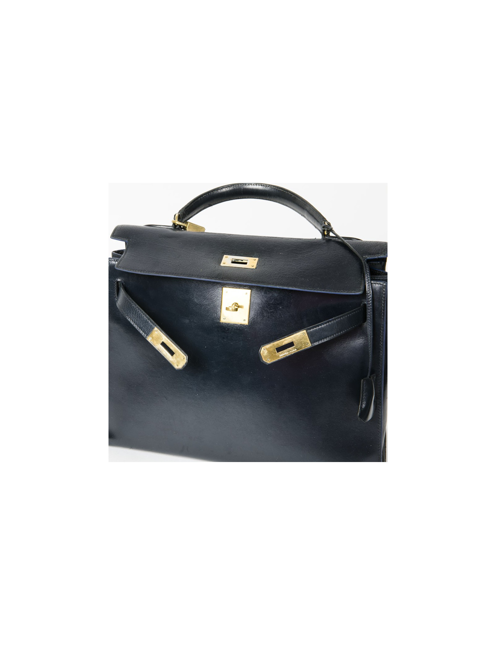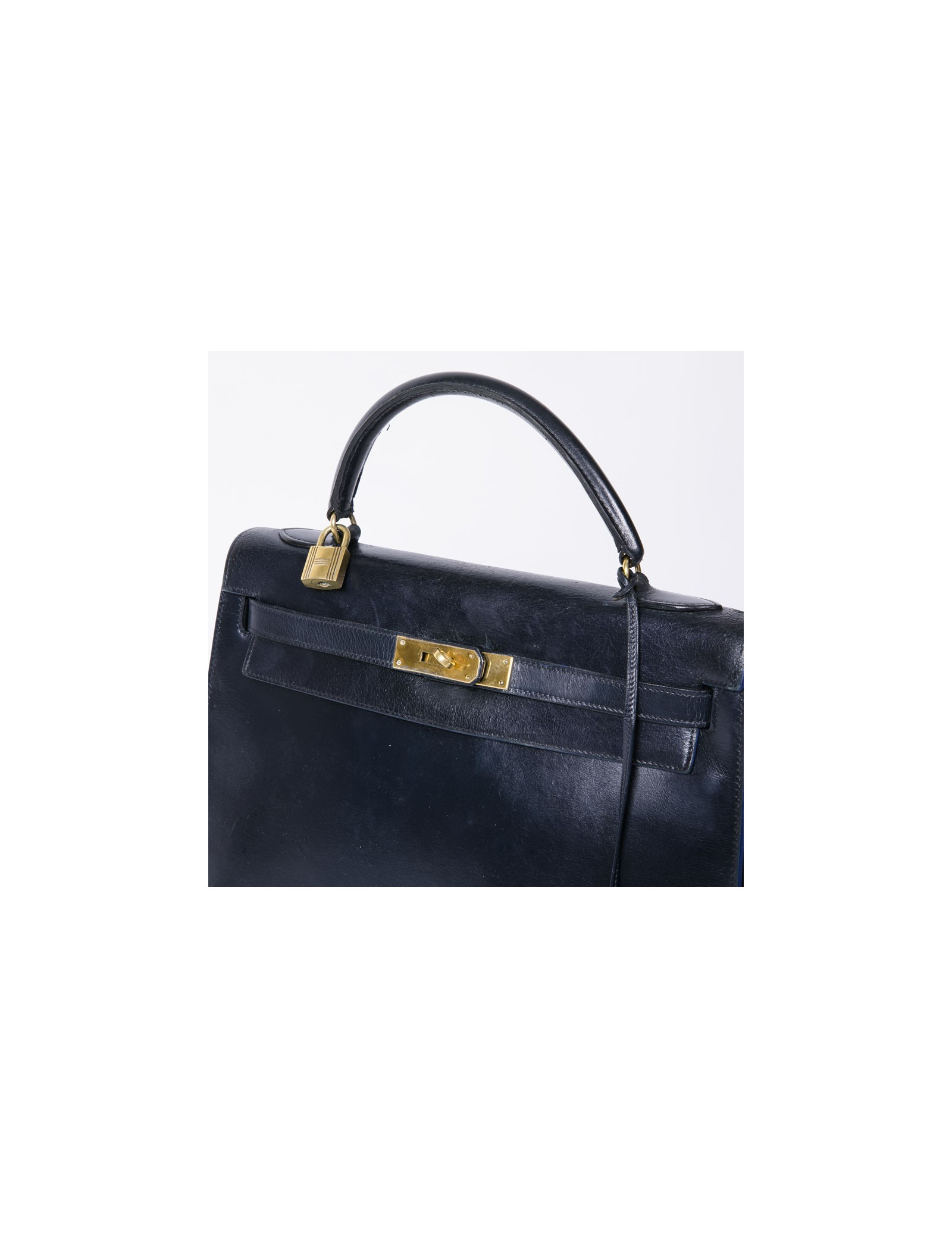 Sac Kelly 32 Hermès en cuir box bleu marine vintage. Bijouterie dorée. Tirette, clochette, clefs et cadenas. Bandoulière en tissu.