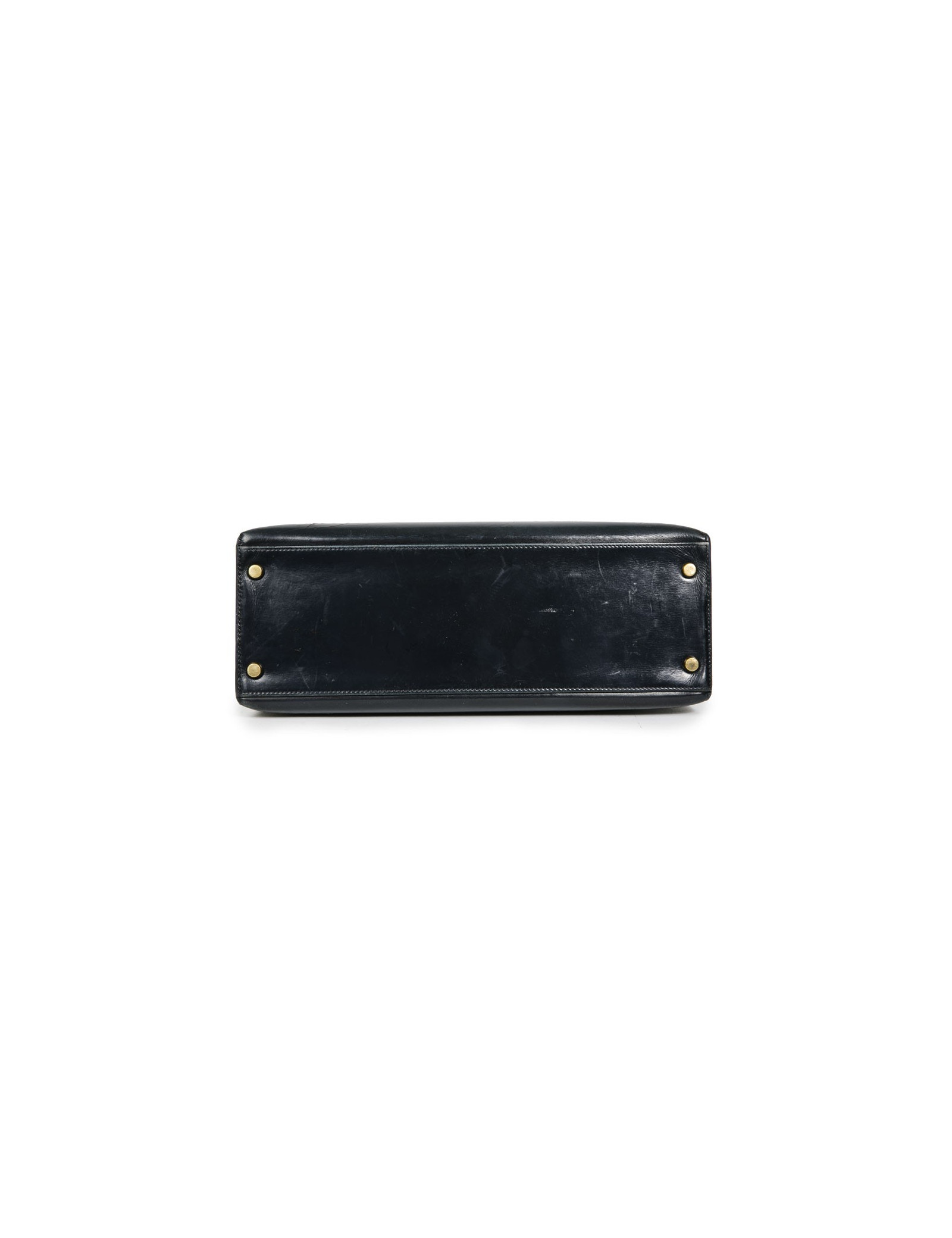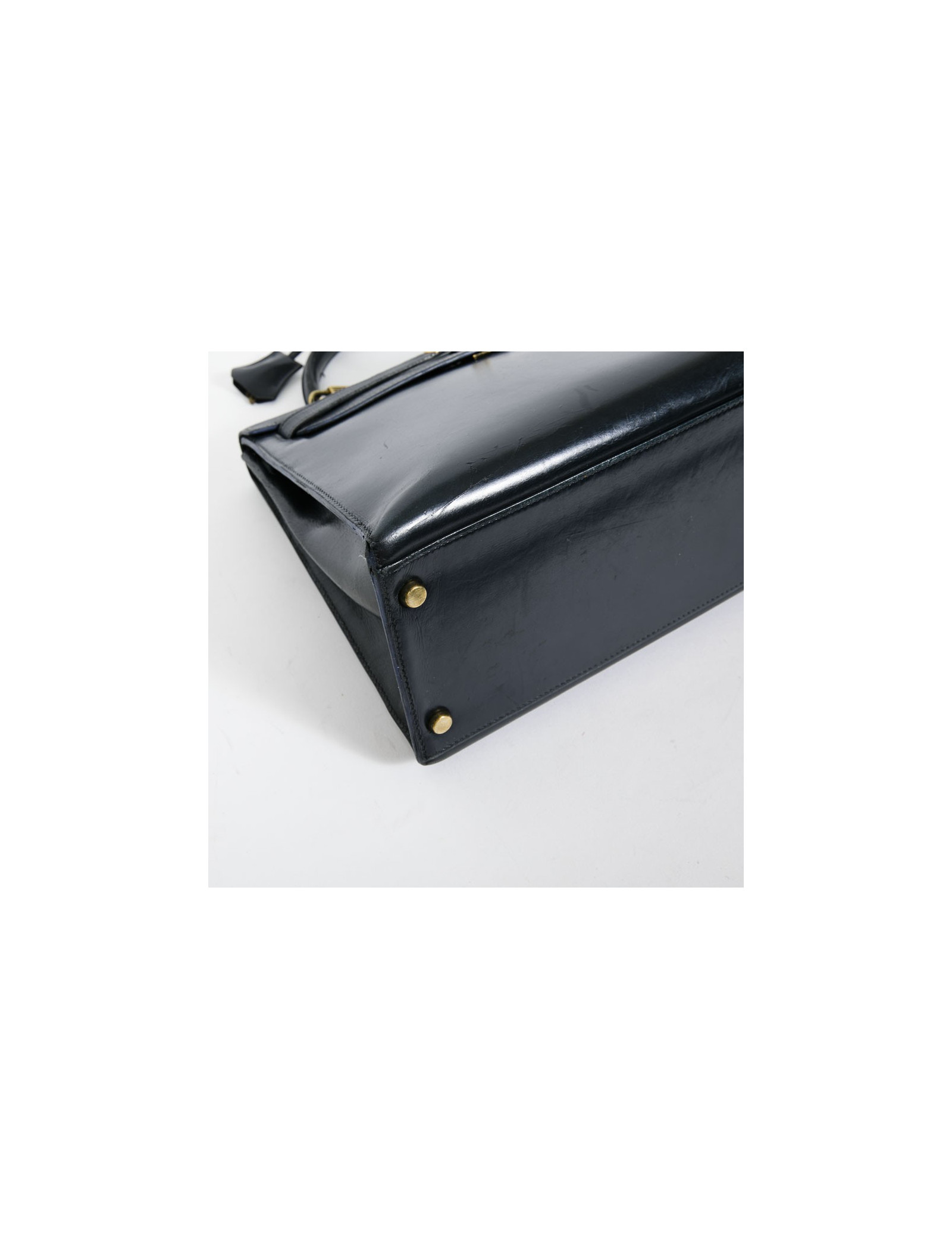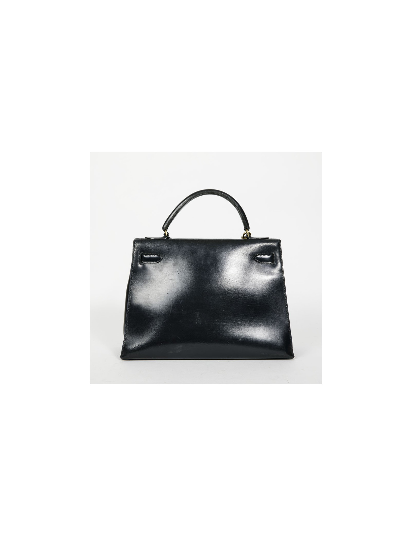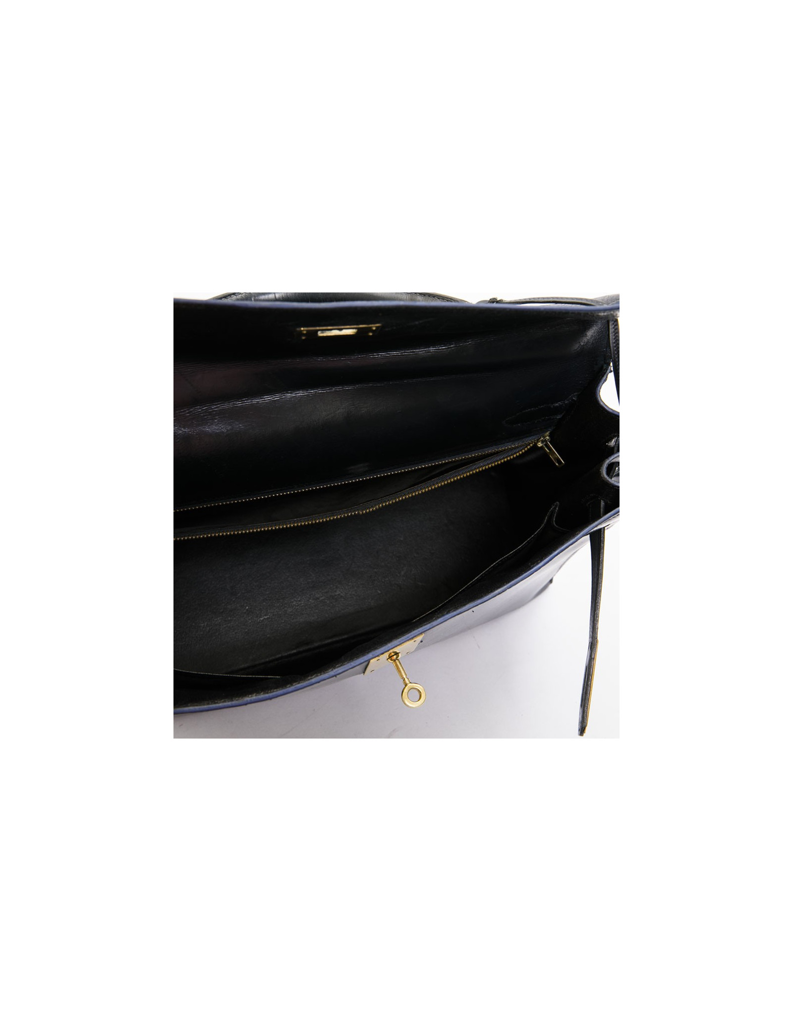 Sac Kelly 32 Hermès en cuir box bleu marine vintage. Bijouterie dorée. Tirette, clochette, clefs et cadenas. Bandoulière en tissu.