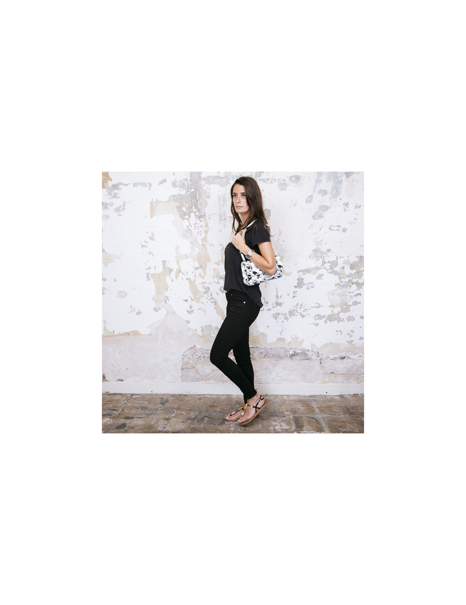 Porté épaule à l'aide de chaînes en métal argenté noir ornées de charm's en nacre blanche et noire