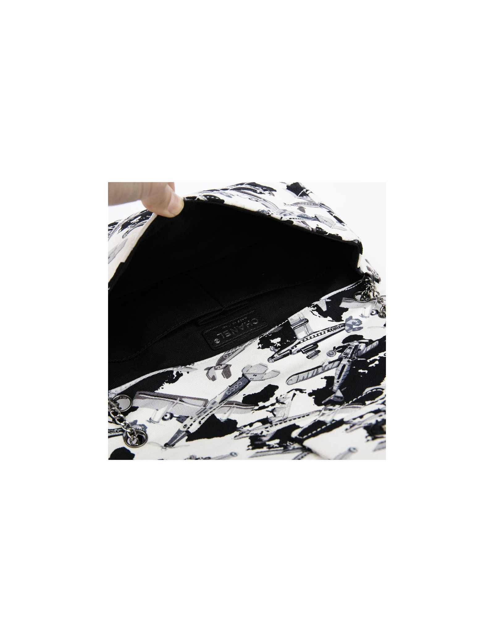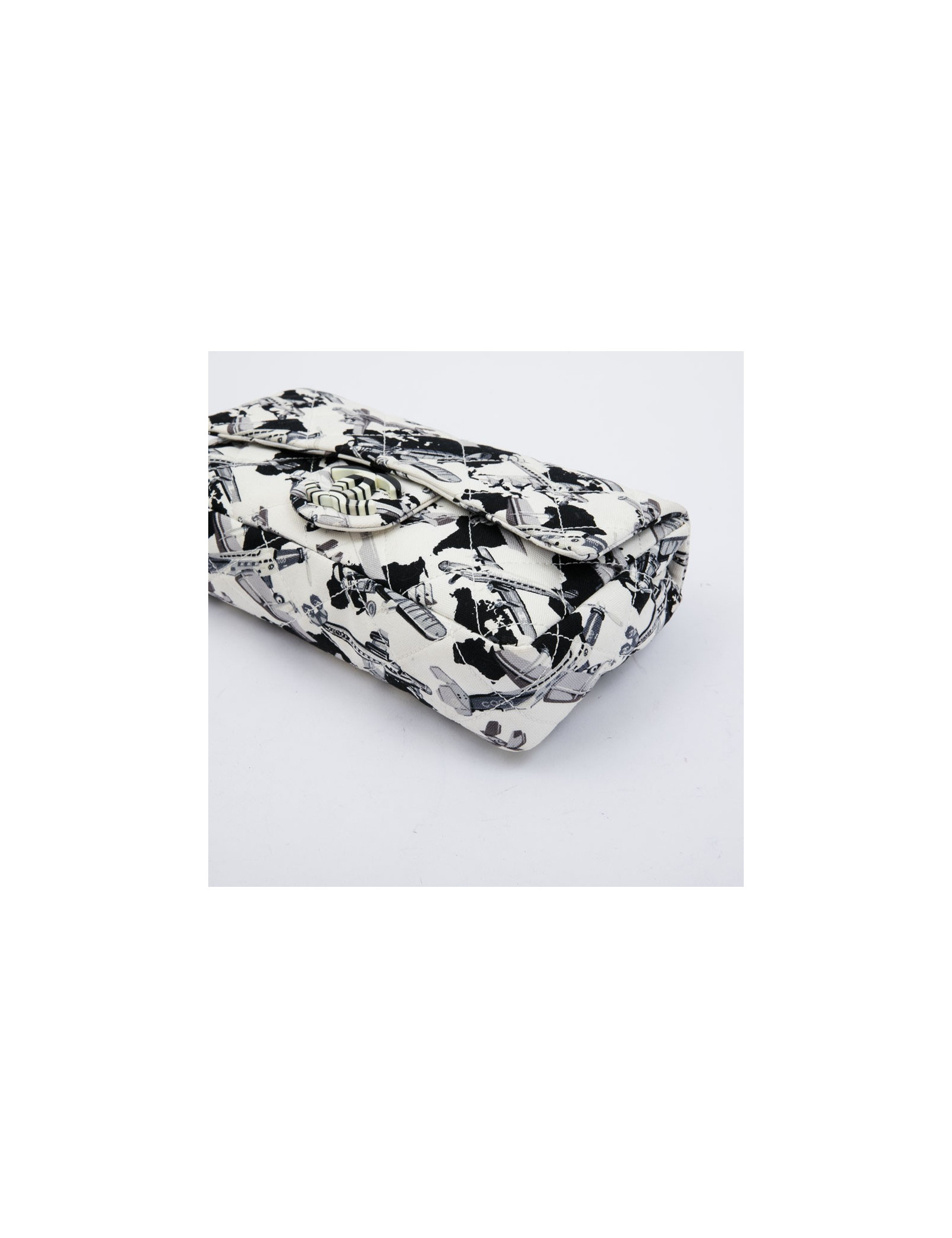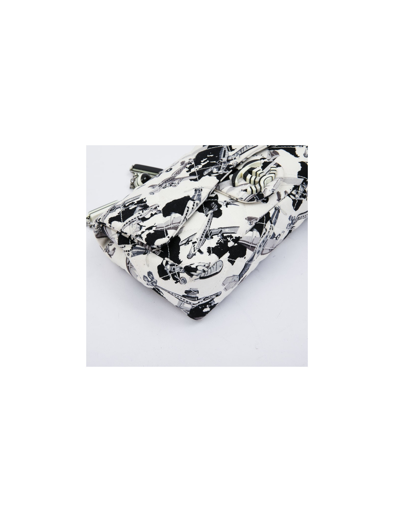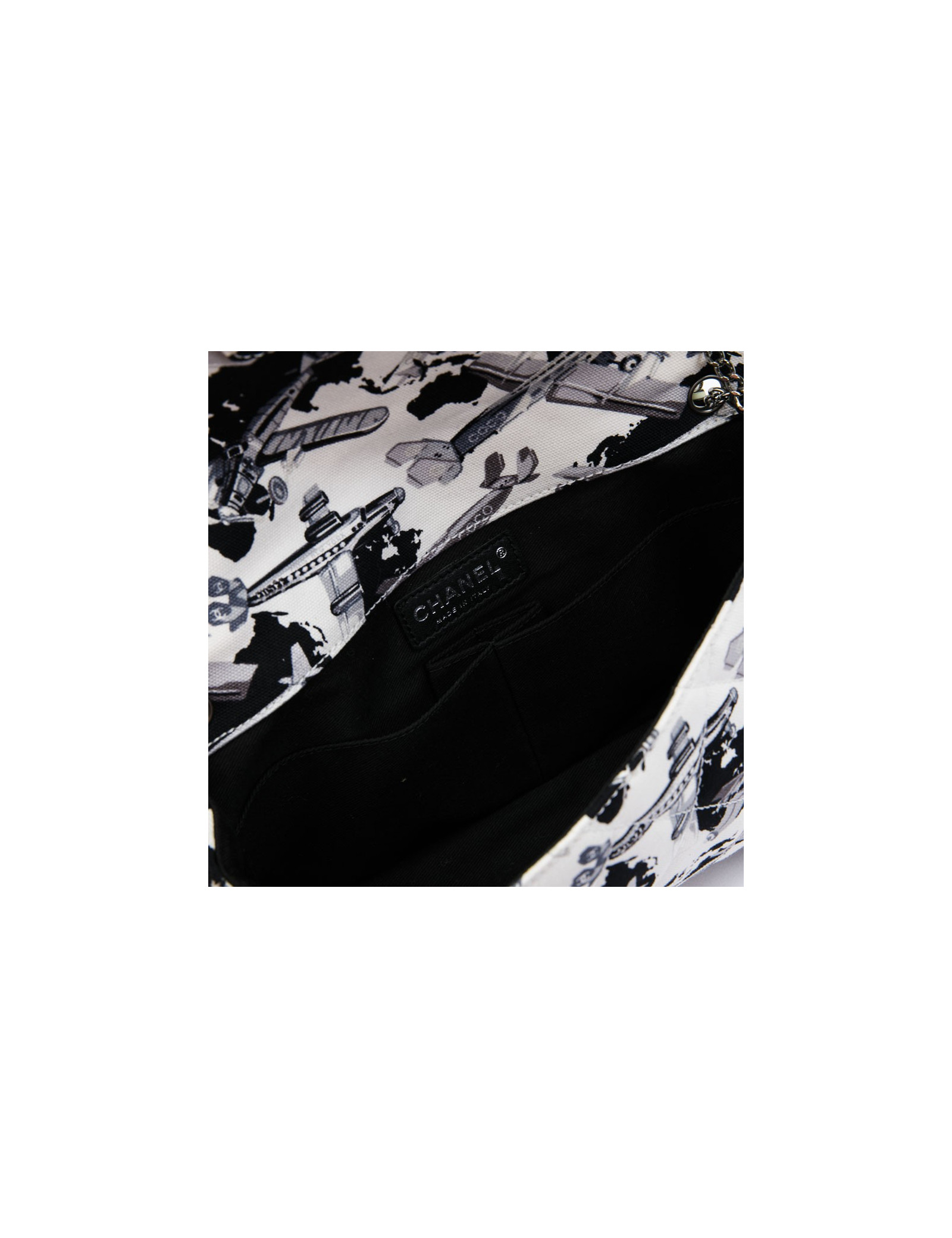 Sac Chanel en toile écrue avec imprimés gris et noirs (avions, continents, ...). Fermoir "CC" en nacre rayée blanche et noire, avec bouton pression. Doublure intérieure en tissu noir disposant de deux poches plates. Poche plate également sur l'arrière du sac