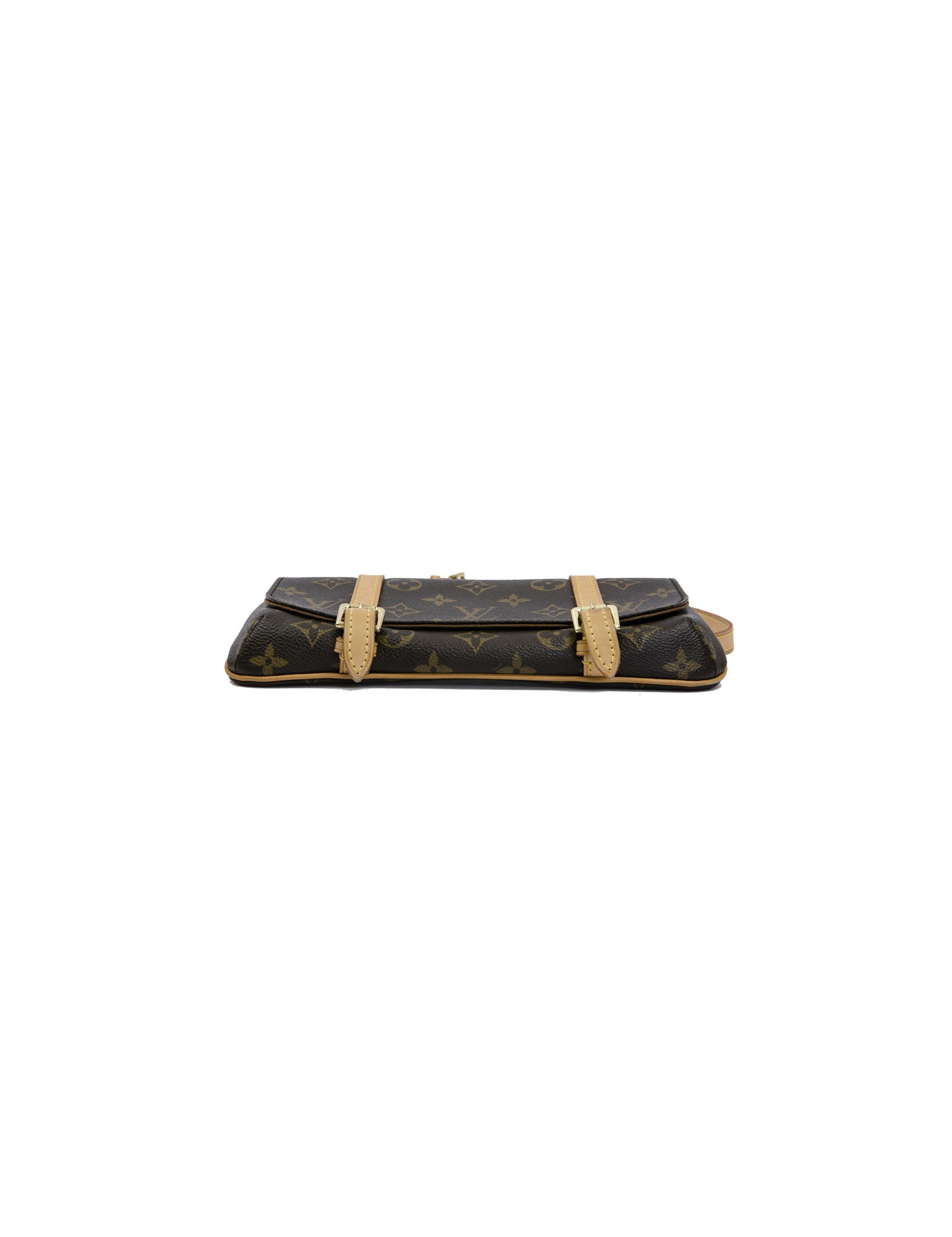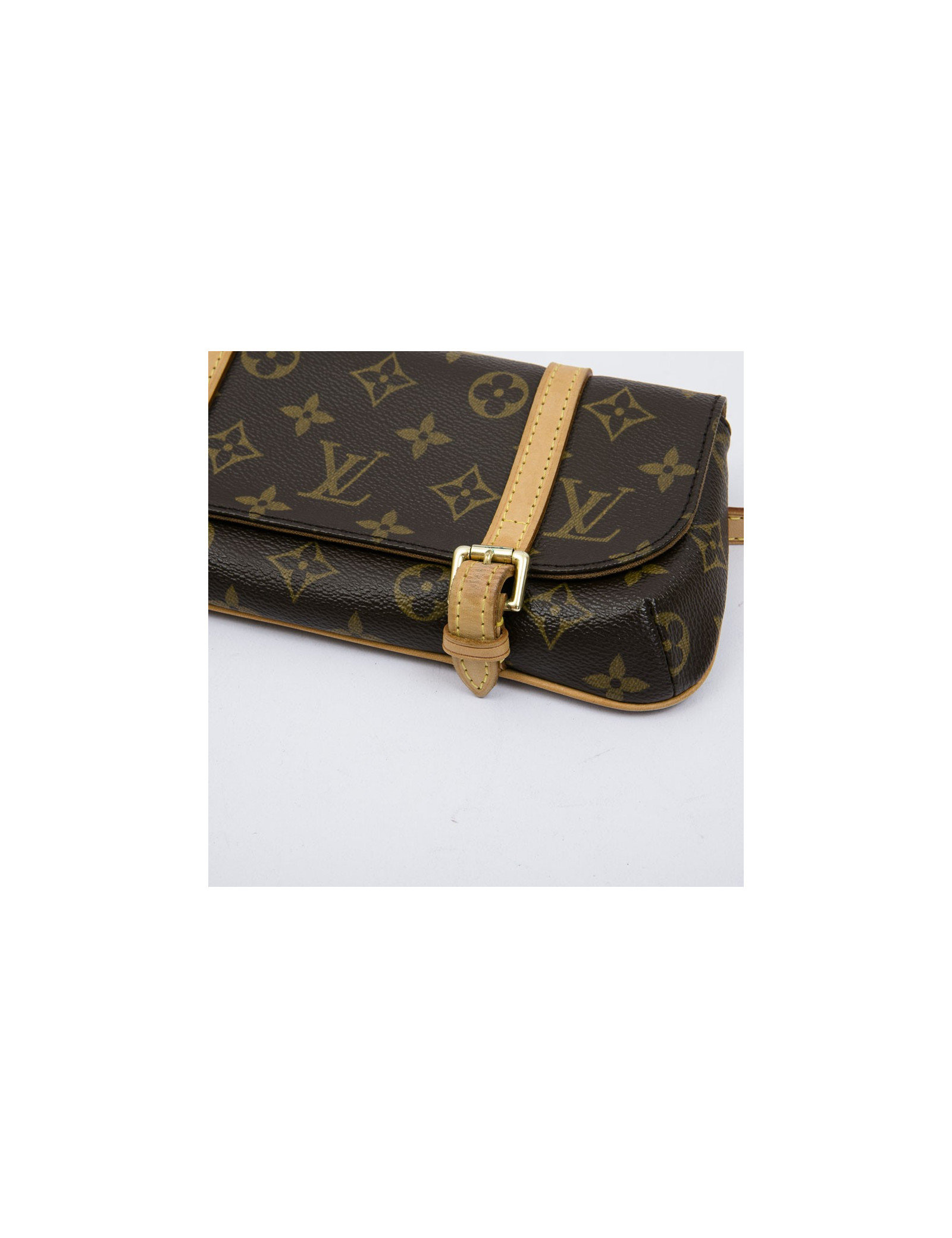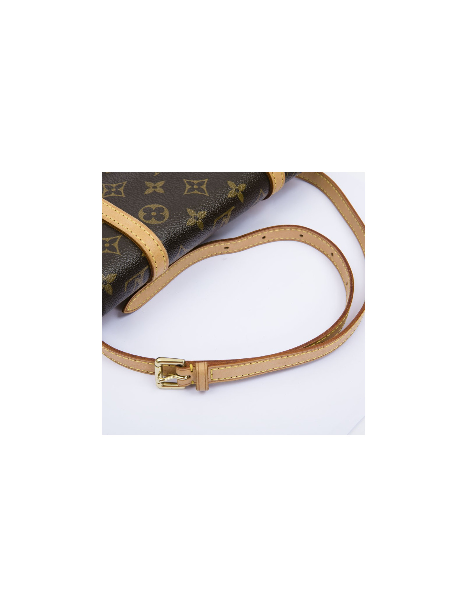 Sac banane/ceinture Louis Vuitton en toile Monogram marron et cuir de vache naturel. Bijouterie dorée. Doublure intérieure en toile de coton marron. Ceinture ajustable et amovible.